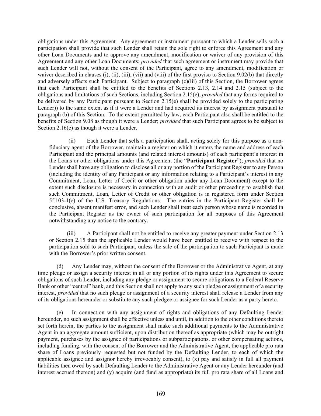 169 obligations under this Agreement. Any agreement or instrument pursuant to which a Lender sells such a participation shall provide that such Lender shall retain the sole right to enforce this Agreement and any other Loan Documents and to approve any amendment, modification or waiver of any provision of this Agreement and any other Loan Documents; provided that such agreement or instrument may provide that such Lender will not, without the consent of the Participant, agree to any amendment, modification or waiver described in clauses (i), (ii), (iii), (vii) and (viii) of the first proviso to Section 9.02(b) that directly and adversely affects such Participant. Subject to paragraph (c)(iii) of this Section, the Borrower agrees that each Participant shall be entitled to the benefits of Sections 2.13, 2.14 and 2.15 (subject to the obligations and limitations of such Sections, including Section 2.15(e), provided that any forms required to be delivered by any Participant pursuant to Section 2.15(e) shall be provided solely to the participating Lender)) to the same extent as if it were a Lender and had acquired its interest by assignment pursuant to paragraph (b) of this Section. To the extent permitted by law, each Participant also shall be entitled to the benefits of Section 9.08 as though it were a Lender; provided that such Participant agrees to be subject to Section 2.16(c) as though it were a Lender. (ii) Each Lender that sells a participation shall, acting solely for this purpose as a non- fiduciary agent of the Borrower, maintain a register on which it enters the name and address of each Participant and the principal amounts (and related interest amounts) of each participant’s interest in the Loans or other obligations under this Agreement (the “Participant Register”); provided that no Lender shall have any obligation to disclose all or any portion of the Participant Register to any Person (including the identity of any Participant or any information relating to a Participant’s interest in any Commitment, Loan, Letter of Credit or other obligation under any Loan Document) except to the extent such disclosure is necessary in connection with an audit or other proceeding to establish that such Commitment, Loan, Letter of Credit or other obligation is in registered form under Section 5f.103-1(c) of the U.S. Treasury Regulations. The entries in the Participant Register shall be conclusive, absent manifest error, and such Lender shall treat each person whose name is recorded in the Participant Register as the owner of such participation for all purposes of this Agreement notwithstanding any notice to the contrary. (iii) A Participant shall not be entitled to receive any greater payment under Section 2.13 or Section 2.15 than the applicable Lender would have been entitled to receive with respect to the participation sold to such Participant, unless the sale of the participation to such Participant is made with the Borrower’s prior written consent. (d) Any Lender may, without the consent of the Borrower or the Administrative Agent, at any time pledge or assign a security interest in all or any portion of its rights under this Agreement to secure obligations of such Lender, including any pledge or assignment to secure obligations to a Federal Reserve Bank or other “central” bank, and this Section shall not apply to any such pledge or assignment of a security interest, provided that no such pledge or assignment of a security interest shall release a Lender from any of its obligations hereunder or substitute any such pledgee or assignee for such Lender as a party hereto. (e) In connection with any assignment of rights and obligations of any Defaulting Lender hereunder, no such assignment shall be effective unless and until, in addition to the other conditions thereto set forth herein, the parties to the assignment shall make such additional payments to the Administrative Agent in an aggregate amount sufficient, upon distribution thereof as appropriate (which may be outright payment, purchases by the assignee of participations or subparticipations, or other compensating actions, including funding, with the consent of the Borrower and the Administrative Agent, the applicable pro rata share of Loans previously requested but not funded by the Defaulting Lender, to each of which the applicable assignee and assignor hereby irrevocably consent), to (x) pay and satisfy in full all payment liabilities then owed by such Defaulting Lender to the Administrative Agent or any Lender hereunder (and interest accrued thereon) and (y) acquire (and fund as appropriate) its full pro rata share of all Loans and