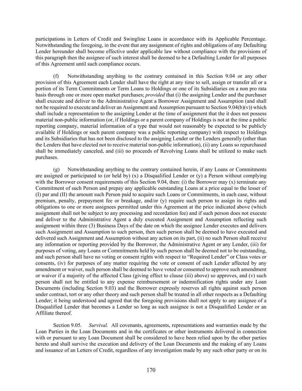 170 participations in Letters of Credit and Swingline Loans in accordance with its Applicable Percentage. Notwithstanding the foregoing, in the event that any assignment of rights and obligations of any Defaulting Lender hereunder shall become effective under applicable law without compliance with the provisions of this paragraph then the assignee of such interest shall be deemed to be a Defaulting Lender for all purposes of this Agreement until such compliance occurs. (f) Notwithstanding anything to the contrary contained in this Section 9.04 or any other provision of this Agreement each Lender shall have the right at any time to sell, assign or transfer all or a portion of its Term Commitments or Term Loans to Holdings or one of its Subsidiaries on a non pro rata basis through one or more open market purchases; provided that (i) the assigning Lender and the purchaser shall execute and deliver to the Administrative Agent a Borrower Assignment and Assumption (and shall not be required to execute and deliver an Assignment and Assumption pursuant to Section 9.04(b)(v)) which shall include a representation to the assigning Lender at the time of assignment that the it does not possess material non-public information (or, if Holdings or a parent company of Holdings is not at the time a public reporting company, material information of a type that would not reasonably be expected to be publicly available if Holdings or such parent company was a public reporting company) with respect to Holdings and its Subsidiaries that has not been disclosed to the assigning Lender or the Lenders generally (other than the Lenders that have elected not to receive material non-public information), (ii) any Loans so repurchased shall be immediately canceled, and (iii) no proceeds of Revolving Loans shall be utilized to make such purchases. (g) Notwithstanding anything to the contrary contained herein, if any Loans or Commitments are assigned or participated to (or held by) (x) a Disqualified Lender or (y) a Person without complying with the Borrower consent requirements of this Section 9.04, then: (i) the Borrower may (x) terminate any Commitment of such Person and prepay any applicable outstanding Loans at a price equal to the lesser of (I) par and (II) the amount such Person paid to acquire such Loans or Commitments, in each case, without premium, penalty, prepayment fee or breakage, and/or (y) require such person to assign its rights and obligations to one or more assignees permitted under this Agreement at the price indicated above (which assignment shall not be subject to any processing and recordation fee) and if such person does not execute and deliver to the Administrative Agent a duly executed Assignment and Assumption reflecting such assignment within three (3) Business Days of the date on which the assignee Lender executes and delivers such Assignment and Assumption to such person, then such person shall be deemed to have executed and delivered such Assignment and Assumption without any action on its part, (ii) no such Person shall receive any information or reporting provided by the Borrower, the Administrative Agent or any Lender, (iii) for purposes of voting, any Loans or Commitments held by such person shall be deemed not to be outstanding, and such person shall have no voting or consent rights with respect to “Required Lender” or Class votes or consents, (iv) for purposes of any matter requiring the vote or consent of each Lender affected by any amendment or waiver, such person shall be deemed to have voted or consented to approve such amendment or waiver if a majority of the affected Class (giving effect to clause (iii) above) so approves, and (v) such person shall not be entitled to any expense reimbursement or indemnification rights under any Loan Documents (including Section 9.03) and the Borrower expressly reserves all rights against such person under contract, tort or any other theory and such person shall be treated in all other respects as a Defaulting Lender; it being understood and agreed that the foregoing provisions shall not apply to any assignee of a Disqualified Lender that becomes a Lender so long as such assignee is not a Disqualified Lender or an Affiliate thereof. Section 9.05. Survival. All covenants, agreements, representations and warranties made by the Loan Parties in the Loan Documents and in the certificates or other instruments delivered in connection with or pursuant to any Loan Document shall be considered to have been relied upon by the other parties hereto and shall survive the execution and delivery of the Loan Documents and the making of any Loans and issuance of an Letters of Credit, regardless of any investigation made by any such other party or on its