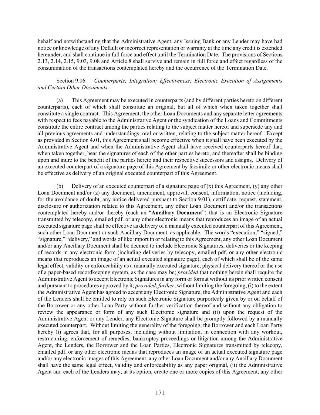 171 behalf and notwithstanding that the Administrative Agent, any Issuing Bank or any Lender may have had notice or knowledge of any Default or incorrect representation or warranty at the time any credit is extended hereunder, and shall continue in full force and effect until the Termination Date. The provisions of Sections 2.13, 2.14, 2.15, 9.03, 9.08 and Article 8 shall survive and remain in full force and effect regardless of the consummation of the transactions contemplated hereby and the occurrence of the Termination Date. Section 9.06. Counterparts; Integration; Effectiveness; Electronic Execution of Assignments and Certain Other Documents. (a) This Agreement may be executed in counterparts (and by different parties hereto on different counterparts), each of which shall constitute an original, but all of which when taken together shall constitute a single contract. This Agreement, the other Loan Documents and any separate letter agreements with respect to fees payable to the Administrative Agent or the syndication of the Loans and Commitments constitute the entire contract among the parties relating to the subject matter hereof and supersede any and all previous agreements and understandings, oral or written, relating to the subject matter hereof. Except as provided in Section 4.01, this Agreement shall become effective when it shall have been executed by the Administrative Agent and when the Administrative Agent shall have received counterparts hereof that, when taken together, bear the signatures of each of the other parties hereto, and thereafter shall be binding upon and inure to the benefit of the parties hereto and their respective successors and assigns. Delivery of an executed counterpart of a signature page of this Agreement by facsimile or other electronic means shall be effective as delivery of an original executed counterpart of this Agreement. (b) Delivery of an executed counterpart of a signature page of (x) this Agreement, (y) any other Loan Document and/or (z) any document, amendment, approval, consent, information, notice (including, for the avoidance of doubt, any notice delivered pursuant to Section 9.01), certificate, request, statement, disclosure or authorization related to this Agreement, any other Loan Document and/or the transactions contemplated hereby and/or thereby (each an “Ancillary Document”) that is an Electronic Signature transmitted by telecopy, emailed pdf. or any other electronic means that reproduces an image of an actual executed signature page shall be effective as delivery of a manually executed counterpart of this Agreement, such other Loan Document or such Ancillary Document, as applicable. The words “execution,” “signed,” “signature,” “delivery,” and words of like import in or relating to this Agreement, any other Loan Document and/or any Ancillary Document shall be deemed to include Electronic Signatures, deliveries or the keeping of records in any electronic form (including deliveries by telecopy, emailed pdf. or any other electronic means that reproduces an image of an actual executed signature page), each of which shall be of the same legal effect, validity or enforceability as a manually executed signature, physical delivery thereof or the use of a paper-based recordkeeping system, as the case may be; provided that nothing herein shall require the Administrative Agent to accept Electronic Signatures in any form or format without its prior written consent and pursuant to procedures approved by it; provided, further, without limiting the foregoing, (i) to the extent the Administrative Agent has agreed to accept any Electronic Signature, the Administrative Agent and each of the Lenders shall be entitled to rely on such Electronic Signature purportedly given by or on behalf of the Borrower or any other Loan Party without further verification thereof and without any obligation to review the appearance or form of any such Electronic signature and (ii) upon the request of the Administrative Agent or any Lender, any Electronic Signature shall be promptly followed by a manually executed counterpart. Without limiting the generality of the foregoing, the Borrower and each Loan Party hereby (i) agrees that, for all purposes, including without limitation, in connection with any workout, restructuring, enforcement of remedies, bankruptcy proceedings or litigation among the Administrative Agent, the Lenders, the Borrower and the Loan Parties, Electronic Signatures transmitted by telecopy, emailed pdf. or any other electronic means that reproduces an image of an actual executed signature page and/or any electronic images of this Agreement, any other Loan Document and/or any Ancillary Document shall have the same legal effect, validity and enforceability as any paper original, (ii) the Administrative Agent and each of the Lenders may, at its option, create one or more copies of this Agreement, any other