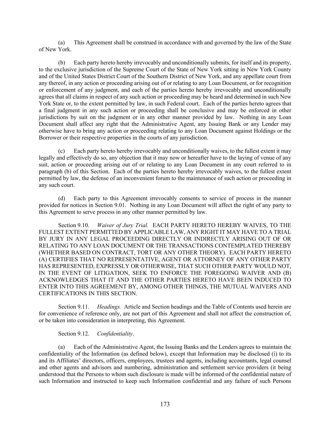 173 (a) This Agreement shall be construed in accordance with and governed by the law of the State of New York. (b) Each party hereto hereby irrevocably and unconditionally submits, for itself and its property, to the exclusive jurisdiction of the Supreme Court of the State of New York sitting in New York County and of the United States District Court of the Southern District of New York, and any appellate court from any thereof, in any action or proceeding arising out of or relating to any Loan Document, or for recognition or enforcement of any judgment, and each of the parties hereto hereby irrevocably and unconditionally agrees that all claims in respect of any such action or proceeding may be heard and determined in such New York State or, to the extent permitted by law, in such Federal court. Each of the parties hereto agrees that a final judgment in any such action or proceeding shall be conclusive and may be enforced in other jurisdictions by suit on the judgment or in any other manner provided by law. Nothing in any Loan Document shall affect any right that the Administrative Agent, any Issuing Bank or any Lender may otherwise have to bring any action or proceeding relating to any Loan Document against Holdings or the Borrower or their respective properties in the courts of any jurisdiction. (c) Each party hereto hereby irrevocably and unconditionally waives, to the fullest extent it may legally and effectively do so, any objection that it may now or hereafter have to the laying of venue of any suit, action or proceeding arising out of or relating to any Loan Document in any court referred to in paragraph (b) of this Section. Each of the parties hereto hereby irrevocably waives, to the fullest extent permitted by law, the defense of an inconvenient forum to the maintenance of such action or proceeding in any such court. (d) Each party to this Agreement irrevocably consents to service of process in the manner provided for notices in Section 9.01. Nothing in any Loan Document will affect the right of any party to this Agreement to serve process in any other manner permitted by law. Section 9.10. Waiver of Jury Trial. EACH PARTY HERETO HEREBY WAIVES, TO THE FULLEST EXTENT PERMITTED BY APPLICABLE LAW, ANY RIGHT IT MAY HAVE TO A TRIAL BY JURY IN ANY LEGAL PROCEEDING DIRECTLY OR INDIRECTLY ARISING OUT OF OR RELATING TO ANY LOAN DOCUMENT OR THE TRANSACTIONS CONTEMPLATED THEREBY (WHETHER BASED ON CONTRACT, TORT OR ANY OTHER THEORY). EACH PARTY HERETO (A) CERTIFIES THAT NO REPRESENTATIVE, AGENT OR ATTORNEY OF ANY OTHER PARTY HAS REPRESENTED, EXPRESSLY OR OTHERWISE, THAT SUCH OTHER PARTY WOULD NOT, IN THE EVENT OF LITIGATION, SEEK TO ENFORCE THE FOREGOING WAIVER AND (B) ACKNOWLEDGES THAT IT AND THE OTHER PARTIES HERETO HAVE BEEN INDUCED TO ENTER INTO THIS AGREEMENT BY, AMONG OTHER THINGS, THE MUTUAL WAIVERS AND CERTIFICATIONS IN THIS SECTION. Section 9.11. Headings. Article and Section headings and the Table of Contents used herein are for convenience of reference only, are not part of this Agreement and shall not affect the construction of, or be taken into consideration in interpreting, this Agreement. Section 9.12. Confidentiality. (a) Each of the Administrative Agent, the Issuing Banks and the Lenders agrees to maintain the confidentiality of the Information (as defined below), except that Information may be disclosed (i) to its and its Affiliates’ directors, officers, employees, trustees and agents, including accountants, legal counsel and other agents and advisors and numbering, administration and settlement service providers (it being understood that the Persons to whom such disclosure is made will be informed of the confidential nature of such Information and instructed to keep such Information confidential and any failure of such Persons