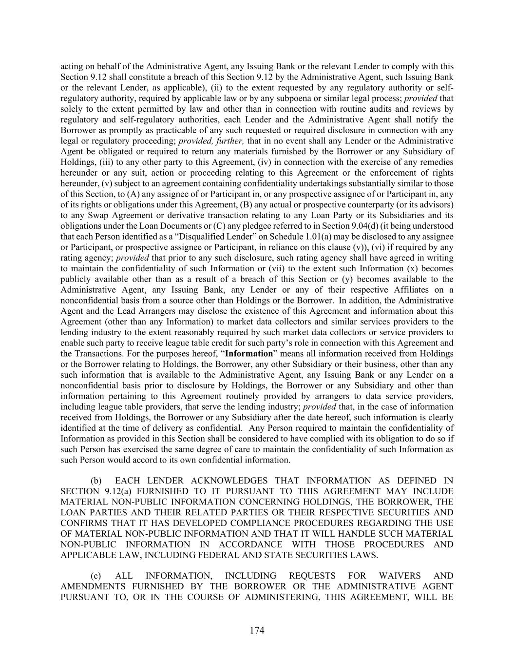 174 acting on behalf of the Administrative Agent, any Issuing Bank or the relevant Lender to comply with this Section 9.12 shall constitute a breach of this Section 9.12 by the Administrative Agent, such Issuing Bank or the relevant Lender, as applicable), (ii) to the extent requested by any regulatory authority or self- regulatory authority, required by applicable law or by any subpoena or similar legal process; provided that solely to the extent permitted by law and other than in connection with routine audits and reviews by regulatory and self-regulatory authorities, each Lender and the Administrative Agent shall notify the Borrower as promptly as practicable of any such requested or required disclosure in connection with any legal or regulatory proceeding; provided, further, that in no event shall any Lender or the Administrative Agent be obligated or required to return any materials furnished by the Borrower or any Subsidiary of Holdings, (iii) to any other party to this Agreement, (iv) in connection with the exercise of any remedies hereunder or any suit, action or proceeding relating to this Agreement or the enforcement of rights hereunder, (v) subject to an agreement containing confidentiality undertakings substantially similar to those of this Section, to (A) any assignee of or Participant in, or any prospective assignee of or Participant in, any of its rights or obligations under this Agreement, (B) any actual or prospective counterparty (or its advisors) to any Swap Agreement or derivative transaction relating to any Loan Party or its Subsidiaries and its obligations under the Loan Documents or (C) any pledgee referred to in Section 9.04(d) (it being understood that each Person identified as a “Disqualified Lender” on Schedule 1.01(a) may be disclosed to any assignee or Participant, or prospective assignee or Participant, in reliance on this clause (v)), (vi) if required by any rating agency; provided that prior to any such disclosure, such rating agency shall have agreed in writing to maintain the confidentiality of such Information or (vii) to the extent such Information (x) becomes publicly available other than as a result of a breach of this Section or (y) becomes available to the Administrative Agent, any Issuing Bank, any Lender or any of their respective Affiliates on a nonconfidential basis from a source other than Holdings or the Borrower. In addition, the Administrative Agent and the Lead Arrangers may disclose the existence of this Agreement and information about this Agreement (other than any Information) to market data collectors and similar services providers to the lending industry to the extent reasonably required by such market data collectors or service providers to enable such party to receive league table credit for such party’s role in connection with this Agreement and the Transactions. For the purposes hereof, “Information” means all information received from Holdings or the Borrower relating to Holdings, the Borrower, any other Subsidiary or their business, other than any such information that is available to the Administrative Agent, any Issuing Bank or any Lender on a nonconfidential basis prior to disclosure by Holdings, the Borrower or any Subsidiary and other than information pertaining to this Agreement routinely provided by arrangers to data service providers, including league table providers, that serve the lending industry; provided that, in the case of information received from Holdings, the Borrower or any Subsidiary after the date hereof, such information is clearly identified at the time of delivery as confidential. Any Person required to maintain the confidentiality of Information as provided in this Section shall be considered to have complied with its obligation to do so if such Person has exercised the same degree of care to maintain the confidentiality of such Information as such Person would accord to its own confidential information. (b) EACH LENDER ACKNOWLEDGES THAT INFORMATION AS DEFINED IN SECTION 9.12(a) FURNISHED TO IT PURSUANT TO THIS AGREEMENT MAY INCLUDE MATERIAL NON-PUBLIC INFORMATION CONCERNING HOLDINGS, THE BORROWER, THE LOAN PARTIES AND THEIR RELATED PARTIES OR THEIR RESPECTIVE SECURITIES AND CONFIRMS THAT IT HAS DEVELOPED COMPLIANCE PROCEDURES REGARDING THE USE OF MATERIAL NON-PUBLIC INFORMATION AND THAT IT WILL HANDLE SUCH MATERIAL NON-PUBLIC INFORMATION IN ACCORDANCE WITH THOSE PROCEDURES AND APPLICABLE LAW, INCLUDING FEDERAL AND STATE SECURITIES LAWS. (c) ALL INFORMATION, INCLUDING REQUESTS FOR WAIVERS AND AMENDMENTS FURNISHED BY THE BORROWER OR THE ADMINISTRATIVE AGENT PURSUANT TO, OR IN THE COURSE OF ADMINISTERING, THIS AGREEMENT, WILL BE