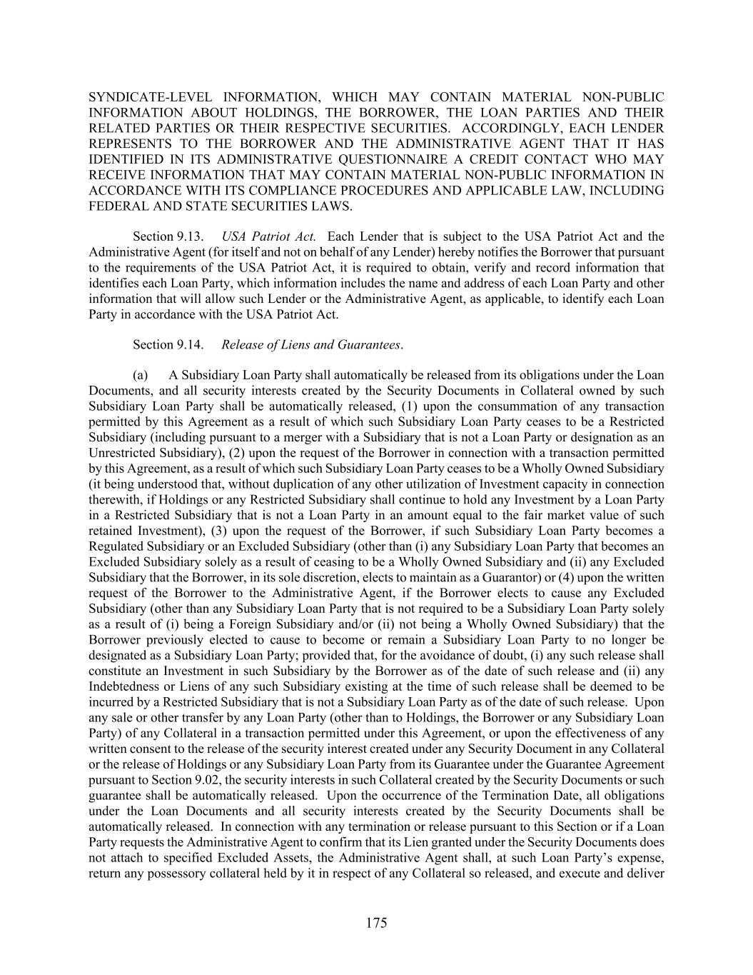 175 SYNDICATE-LEVEL INFORMATION, WHICH MAY CONTAIN MATERIAL NON-PUBLIC INFORMATION ABOUT HOLDINGS, THE BORROWER, THE LOAN PARTIES AND THEIR RELATED PARTIES OR THEIR RESPECTIVE SECURITIES. ACCORDINGLY, EACH LENDER REPRESENTS TO THE BORROWER AND THE ADMINISTRATIVE AGENT THAT IT HAS IDENTIFIED IN ITS ADMINISTRATIVE QUESTIONNAIRE A CREDIT CONTACT WHO MAY RECEIVE INFORMATION THAT MAY CONTAIN MATERIAL NON-PUBLIC INFORMATION IN ACCORDANCE WITH ITS COMPLIANCE PROCEDURES AND APPLICABLE LAW, INCLUDING FEDERAL AND STATE SECURITIES LAWS. Section 9.13. USA Patriot Act. Each Lender that is subject to the USA Patriot Act and the Administrative Agent (for itself and not on behalf of any Lender) hereby notifies the Borrower that pursuant to the requirements of the USA Patriot Act, it is required to obtain, verify and record information that identifies each Loan Party, which information includes the name and address of each Loan Party and other information that will allow such Lender or the Administrative Agent, as applicable, to identify each Loan Party in accordance with the USA Patriot Act. Section 9.14. Release of Liens and Guarantees. (a) A Subsidiary Loan Party shall automatically be released from its obligations under the Loan Documents, and all security interests created by the Security Documents in Collateral owned by such Subsidiary Loan Party shall be automatically released, (1) upon the consummation of any transaction permitted by this Agreement as a result of which such Subsidiary Loan Party ceases to be a Restricted Subsidiary (including pursuant to a merger with a Subsidiary that is not a Loan Party or designation as an Unrestricted Subsidiary), (2) upon the request of the Borrower in connection with a transaction permitted by this Agreement, as a result of which such Subsidiary Loan Party ceases to be a Wholly Owned Subsidiary (it being understood that, without duplication of any other utilization of Investment capacity in connection therewith, if Holdings or any Restricted Subsidiary shall continue to hold any Investment by a Loan Party in a Restricted Subsidiary that is not a Loan Party in an amount equal to the fair market value of such retained Investment), (3) upon the request of the Borrower, if such Subsidiary Loan Party becomes a Regulated Subsidiary or an Excluded Subsidiary (other than (i) any Subsidiary Loan Party that becomes an Excluded Subsidiary solely as a result of ceasing to be a Wholly Owned Subsidiary and (ii) any Excluded Subsidiary that the Borrower, in its sole discretion, elects to maintain as a Guarantor) or (4) upon the written request of the Borrower to the Administrative Agent, if the Borrower elects to cause any Excluded Subsidiary (other than any Subsidiary Loan Party that is not required to be a Subsidiary Loan Party solely as a result of (i) being a Foreign Subsidiary and/or (ii) not being a Wholly Owned Subsidiary) that the Borrower previously elected to cause to become or remain a Subsidiary Loan Party to no longer be designated as a Subsidiary Loan Party; provided that, for the avoidance of doubt, (i) any such release shall constitute an Investment in such Subsidiary by the Borrower as of the date of such release and (ii) any Indebtedness or Liens of any such Subsidiary existing at the time of such release shall be deemed to be incurred by a Restricted Subsidiary that is not a Subsidiary Loan Party as of the date of such release. Upon any sale or other transfer by any Loan Party (other than to Holdings, the Borrower or any Subsidiary Loan Party) of any Collateral in a transaction permitted under this Agreement, or upon the effectiveness of any written consent to the release of the security interest created under any Security Document in any Collateral or the release of Holdings or any Subsidiary Loan Party from its Guarantee under the Guarantee Agreement pursuant to Section 9.02, the security interests in such Collateral created by the Security Documents or such guarantee shall be automatically released. Upon the occurrence of the Termination Date, all obligations under the Loan Documents and all security interests created by the Security Documents shall be automatically released. In connection with any termination or release pursuant to this Section or if a Loan Party requests the Administrative Agent to confirm that its Lien granted under the Security Documents does not attach to specified Excluded Assets, the Administrative Agent shall, at such Loan Party’s expense, return any possessory collateral held by it in respect of any Collateral so released, and execute and deliver
