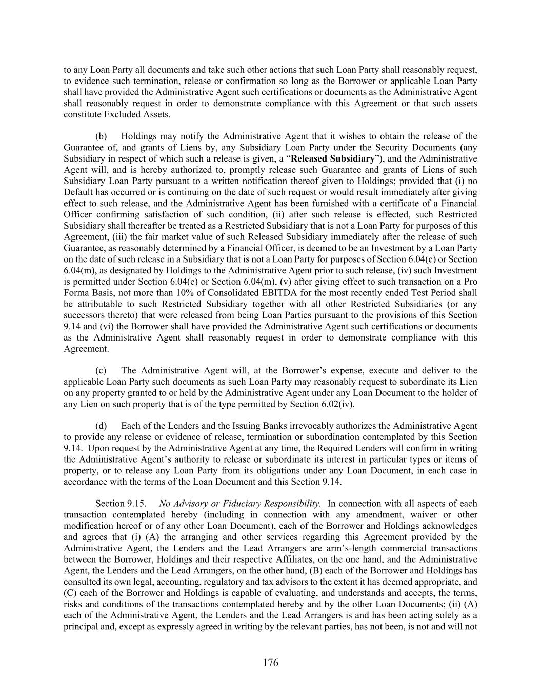 176 to any Loan Party all documents and take such other actions that such Loan Party shall reasonably request, to evidence such termination, release or confirmation so long as the Borrower or applicable Loan Party shall have provided the Administrative Agent such certifications or documents as the Administrative Agent shall reasonably request in order to demonstrate compliance with this Agreement or that such assets constitute Excluded Assets. (b) Holdings may notify the Administrative Agent that it wishes to obtain the release of the Guarantee of, and grants of Liens by, any Subsidiary Loan Party under the Security Documents (any Subsidiary in respect of which such a release is given, a “Released Subsidiary”), and the Administrative Agent will, and is hereby authorized to, promptly release such Guarantee and grants of Liens of such Subsidiary Loan Party pursuant to a written notification thereof given to Holdings; provided that (i) no Default has occurred or is continuing on the date of such request or would result immediately after giving effect to such release, and the Administrative Agent has been furnished with a certificate of a Financial Officer confirming satisfaction of such condition, (ii) after such release is effected, such Restricted Subsidiary shall thereafter be treated as a Restricted Subsidiary that is not a Loan Party for purposes of this Agreement, (iii) the fair market value of such Released Subsidiary immediately after the release of such Guarantee, as reasonably determined by a Financial Officer, is deemed to be an Investment by a Loan Party on the date of such release in a Subsidiary that is not a Loan Party for purposes of Section 6.04(c) or Section 6.04(m), as designated by Holdings to the Administrative Agent prior to such release, (iv) such Investment is permitted under Section 6.04(c) or Section 6.04(m), (v) after giving effect to such transaction on a Pro Forma Basis, not more than 10% of Consolidated EBITDA for the most recently ended Test Period shall be attributable to such Restricted Subsidiary together with all other Restricted Subsidiaries (or any successors thereto) that were released from being Loan Parties pursuant to the provisions of this Section 9.14 and (vi) the Borrower shall have provided the Administrative Agent such certifications or documents as the Administrative Agent shall reasonably request in order to demonstrate compliance with this Agreement. (c) The Administrative Agent will, at the Borrower’s expense, execute and deliver to the applicable Loan Party such documents as such Loan Party may reasonably request to subordinate its Lien on any property granted to or held by the Administrative Agent under any Loan Document to the holder of any Lien on such property that is of the type permitted by Section 6.02(iv). (d) Each of the Lenders and the Issuing Banks irrevocably authorizes the Administrative Agent to provide any release or evidence of release, termination or subordination contemplated by this Section 9.14. Upon request by the Administrative Agent at any time, the Required Lenders will confirm in writing the Administrative Agent’s authority to release or subordinate its interest in particular types or items of property, or to release any Loan Party from its obligations under any Loan Document, in each case in accordance with the terms of the Loan Document and this Section 9.14. Section 9.15. No Advisory or Fiduciary Responsibility. In connection with all aspects of each transaction contemplated hereby (including in connection with any amendment, waiver or other modification hereof or of any other Loan Document), each of the Borrower and Holdings acknowledges and agrees that (i) (A) the arranging and other services regarding this Agreement provided by the Administrative Agent, the Lenders and the Lead Arrangers are arm’s-length commercial transactions between the Borrower, Holdings and their respective Affiliates, on the one hand, and the Administrative Agent, the Lenders and the Lead Arrangers, on the other hand, (B) each of the Borrower and Holdings has consulted its own legal, accounting, regulatory and tax advisors to the extent it has deemed appropriate, and (C) each of the Borrower and Holdings is capable of evaluating, and understands and accepts, the terms, risks and conditions of the transactions contemplated hereby and by the other Loan Documents; (ii) (A) each of the Administrative Agent, the Lenders and the Lead Arrangers is and has been acting solely as a principal and, except as expressly agreed in writing by the relevant parties, has not been, is not and will not