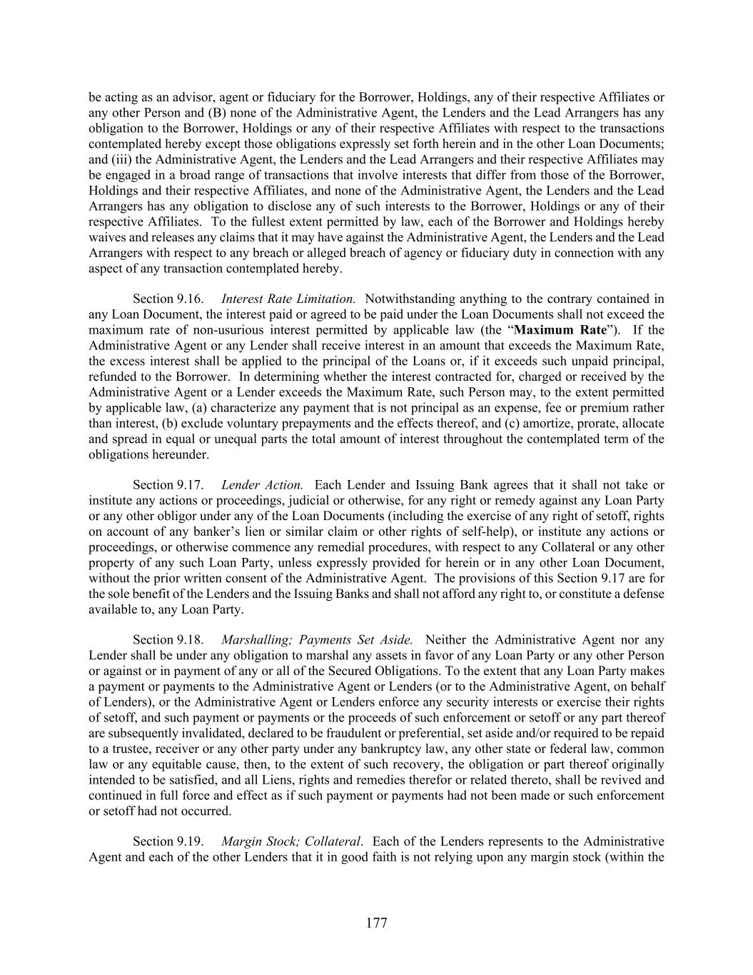177 be acting as an advisor, agent or fiduciary for the Borrower, Holdings, any of their respective Affiliates or any other Person and (B) none of the Administrative Agent, the Lenders and the Lead Arrangers has any obligation to the Borrower, Holdings or any of their respective Affiliates with respect to the transactions contemplated hereby except those obligations expressly set forth herein and in the other Loan Documents; and (iii) the Administrative Agent, the Lenders and the Lead Arrangers and their respective Affiliates may be engaged in a broad range of transactions that involve interests that differ from those of the Borrower, Holdings and their respective Affiliates, and none of the Administrative Agent, the Lenders and the Lead Arrangers has any obligation to disclose any of such interests to the Borrower, Holdings or any of their respective Affiliates. To the fullest extent permitted by law, each of the Borrower and Holdings hereby waives and releases any claims that it may have against the Administrative Agent, the Lenders and the Lead Arrangers with respect to any breach or alleged breach of agency or fiduciary duty in connection with any aspect of any transaction contemplated hereby. Section 9.16. Interest Rate Limitation. Notwithstanding anything to the contrary contained in any Loan Document, the interest paid or agreed to be paid under the Loan Documents shall not exceed the maximum rate of non-usurious interest permitted by applicable law (the “Maximum Rate”). If the Administrative Agent or any Lender shall receive interest in an amount that exceeds the Maximum Rate, the excess interest shall be applied to the principal of the Loans or, if it exceeds such unpaid principal, refunded to the Borrower. In determining whether the interest contracted for, charged or received by the Administrative Agent or a Lender exceeds the Maximum Rate, such Person may, to the extent permitted by applicable law, (a) characterize any payment that is not principal as an expense, fee or premium rather than interest, (b) exclude voluntary prepayments and the effects thereof, and (c) amortize, prorate, allocate and spread in equal or unequal parts the total amount of interest throughout the contemplated term of the obligations hereunder. Section 9.17. Lender Action. Each Lender and Issuing Bank agrees that it shall not take or institute any actions or proceedings, judicial or otherwise, for any right or remedy against any Loan Party or any other obligor under any of the Loan Documents (including the exercise of any right of setoff, rights on account of any banker’s lien or similar claim or other rights of self-help), or institute any actions or proceedings, or otherwise commence any remedial procedures, with respect to any Collateral or any other property of any such Loan Party, unless expressly provided for herein or in any other Loan Document, without the prior written consent of the Administrative Agent. The provisions of this Section 9.17 are for the sole benefit of the Lenders and the Issuing Banks and shall not afford any right to, or constitute a defense available to, any Loan Party. Section 9.18. Marshalling; Payments Set Aside. Neither the Administrative Agent nor any Lender shall be under any obligation to marshal any assets in favor of any Loan Party or any other Person or against or in payment of any or all of the Secured Obligations. To the extent that any Loan Party makes a payment or payments to the Administrative Agent or Lenders (or to the Administrative Agent, on behalf of Lenders), or the Administrative Agent or Lenders enforce any security interests or exercise their rights of setoff, and such payment or payments or the proceeds of such enforcement or setoff or any part thereof are subsequently invalidated, declared to be fraudulent or preferential, set aside and/or required to be repaid to a trustee, receiver or any other party under any bankruptcy law, any other state or federal law, common law or any equitable cause, then, to the extent of such recovery, the obligation or part thereof originally intended to be satisfied, and all Liens, rights and remedies therefor or related thereto, shall be revived and continued in full force and effect as if such payment or payments had not been made or such enforcement or setoff had not occurred. Section 9.19. Margin Stock; Collateral. Each of the Lenders represents to the Administrative Agent and each of the other Lenders that it in good faith is not relying upon any margin stock (within the