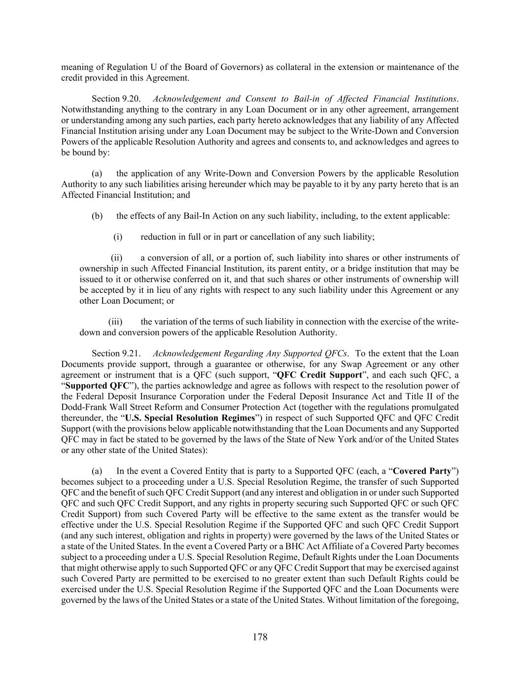 178 meaning of Regulation U of the Board of Governors) as collateral in the extension or maintenance of the credit provided in this Agreement. Section 9.20. Acknowledgement and Consent to Bail-in of Affected Financial Institutions. Notwithstanding anything to the contrary in any Loan Document or in any other agreement, arrangement or understanding among any such parties, each party hereto acknowledges that any liability of any Affected Financial Institution arising under any Loan Document may be subject to the Write-Down and Conversion Powers of the applicable Resolution Authority and agrees and consents to, and acknowledges and agrees to be bound by: (a) the application of any Write-Down and Conversion Powers by the applicable Resolution Authority to any such liabilities arising hereunder which may be payable to it by any party hereto that is an Affected Financial Institution; and (b) the effects of any Bail-In Action on any such liability, including, to the extent applicable: (i) reduction in full or in part or cancellation of any such liability; (ii) a conversion of all, or a portion of, such liability into shares or other instruments of ownership in such Affected Financial Institution, its parent entity, or a bridge institution that may be issued to it or otherwise conferred on it, and that such shares or other instruments of ownership will be accepted by it in lieu of any rights with respect to any such liability under this Agreement or any other Loan Document; or (iii) the variation of the terms of such liability in connection with the exercise of the write- down and conversion powers of the applicable Resolution Authority. Section 9.21. Acknowledgement Regarding Any Supported QFCs. To the extent that the Loan Documents provide support, through a guarantee or otherwise, for any Swap Agreement or any other agreement or instrument that is a QFC (such support, “QFC Credit Support”, and each such QFC, a “Supported QFC”), the parties acknowledge and agree as follows with respect to the resolution power of the Federal Deposit Insurance Corporation under the Federal Deposit Insurance Act and Title II of the Dodd-Frank Wall Street Reform and Consumer Protection Act (together with the regulations promulgated thereunder, the “U.S. Special Resolution Regimes”) in respect of such Supported QFC and QFC Credit Support (with the provisions below applicable notwithstanding that the Loan Documents and any Supported QFC may in fact be stated to be governed by the laws of the State of New York and/or of the United States or any other state of the United States): (a) In the event a Covered Entity that is party to a Supported QFC (each, a “Covered Party”) becomes subject to a proceeding under a U.S. Special Resolution Regime, the transfer of such Supported QFC and the benefit of such QFC Credit Support (and any interest and obligation in or under such Supported QFC and such QFC Credit Support, and any rights in property securing such Supported QFC or such QFC Credit Support) from such Covered Party will be effective to the same extent as the transfer would be effective under the U.S. Special Resolution Regime if the Supported QFC and such QFC Credit Support (and any such interest, obligation and rights in property) were governed by the laws of the United States or a state of the United States. In the event a Covered Party or a BHC Act Affiliate of a Covered Party becomes subject to a proceeding under a U.S. Special Resolution Regime, Default Rights under the Loan Documents that might otherwise apply to such Supported QFC or any QFC Credit Support that may be exercised against such Covered Party are permitted to be exercised to no greater extent than such Default Rights could be exercised under the U.S. Special Resolution Regime if the Supported QFC and the Loan Documents were governed by the laws of the United States or a state of the United States. Without limitation of the foregoing,