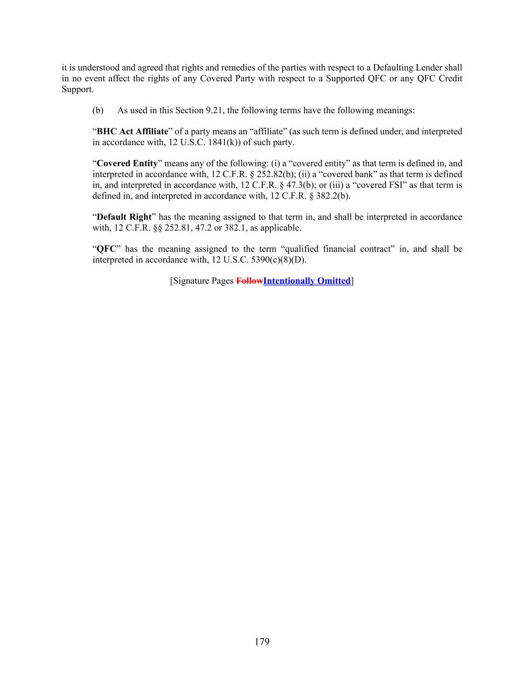 179 it is understood and agreed that rights and remedies of the parties with respect to a Defaulting Lender shall in no event affect the rights of any Covered Party with respect to a Supported QFC or any QFC Credit Support. (b) As used in this Section 9.21, the following terms have the following meanings: “BHC Act Affiliate” of a party means an “affiliate” (as such term is defined under, and interpreted in accordance with, 12 U.S.C. 1841(k)) of such party. “Covered Entity” means any of the following: (i) a “covered entity” as that term is defined in, and interpreted in accordance with, 12 C.F.R. § 252.82(b); (ii) a “covered bank” as that term is defined in, and interpreted in accordance with, 12 C.F.R. § 47.3(b); or (iii) a “covered FSI” as that term is defined in, and interpreted in accordance with, 12 C.F.R. § 382.2(b). “Default Right” has the meaning assigned to that term in, and shall be interpreted in accordance with, 12 C.F.R. §§ 252.81, 47.2 or 382.1, as applicable. “QFC” has the meaning assigned to the term “qualified financial contract” in, and shall be interpreted in accordance with, 12 U.S.C. 5390(c)(8)(D). [Signature Pages FollowIntentionally Omitted]