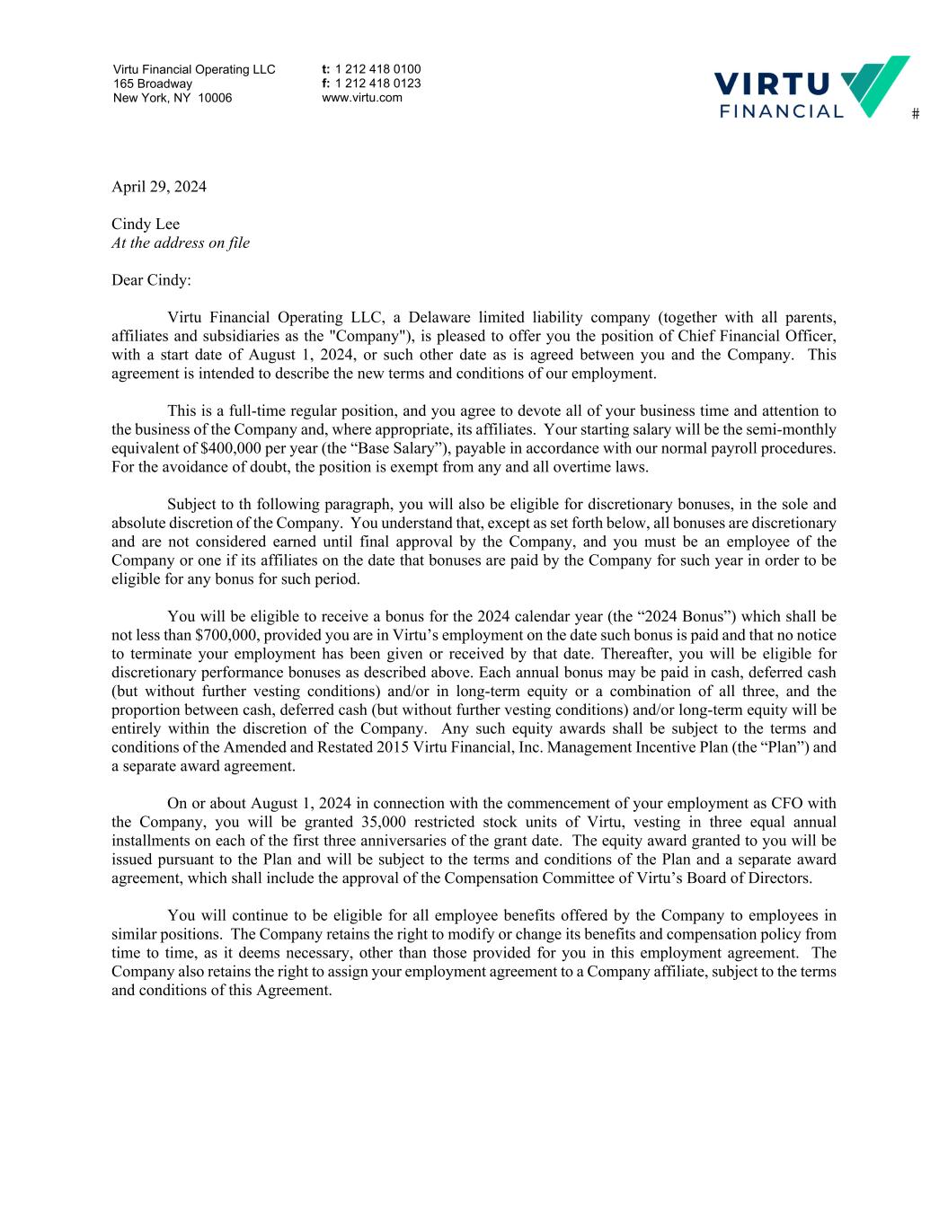 Virtu Financial Operating LLC 165 Broadway New York, NY 10006 t: 1 212 418 0100 f: 1 212 418 0123 www.virtu.com April 29, 2024 Cindy Lee At the address on file Dear Cindy: Virtu Financial Operating LLC, a Delaware limited liability company (together with all parents, affiliates and subsidiaries as the "Company"), is pleased to offer you the position of Chief Financial Officer, with a start date of August 1, 2024, or such other date as is agreed between you and the Company. This agreement is intended to describe the new terms and conditions of our employment. This is a full-time regular position, and you agree to devote all of your business time and attention to the business of the Company and, where appropriate, its affiliates. Your starting salary will be the semi-monthly equivalent of $400,000 per year (the “Base Salary”), payable in accordance with our normal payroll procedures. For the avoidance of doubt, the position is exempt from any and all overtime laws. Subject to th following paragraph, you will also be eligible for discretionary bonuses, in the sole and absolute discretion of the Company. You understand that, except as set forth below, all bonuses are discretionary and are not considered earned until final approval by the Company, and you must be an employee of the Company or one if its affiliates on the date that bonuses are paid by the Company for such year in order to be eligible for any bonus for such period. You will be eligible to receive a bonus for the 2024 calendar year (the “2024 Bonus”) which shall be not less than $700,000, provided you are in Virtu’s employment on the date such bonus is paid and that no notice to terminate your employment has been given or received by that date. Thereafter, you will be eligible for discretionary performance bonuses as described above. Each annual bonus may be paid in cash, deferred cash (but without further vesting conditions) and/or in long-term equity or a combination of all three, and the proportion between cash, deferred cash (but without further vesting conditions) and/or long-term equity will be entirely within the discretion of the Company. Any such equity awards shall be subject to the terms and conditions of the Amended and Restated 2015 Virtu Financial, Inc. Management Incentive Plan (the “Plan”) and a separate award agreement. On or about August 1, 2024 in connection with the commencement of your employment as CFO with the Company, you will be granted 35,000 restricted stock units of Virtu, vesting in three equal annual installments on each of the first three anniversaries of the grant date. The equity award granted to you will be issued pursuant to the Plan and will be subject to the terms and conditions of the Plan and a separate award agreement, which shall include the approval of the Compensation Committee of Virtu’s Board of Directors. You will continue to be eligible for all employee benefits offered by the Company to employees in similar positions. The Company retains the right to modify or change its benefits and compensation policy from time to time, as it deems necessary, other than those provided for you in this employment agreement. The Company also retains the right to assign your employment agreement to a Company affiliate, subject to the terms and conditions of this Agreement.