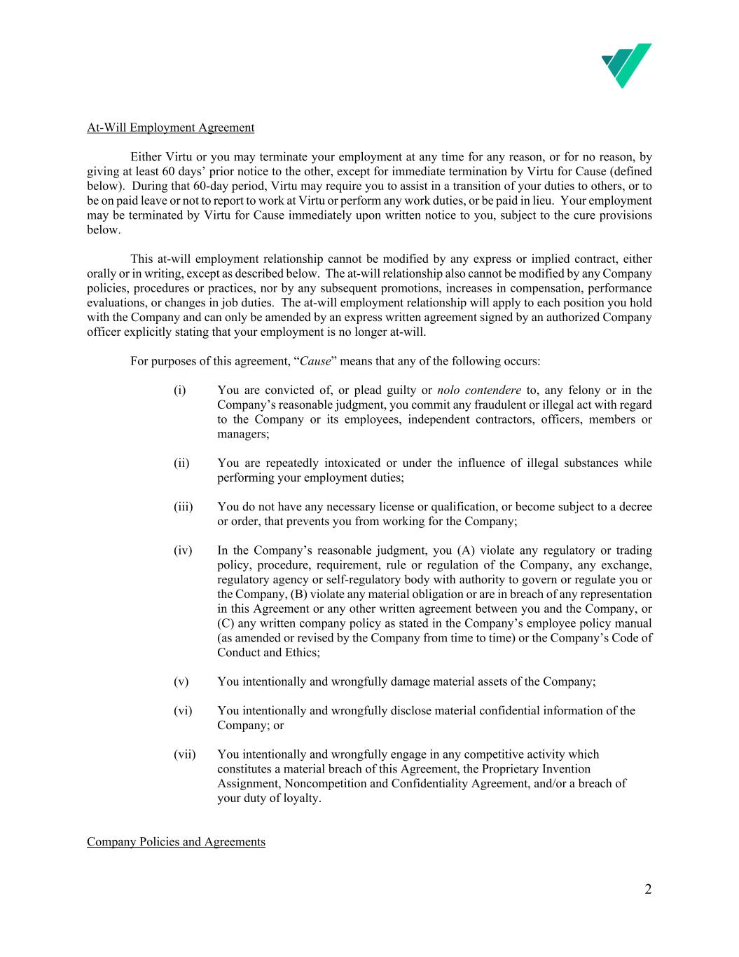 2 At-Will Employment Agreement Either Virtu or you may terminate your employment at any time for any reason, or for no reason, by giving at least 60 days’ prior notice to the other, except for immediate termination by Virtu for Cause (defined below). During that 60-day period, Virtu may require you to assist in a transition of your duties to others, or to be on paid leave or not to report to work at Virtu or perform any work duties, or be paid in lieu. Your employment may be terminated by Virtu for Cause immediately upon written notice to you, subject to the cure provisions below. This at-will employment relationship cannot be modified by any express or implied contract, either orally or in writing, except as described below. The at-will relationship also cannot be modified by any Company policies, procedures or practices, nor by any subsequent promotions, increases in compensation, performance evaluations, or changes in job duties. The at-will employment relationship will apply to each position you hold with the Company and can only be amended by an express written agreement signed by an authorized Company officer explicitly stating that your employment is no longer at-will. For purposes of this agreement, “Cause” means that any of the following occurs: (i) You are convicted of, or plead guilty or nolo contendere to, any felony or in the Company’s reasonable judgment, you commit any fraudulent or illegal act with regard to the Company or its employees, independent contractors, officers, members or managers; (ii) You are repeatedly intoxicated or under the influence of illegal substances while performing your employment duties; (iii) You do not have any necessary license or qualification, or become subject to a decree or order, that prevents you from working for the Company; (iv) In the Company’s reasonable judgment, you (A) violate any regulatory or trading policy, procedure, requirement, rule or regulation of the Company, any exchange, regulatory agency or self-regulatory body with authority to govern or regulate you or the Company, (B) violate any material obligation or are in breach of any representation in this Agreement or any other written agreement between you and the Company, or (C) any written company policy as stated in the Company’s employee policy manual (as amended or revised by the Company from time to time) or the Company’s Code of Conduct and Ethics; (v) You intentionally and wrongfully damage material assets of the Company; (vi) You intentionally and wrongfully disclose material confidential information of the Company; or (vii) You intentionally and wrongfully engage in any competitive activity which constitutes a material breach of this Agreement, the Proprietary Invention Assignment, Noncompetition and Confidentiality Agreement, and/or a breach of your duty of loyalty. Company Policies and Agreements