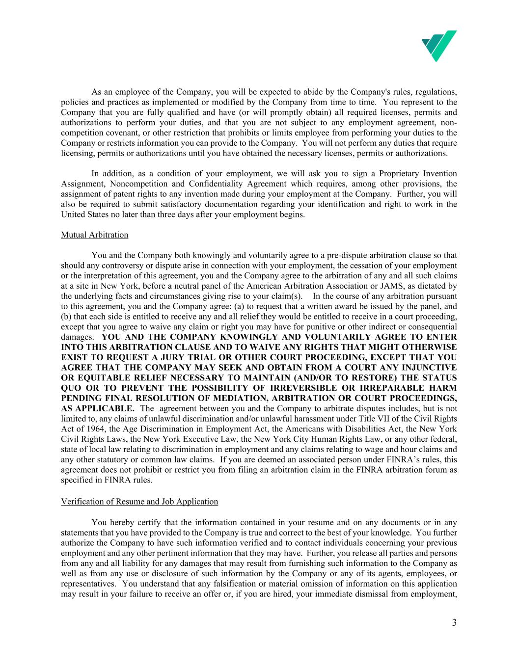 3 As an employee of the Company, you will be expected to abide by the Company's rules, regulations, policies and practices as implemented or modified by the Company from time to time. You represent to the Company that you are fully qualified and have (or will promptly obtain) all required licenses, permits and authorizations to perform your duties, and that you are not subject to any employment agreement, non- competition covenant, or other restriction that prohibits or limits employee from performing your duties to the Company or restricts information you can provide to the Company. You will not perform any duties that require licensing, permits or authorizations until you have obtained the necessary licenses, permits or authorizations. In addition, as a condition of your employment, we will ask you to sign a Proprietary Invention Assignment, Noncompetition and Confidentiality Agreement which requires, among other provisions, the assignment of patent rights to any invention made during your employment at the Company. Further, you will also be required to submit satisfactory documentation regarding your identification and right to work in the United States no later than three days after your employment begins. Mutual Arbitration You and the Company both knowingly and voluntarily agree to a pre-dispute arbitration clause so that should any controversy or dispute arise in connection with your employment, the cessation of your employment or the interpretation of this agreement, you and the Company agree to the arbitration of any and all such claims at a site in New York, before a neutral panel of the American Arbitration Association or JAMS, as dictated by the underlying facts and circumstances giving rise to your claim(s). In the course of any arbitration pursuant to this agreement, you and the Company agree: (a) to request that a written award be issued by the panel, and (b) that each side is entitled to receive any and all relief they would be entitled to receive in a court proceeding, except that you agree to waive any claim or right you may have for punitive or other indirect or consequential damages. YOU AND THE COMPANY KNOWINGLY AND VOLUNTARILY AGREE TO ENTER INTO THIS ARBITRATION CLAUSE AND TO WAIVE ANY RIGHTS THAT MIGHT OTHERWISE EXIST TO REQUEST A JURY TRIAL OR OTHER COURT PROCEEDING, EXCEPT THAT YOU AGREE THAT THE COMPANY MAY SEEK AND OBTAIN FROM A COURT ANY INJUNCTIVE OR EQUITABLE RELIEF NECESSARY TO MAINTAIN (AND/OR TO RESTORE) THE STATUS QUO OR TO PREVENT THE POSSIBILITY OF IRREVERSIBLE OR IRREPARABLE HARM PENDING FINAL RESOLUTION OF MEDIATION, ARBITRATION OR COURT PROCEEDINGS, AS APPLICABLE. The agreement between you and the Company to arbitrate disputes includes, but is not limited to, any claims of unlawful discrimination and/or unlawful harassment under Title VII of the Civil Rights Act of 1964, the Age Discrimination in Employment Act, the Americans with Disabilities Act, the New York Civil Rights Laws, the New York Executive Law, the New York City Human Rights Law, or any other federal, state of local law relating to discrimination in employment and any claims relating to wage and hour claims and any other statutory or common law claims. If you are deemed an associated person under FINRA’s rules, this agreement does not prohibit or restrict you from filing an arbitration claim in the FINRA arbitration forum as specified in FINRA rules. Verification of Resume and Job Application You hereby certify that the information contained in your resume and on any documents or in any statements that you have provided to the Company is true and correct to the best of your knowledge. You further authorize the Company to have such information verified and to contact individuals concerning your previous employment and any other pertinent information that they may have. Further, you release all parties and persons from any and all liability for any damages that may result from furnishing such information to the Company as well as from any use or disclosure of such information by the Company or any of its agents, employees, or representatives. You understand that any falsification or material omission of information on this application may result in your failure to receive an offer or, if you are hired, your immediate dismissal from employment,