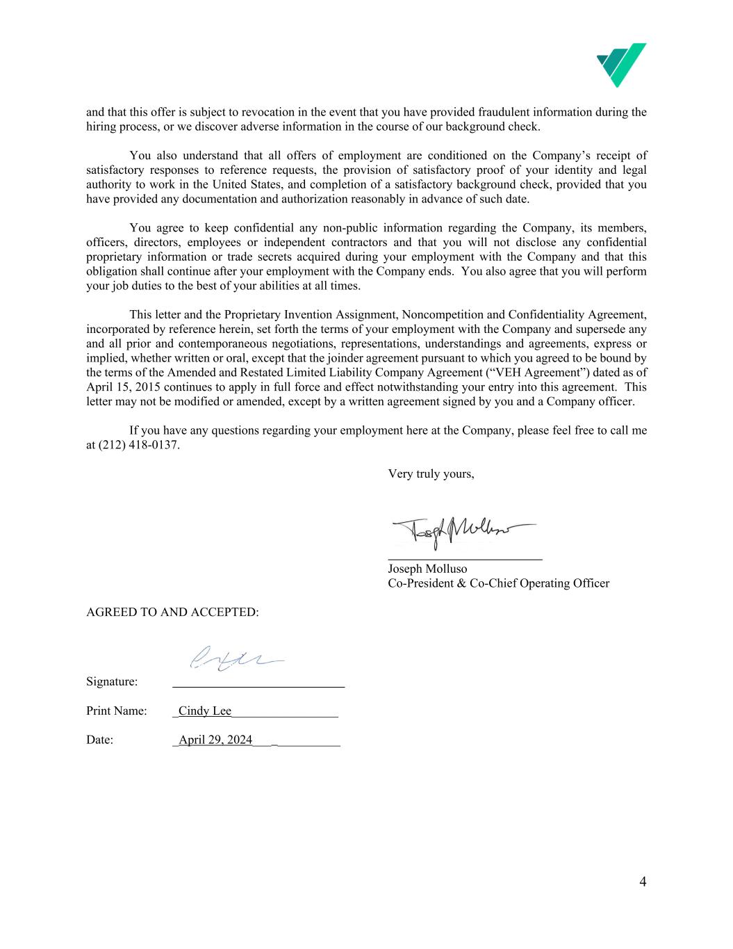 4 and that this offer is subject to revocation in the event that you have provided fraudulent information during the hiring process, or we discover adverse information in the course of our background check. You also understand that all offers of employment are conditioned on the Company’s receipt of satisfactory responses to reference requests, the provision of satisfactory proof of your identity and legal authority to work in the United States, and completion of a satisfactory background check, provided that you have provided any documentation and authorization reasonably in advance of such date. You agree to keep confidential any non-public information regarding the Company, its members, officers, directors, employees or independent contractors and that you will not disclose any confidential proprietary information or trade secrets acquired during your employment with the Company and that this obligation shall continue after your employment with the Company ends. You also agree that you will perform your job duties to the best of your abilities at all times. This letter and the Proprietary Invention Assignment, Noncompetition and Confidentiality Agreement, incorporated by reference herein, set forth the terms of your employment with the Company and supersede any and all prior and contemporaneous negotiations, representations, understandings and agreements, express or implied, whether written or oral, except that the joinder agreement pursuant to which you agreed to be bound by the terms of the Amended and Restated Limited Liability Company Agreement (“VEH Agreement”) dated as of April 15, 2015 continues to apply in full force and effect notwithstanding your entry into this agreement. This letter may not be modified or amended, except by a written agreement signed by you and a Company officer. If you have any questions regarding your employment here at the Company, please feel free to call me at (212) 418-0137. Very truly yours, Joseph Molluso Co-President & Co-Chief Operating Officer AGREED TO AND ACCEPTED: Signature: Print Name: _Cindy Lee_________________ Date: _April 29, 2024___ __________