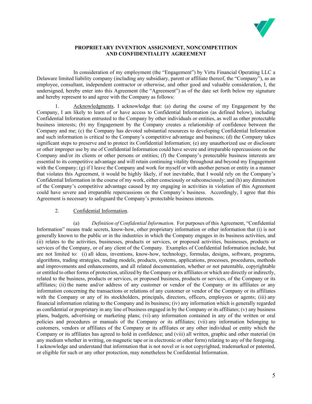 5 PROPRIETARY INVENTION ASSIGNMENT, NONCOMPETITION AND CONFIDENTIALITY AGREEMENT In consideration of my employment (the “Engagement”) by Virtu Financial Operating LLC a Delaware limited liability company (including any subsidiary, parent or affiliate thereof, the “Company”), as an employee, consultant, independent contractor or otherwise, and other good and valuable consideration, I, the undersigned, hereby enter into this Agreement (the “Agreement”) as of the date set forth below my signature and hereby represent to and agree with the Company as follows: 1. Acknowledgments. I acknowledge that: (a) during the course of my Engagement by the Company, I am likely to learn of or have access to Confidential Information (as defined below), including Confidential Information entrusted to the Company by other individuals or entities, as well as other protectable business interests; (b) my Engagement by the Company creates a relationship of confidence between the Company and me; (c) the Company has devoted substantial resources to developing Confidential Information and such information is critical to the Company’s competitive advantage and business; (d) the Company takes significant steps to preserve and to protect its Confidential Information; (e) any unauthorized use or disclosure or other improper use by me of Confidential Information could have severe and irreparable repercussions on the Company and/or its clients or other persons or entities; (f) the Company’s protectable business interests are essential to its competitive advantage and will retain continuing vitality throughout and beyond my Engagement with the Company; (g) if I leave the Company and work for myself or with another person or entity in a manner that violates this Agreement, it would be highly likely, if not inevitable, that I would rely on the Company’s Confidential Information in the course of my work, either consciously or subconsciously; and (h) any diminution of the Company’s competitive advantage caused by my engaging in activities in violation of this Agreement could have severe and irreparable repercussions on the Company’s business. Accordingly, I agree that this Agreement is necessary to safeguard the Company’s protectable business interests. 2. Confidential Information. (a) Definition of Confidential Information. For purposes of this Agreement, “Confidential Information” means trade secrets, know-how, other proprietary information or other information that (i) is not generally known to the public or in the industries in which the Company engages in its business activities, and (ii) relates to the activities, businesses, products or services, or proposed activities, businesses, products or services of the Company, or of any client of the Company. Examples of Confidential Information include, but are not limited to: (i) all ideas, inventions, know-how, technology, formulas, designs, software, programs, algorithms, trading strategies, trading models, products, systems, applications, processes, procedures, methods and improvements and enhancements, and all related documentation, whether or not patentable, copyrightable or entitled to other forms of protection, utilized by the Company or its affiliates or which are directly or indirectly, related to the business, products or services, or proposed business, products or services, of the Company or its affiliates; (ii) the name and/or address of any customer or vendor of the Company or its affiliates or any information concerning the transactions or relations of any customer or vendor of the Company or its affiliates with the Company or any of its stockholders, principals, directors, officers, employees or agents; (iii) any financial information relating to the Company and its business; (iv) any information which is generally regarded as confidential or proprietary in any line of business engaged in by the Company or its affiliates; (v) any business plans, budgets, advertising or marketing plans; (vi) any information contained in any of the written or oral policies and procedures or manuals of the Company or its affiliates; (vii) any information belonging to customers, vendors or affiliates of the Company or its affiliates or any other individual or entity which the Company or its affiliates has agreed to hold in confidence; and (viii) all written, graphic and other material (in any medium whether in writing, on magnetic tape or in electronic or other form) relating to any of the foregoing. I acknowledge and understand that information that is not novel or is not copyrighted, trademarked or patented, or eligible for such or any other protection, may nonetheless be Confidential Information.
