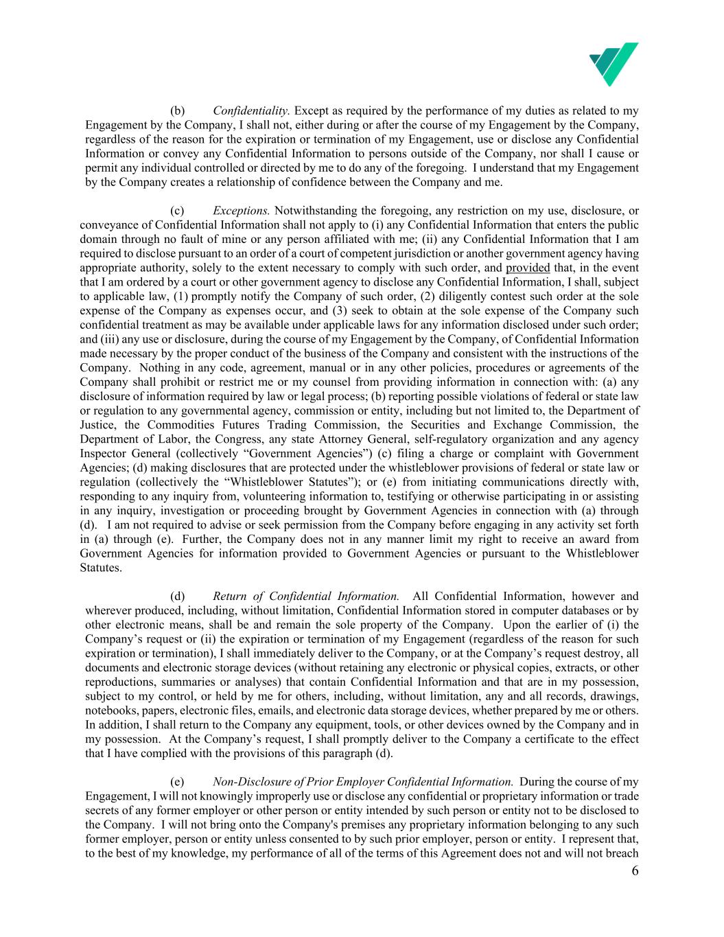 6 (b) Confidentiality. Except as required by the performance of my duties as related to my Engagement by the Company, I shall not, either during or after the course of my Engagement by the Company, regardless of the reason for the expiration or termination of my Engagement, use or disclose any Confidential Information or convey any Confidential Information to persons outside of the Company, nor shall I cause or permit any individual controlled or directed by me to do any of the foregoing. I understand that my Engagement by the Company creates a relationship of confidence between the Company and me. (c) Exceptions. Notwithstanding the foregoing, any restriction on my use, disclosure, or conveyance of Confidential Information shall not apply to (i) any Confidential Information that enters the public domain through no fault of mine or any person affiliated with me; (ii) any Confidential Information that I am required to disclose pursuant to an order of a court of competent jurisdiction or another government agency having appropriate authority, solely to the extent necessary to comply with such order, and provided that, in the event that I am ordered by a court or other government agency to disclose any Confidential Information, I shall, subject to applicable law, (1) promptly notify the Company of such order, (2) diligently contest such order at the sole expense of the Company as expenses occur, and (3) seek to obtain at the sole expense of the Company such confidential treatment as may be available under applicable laws for any information disclosed under such order; and (iii) any use or disclosure, during the course of my Engagement by the Company, of Confidential Information made necessary by the proper conduct of the business of the Company and consistent with the instructions of the Company. Nothing in any code, agreement, manual or in any other policies, procedures or agreements of the Company shall prohibit or restrict me or my counsel from providing information in connection with: (a) any disclosure of information required by law or legal process; (b) reporting possible violations of federal or state law or regulation to any governmental agency, commission or entity, including but not limited to, the Department of Justice, the Commodities Futures Trading Commission, the Securities and Exchange Commission, the Department of Labor, the Congress, any state Attorney General, self-regulatory organization and any agency Inspector General (collectively “Government Agencies”) (c) filing a charge or complaint with Government Agencies; (d) making disclosures that are protected under the whistleblower provisions of federal or state law or regulation (collectively the “Whistleblower Statutes”); or (e) from initiating communications directly with, responding to any inquiry from, volunteering information to, testifying or otherwise participating in or assisting in any inquiry, investigation or proceeding brought by Government Agencies in connection with (a) through (d). I am not required to advise or seek permission from the Company before engaging in any activity set forth in (a) through (e). Further, the Company does not in any manner limit my right to receive an award from Government Agencies for information provided to Government Agencies or pursuant to the Whistleblower Statutes. (d) Return of Confidential Information. All Confidential Information, however and wherever produced, including, without limitation, Confidential Information stored in computer databases or by other electronic means, shall be and remain the sole property of the Company. Upon the earlier of (i) the Company’s request or (ii) the expiration or termination of my Engagement (regardless of the reason for such expiration or termination), I shall immediately deliver to the Company, or at the Company’s request destroy, all documents and electronic storage devices (without retaining any electronic or physical copies, extracts, or other reproductions, summaries or analyses) that contain Confidential Information and that are in my possession, subject to my control, or held by me for others, including, without limitation, any and all records, drawings, notebooks, papers, electronic files, emails, and electronic data storage devices, whether prepared by me or others. In addition, I shall return to the Company any equipment, tools, or other devices owned by the Company and in my possession. At the Company’s request, I shall promptly deliver to the Company a certificate to the effect that I have complied with the provisions of this paragraph (d). (e) Non-Disclosure of Prior Employer Confidential Information. During the course of my Engagement, I will not knowingly improperly use or disclose any confidential or proprietary information or trade secrets of any former employer or other person or entity intended by such person or entity not to be disclosed to the Company. I will not bring onto the Company's premises any proprietary information belonging to any such former employer, person or entity unless consented to by such prior employer, person or entity. I represent that, to the best of my knowledge, my performance of all of the terms of this Agreement does not and will not breach