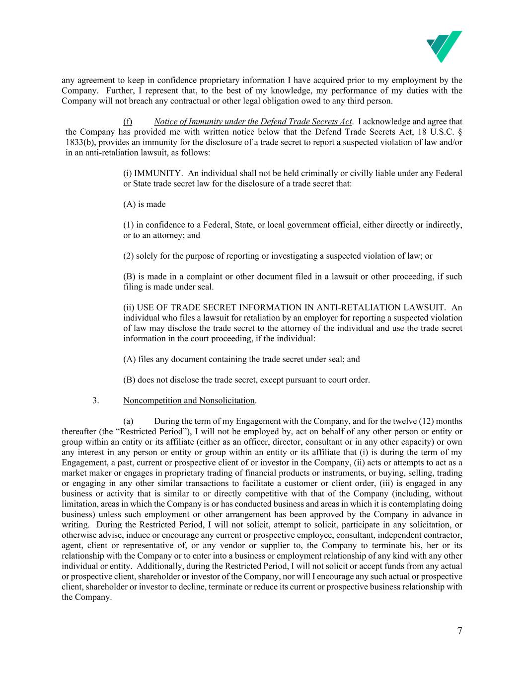 7 any agreement to keep in confidence proprietary information I have acquired prior to my employment by the Company. Further, I represent that, to the best of my knowledge, my performance of my duties with the Company will not breach any contractual or other legal obligation owed to any third person. (f) Notice of Immunity under the Defend Trade Secrets Act. I acknowledge and agree that the Company has provided me with written notice below that the Defend Trade Secrets Act, 18 U.S.C. § 1833(b), provides an immunity for the disclosure of a trade secret to report a suspected violation of law and/or in an anti-retaliation lawsuit, as follows: (i) IMMUNITY. An individual shall not be held criminally or civilly liable under any Federal or State trade secret law for the disclosure of a trade secret that: (A) is made (1) in confidence to a Federal, State, or local government official, either directly or indirectly, or to an attorney; and (2) solely for the purpose of reporting or investigating a suspected violation of law; or (B) is made in a complaint or other document filed in a lawsuit or other proceeding, if such filing is made under seal. (ii) USE OF TRADE SECRET INFORMATION IN ANTI-RETALIATION LAWSUIT. An individual who files a lawsuit for retaliation by an employer for reporting a suspected violation of law may disclose the trade secret to the attorney of the individual and use the trade secret information in the court proceeding, if the individual: (A) files any document containing the trade secret under seal; and (B) does not disclose the trade secret, except pursuant to court order. 3. Noncompetition and Nonsolicitation. (a) During the term of my Engagement with the Company, and for the twelve (12) months thereafter (the “Restricted Period”), I will not be employed by, act on behalf of any other person or entity or group within an entity or its affiliate (either as an officer, director, consultant or in any other capacity) or own any interest in any person or entity or group within an entity or its affiliate that (i) is during the term of my Engagement, a past, current or prospective client of or investor in the Company, (ii) acts or attempts to act as a market maker or engages in proprietary trading of financial products or instruments, or buying, selling, trading or engaging in any other similar transactions to facilitate a customer or client order, (iii) is engaged in any business or activity that is similar to or directly competitive with that of the Company (including, without limitation, areas in which the Company is or has conducted business and areas in which it is contemplating doing business) unless such employment or other arrangement has been approved by the Company in advance in writing. During the Restricted Period, I will not solicit, attempt to solicit, participate in any solicitation, or otherwise advise, induce or encourage any current or prospective employee, consultant, independent contractor, agent, client or representative of, or any vendor or supplier to, the Company to terminate his, her or its relationship with the Company or to enter into a business or employment relationship of any kind with any other individual or entity. Additionally, during the Restricted Period, I will not solicit or accept funds from any actual or prospective client, shareholder or investor of the Company, nor will I encourage any such actual or prospective client, shareholder or investor to decline, terminate or reduce its current or prospective business relationship with the Company.