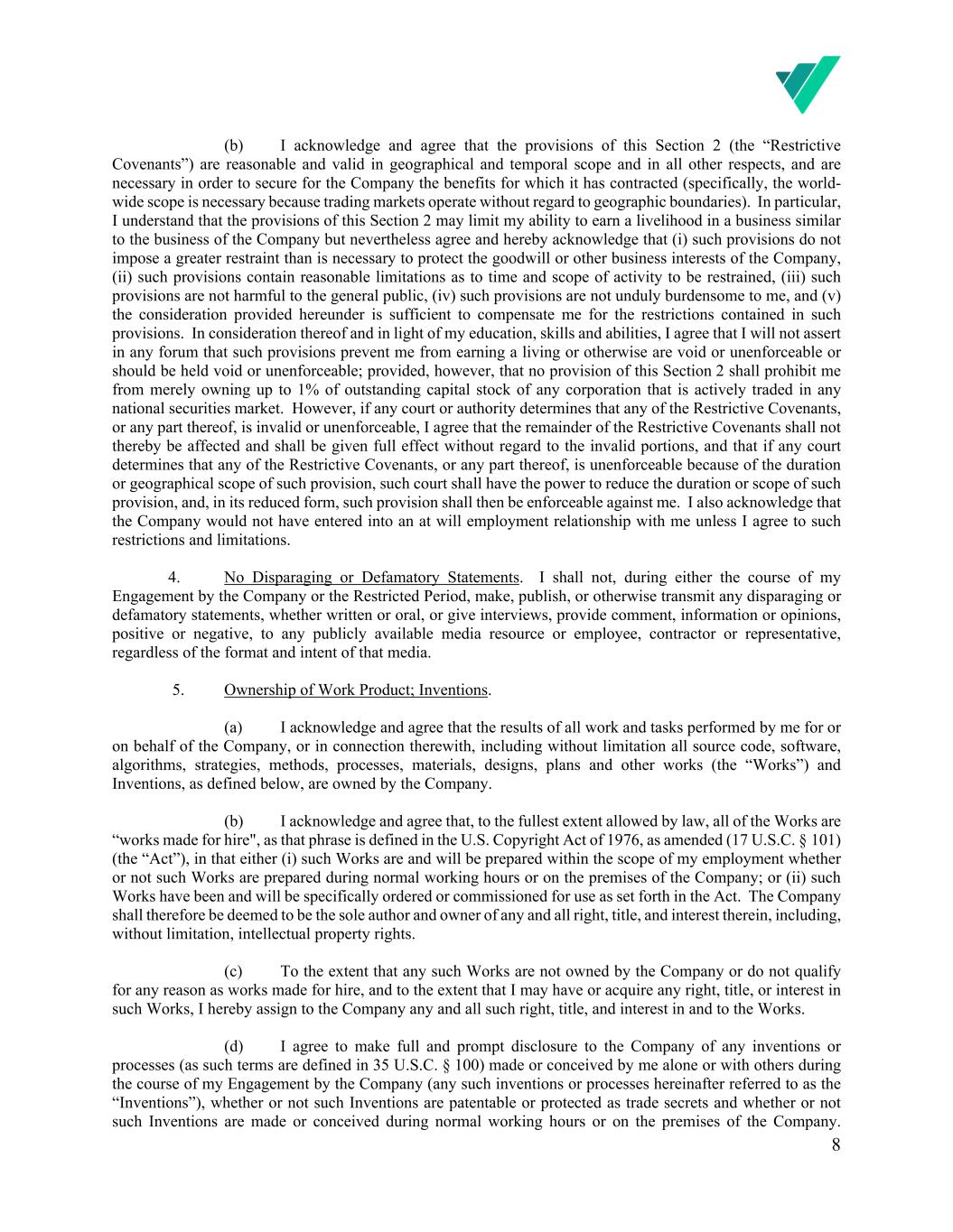 8 (b) I acknowledge and agree that the provisions of this Section 2 (the “Restrictive Covenants”) are reasonable and valid in geographical and temporal scope and in all other respects, and are necessary in order to secure for the Company the benefits for which it has contracted (specifically, the world- wide scope is necessary because trading markets operate without regard to geographic boundaries). In particular, I understand that the provisions of this Section 2 may limit my ability to earn a livelihood in a business similar to the business of the Company but nevertheless agree and hereby acknowledge that (i) such provisions do not impose a greater restraint than is necessary to protect the goodwill or other business interests of the Company, (ii) such provisions contain reasonable limitations as to time and scope of activity to be restrained, (iii) such provisions are not harmful to the general public, (iv) such provisions are not unduly burdensome to me, and (v) the consideration provided hereunder is sufficient to compensate me for the restrictions contained in such provisions. In consideration thereof and in light of my education, skills and abilities, I agree that I will not assert in any forum that such provisions prevent me from earning a living or otherwise are void or unenforceable or should be held void or unenforceable; provided, however, that no provision of this Section 2 shall prohibit me from merely owning up to 1% of outstanding capital stock of any corporation that is actively traded in any national securities market. However, if any court or authority determines that any of the Restrictive Covenants, or any part thereof, is invalid or unenforceable, I agree that the remainder of the Restrictive Covenants shall not thereby be affected and shall be given full effect without regard to the invalid portions, and that if any court determines that any of the Restrictive Covenants, or any part thereof, is unenforceable because of the duration or geographical scope of such provision, such court shall have the power to reduce the duration or scope of such provision, and, in its reduced form, such provision shall then be enforceable against me. I also acknowledge that the Company would not have entered into an at will employment relationship with me unless I agree to such restrictions and limitations. 4. No Disparaging or Defamatory Statements. I shall not, during either the course of my Engagement by the Company or the Restricted Period, make, publish, or otherwise transmit any disparaging or defamatory statements, whether written or oral, or give interviews, provide comment, information or opinions, positive or negative, to any publicly available media resource or employee, contractor or representative, regardless of the format and intent of that media. 5. Ownership of Work Product; Inventions. (a) I acknowledge and agree that the results of all work and tasks performed by me for or on behalf of the Company, or in connection therewith, including without limitation all source code, software, algorithms, strategies, methods, processes, materials, designs, plans and other works (the “Works”) and Inventions, as defined below, are owned by the Company. (b) I acknowledge and agree that, to the fullest extent allowed by law, all of the Works are “works made for hire", as that phrase is defined in the U.S. Copyright Act of 1976, as amended (17 U.S.C. § 101) (the “Act”), in that either (i) such Works are and will be prepared within the scope of my employment whether or not such Works are prepared during normal working hours or on the premises of the Company; or (ii) such Works have been and will be specifically ordered or commissioned for use as set forth in the Act. The Company shall therefore be deemed to be the sole author and owner of any and all right, title, and interest therein, including, without limitation, intellectual property rights. (c) To the extent that any such Works are not owned by the Company or do not qualify for any reason as works made for hire, and to the extent that I may have or acquire any right, title, or interest in such Works, I hereby assign to the Company any and all such right, title, and interest in and to the Works. (d) I agree to make full and prompt disclosure to the Company of any inventions or processes (as such terms are defined in 35 U.S.C. § 100) made or conceived by me alone or with others during the course of my Engagement by the Company (any such inventions or processes hereinafter referred to as the “Inventions”), whether or not such Inventions are patentable or protected as trade secrets and whether or not such Inventions are made or conceived during normal working hours or on the premises of the Company.