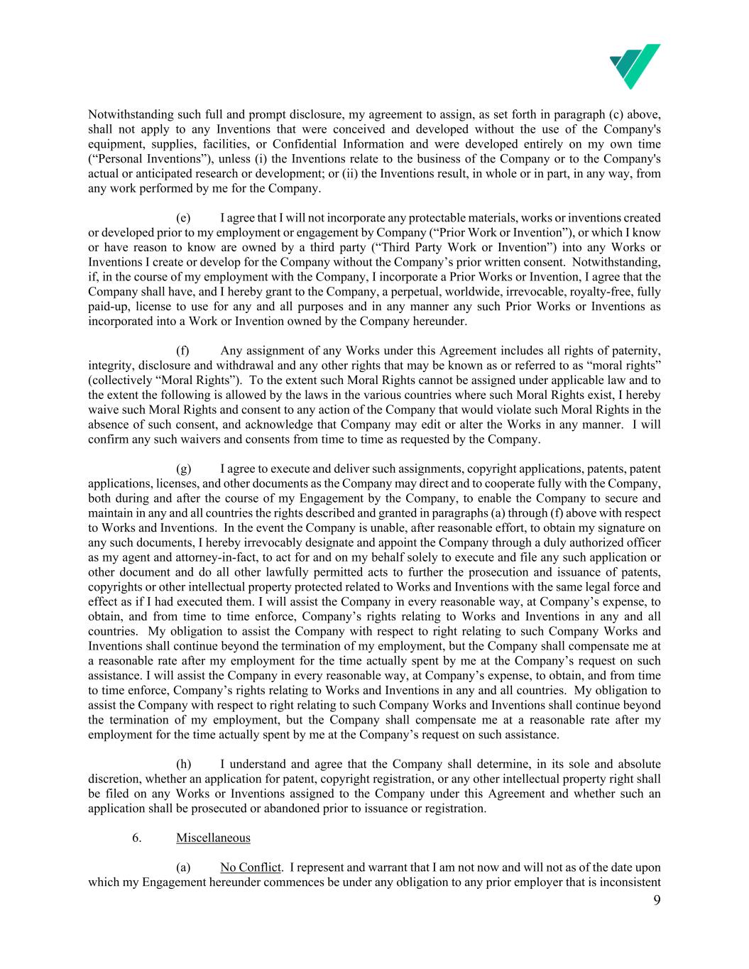 9 Notwithstanding such full and prompt disclosure, my agreement to assign, as set forth in paragraph (c) above, shall not apply to any Inventions that were conceived and developed without the use of the Company's equipment, supplies, facilities, or Confidential Information and were developed entirely on my own time (“Personal Inventions”), unless (i) the Inventions relate to the business of the Company or to the Company's actual or anticipated research or development; or (ii) the Inventions result, in whole or in part, in any way, from any work performed by me for the Company. (e) I agree that I will not incorporate any protectable materials, works or inventions created or developed prior to my employment or engagement by Company (“Prior Work or Invention”), or which I know or have reason to know are owned by a third party (“Third Party Work or Invention”) into any Works or Inventions I create or develop for the Company without the Company’s prior written consent. Notwithstanding, if, in the course of my employment with the Company, I incorporate a Prior Works or Invention, I agree that the Company shall have, and I hereby grant to the Company, a perpetual, worldwide, irrevocable, royalty-free, fully paid-up, license to use for any and all purposes and in any manner any such Prior Works or Inventions as incorporated into a Work or Invention owned by the Company hereunder. (f) Any assignment of any Works under this Agreement includes all rights of paternity, integrity, disclosure and withdrawal and any other rights that may be known as or referred to as “moral rights” (collectively “Moral Rights”). To the extent such Moral Rights cannot be assigned under applicable law and to the extent the following is allowed by the laws in the various countries where such Moral Rights exist, I hereby waive such Moral Rights and consent to any action of the Company that would violate such Moral Rights in the absence of such consent, and acknowledge that Company may edit or alter the Works in any manner. I will confirm any such waivers and consents from time to time as requested by the Company. (g) I agree to execute and deliver such assignments, copyright applications, patents, patent applications, licenses, and other documents as the Company may direct and to cooperate fully with the Company, both during and after the course of my Engagement by the Company, to enable the Company to secure and maintain in any and all countries the rights described and granted in paragraphs (a) through (f) above with respect to Works and Inventions. In the event the Company is unable, after reasonable effort, to obtain my signature on any such documents, I hereby irrevocably designate and appoint the Company through a duly authorized officer as my agent and attorney-in-fact, to act for and on my behalf solely to execute and file any such application or other document and do all other lawfully permitted acts to further the prosecution and issuance of patents, copyrights or other intellectual property protected related to Works and Inventions with the same legal force and effect as if I had executed them. I will assist the Company in every reasonable way, at Company’s expense, to obtain, and from time to time enforce, Company’s rights relating to Works and Inventions in any and all countries. My obligation to assist the Company with respect to right relating to such Company Works and Inventions shall continue beyond the termination of my employment, but the Company shall compensate me at a reasonable rate after my employment for the time actually spent by me at the Company’s request on such assistance. I will assist the Company in every reasonable way, at Company’s expense, to obtain, and from time to time enforce, Company’s rights relating to Works and Inventions in any and all countries. My obligation to assist the Company with respect to right relating to such Company Works and Inventions shall continue beyond the termination of my employment, but the Company shall compensate me at a reasonable rate after my employment for the time actually spent by me at the Company’s request on such assistance. (h) I understand and agree that the Company shall determine, in its sole and absolute discretion, whether an application for patent, copyright registration, or any other intellectual property right shall be filed on any Works or Inventions assigned to the Company under this Agreement and whether such an application shall be prosecuted or abandoned prior to issuance or registration. 6. Miscellaneous (a) No Conflict. I represent and warrant that I am not now and will not as of the date upon which my Engagement hereunder commences be under any obligation to any prior employer that is inconsistent