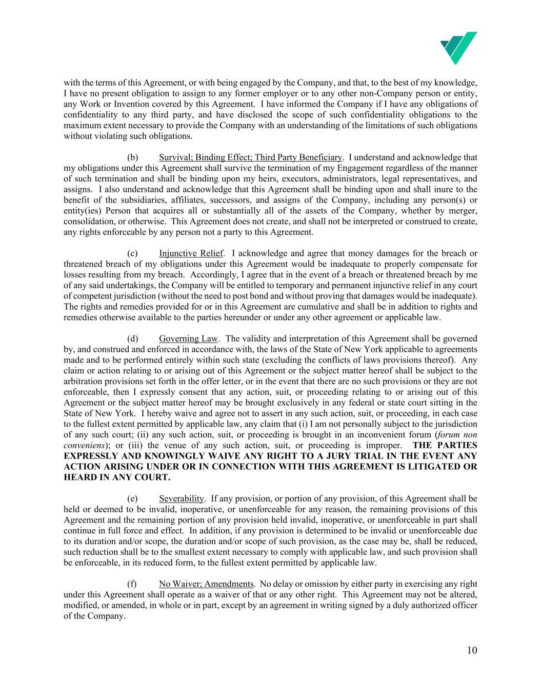 10 with the terms of this Agreement, or with being engaged by the Company, and that, to the best of my knowledge, I have no present obligation to assign to any former employer or to any other non-Company person or entity, any Work or Invention covered by this Agreement. I have informed the Company if I have any obligations of confidentiality to any third party, and have disclosed the scope of such confidentiality obligations to the maximum extent necessary to provide the Company with an understanding of the limitations of such obligations without violating such obligations. (b) Survival; Binding Effect; Third Party Beneficiary. I understand and acknowledge that my obligations under this Agreement shall survive the termination of my Engagement regardless of the manner of such termination and shall be binding upon my heirs, executors, administrators, legal representatives, and assigns. I also understand and acknowledge that this Agreement shall be binding upon and shall inure to the benefit of the subsidiaries, affiliates, successors, and assigns of the Company, including any person(s) or entity(ies) Person that acquires all or substantially all of the assets of the Company, whether by merger, consolidation, or otherwise. This Agreement does not create, and shall not be interpreted or construed to create, any rights enforceable by any person not a party to this Agreement. (c) Injunctive Relief. I acknowledge and agree that money damages for the breach or threatened breach of my obligations under this Agreement would be inadequate to properly compensate for losses resulting from my breach. Accordingly, I agree that in the event of a breach or threatened breach by me of any said undertakings, the Company will be entitled to temporary and permanent injunctive relief in any court of competent jurisdiction (without the need to post bond and without proving that damages would be inadequate). The rights and remedies provided for or in this Agreement are cumulative and shall be in addition to rights and remedies otherwise available to the parties hereunder or under any other agreement or applicable law. (d) Governing Law. The validity and interpretation of this Agreement shall be governed by, and construed and enforced in accordance with, the laws of the State of New York applicable to agreements made and to be performed entirely within such state (excluding the conflicts of laws provisions thereof). Any claim or action relating to or arising out of this Agreement or the subject matter hereof shall be subject to the arbitration provisions set forth in the offer letter, or in the event that there are no such provisions or they are not enforceable, then I expressly consent that any action, suit, or proceeding relating to or arising out of this Agreement or the subject matter hereof may be brought exclusively in any federal or state court sitting in the State of New York. I hereby waive and agree not to assert in any such action, suit, or proceeding, in each case to the fullest extent permitted by applicable law, any claim that (i) I am not personally subject to the jurisdiction of any such court; (ii) any such action, suit, or proceeding is brought in an inconvenient forum (forum non conveniens); or (iii) the venue of any such action, suit, or proceeding is improper. THE PARTIES EXPRESSLY AND KNOWINGLY WAIVE ANY RIGHT TO A JURY TRIAL IN THE EVENT ANY ACTION ARISING UNDER OR IN CONNECTION WITH THIS AGREEMENT IS LITIGATED OR HEARD IN ANY COURT. (e) Severability. If any provision, or portion of any provision, of this Agreement shall be held or deemed to be invalid, inoperative, or unenforceable for any reason, the remaining provisions of this Agreement and the remaining portion of any provision held invalid, inoperative, or unenforceable in part shall continue in full force and effect. In addition, if any provision is determined to be invalid or unenforceable due to its duration and/or scope, the duration and/or scope of such provision, as the case may be, shall be reduced, such reduction shall be to the smallest extent necessary to comply with applicable law, and such provision shall be enforceable, in its reduced form, to the fullest extent permitted by applicable law. (f) No Waiver; Amendments. No delay or omission by either party in exercising any right under this Agreement shall operate as a waiver of that or any other right. This Agreement may not be altered, modified, or amended, in whole or in part, except by an agreement in writing signed by a duly authorized officer of the Company.