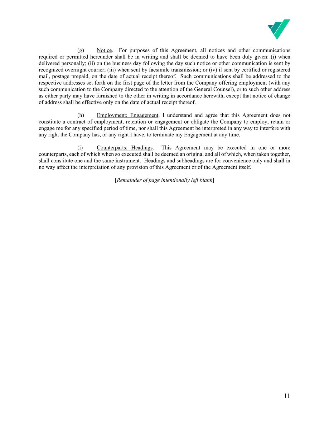 11 (g) Notice. For purposes of this Agreement, all notices and other communications required or permitted hereunder shall be in writing and shall be deemed to have been duly given: (i) when delivered personally; (ii) on the business day following the day such notice or other communication is sent by recognized overnight courier; (iii) when sent by facsimile transmission; or (iv) if sent by certified or registered mail, postage prepaid, on the date of actual receipt thereof. Such communications shall be addressed to the respective addresses set forth on the first page of the letter from the Company offering employment (with any such communication to the Company directed to the attention of the General Counsel), or to such other address as either party may have furnished to the other in writing in accordance herewith, except that notice of change of address shall be effective only on the date of actual receipt thereof. (h) Employment; Engagement. I understand and agree that this Agreement does not constitute a contract of employment, retention or engagement or obligate the Company to employ, retain or engage me for any specified period of time, nor shall this Agreement be interpreted in any way to interfere with any right the Company has, or any right I have, to terminate my Engagement at any time. (i) Counterparts; Headings. This Agreement may be executed in one or more counterparts, each of which when so executed shall be deemed an original and all of which, when taken together, shall constitute one and the same instrument. Headings and subheadings are for convenience only and shall in no way affect the interpretation of any provision of this Agreement or of the Agreement itself. [Remainder of page intentionally left blank]