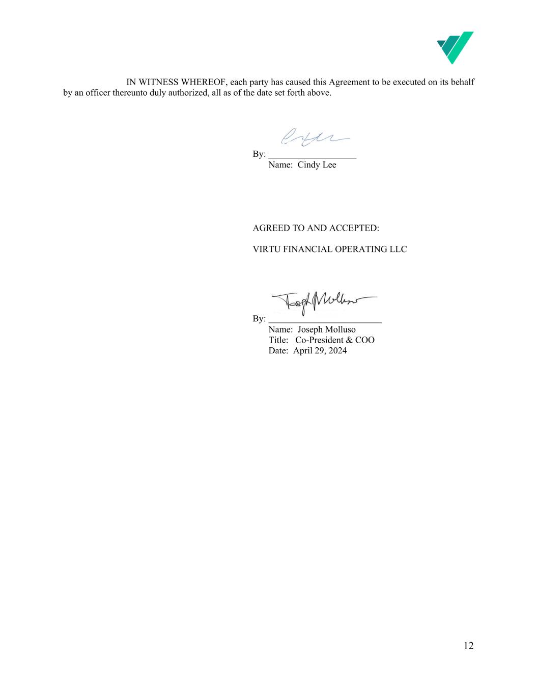 12 IN WITNESS WHEREOF, each party has caused this Agreement to be executed on its behalf by an officer thereunto duly authorized, all as of the date set forth above. By: Name: Cindy Lee AGREED TO AND ACCEPTED: VIRTU FINANCIAL OPERATING LLC By: Name: Joseph Molluso Title: Co-President & COO Date: April 29, 2024