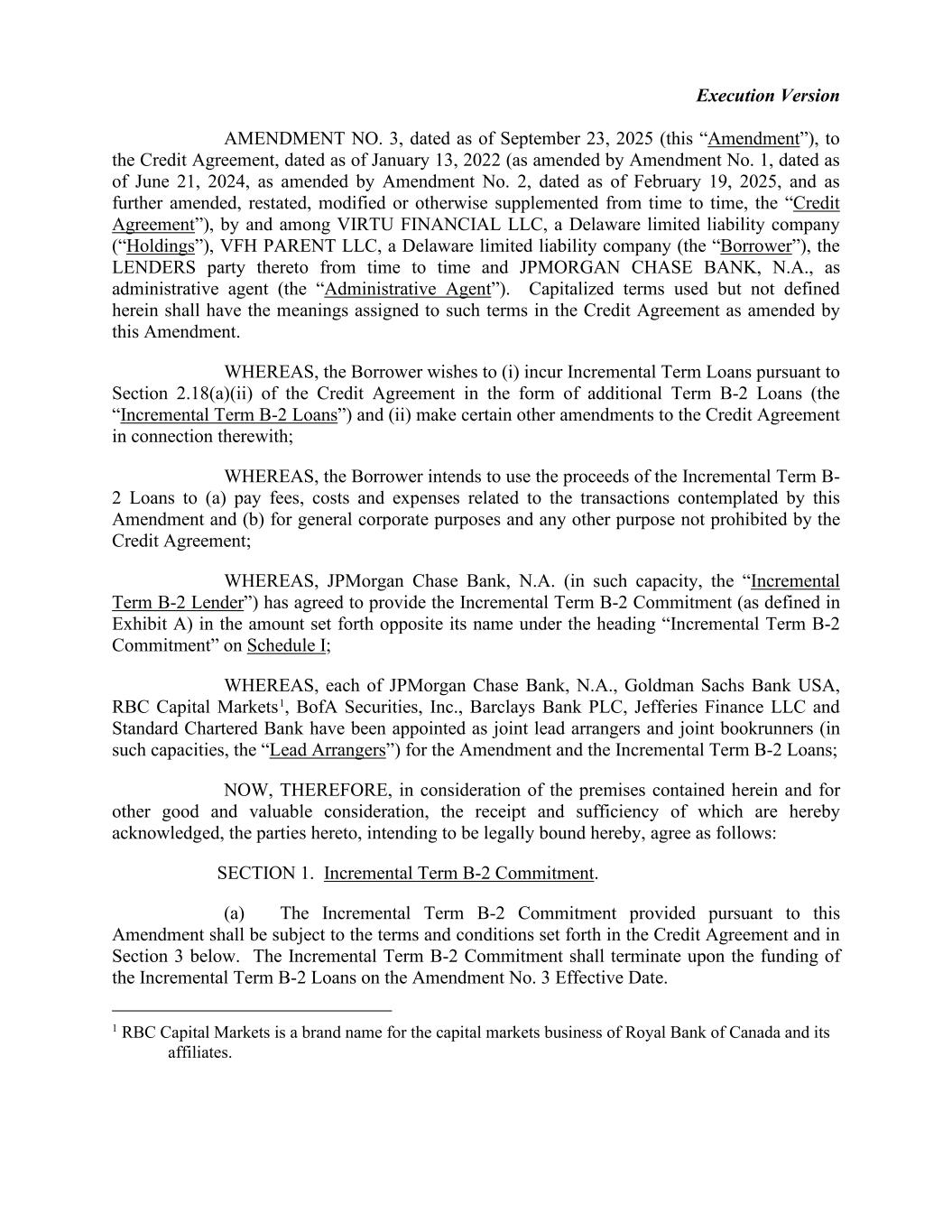 Execution Version AMENDMENT NO. 3, dated as of September 23, 2025 (this “Amendment”), to the Credit Agreement, dated as of January 13, 2022 (as amended by Amendment No. 1, dated as of June 21, 2024, as amended by Amendment No. 2, dated as of February 19, 2025, and as further amended, restated, modified or otherwise supplemented from time to time, the “Credit Agreement”), by and among VIRTU FINANCIAL LLC, a Delaware limited liability company (“Holdings”), VFH PARENT LLC, a Delaware limited liability company (the “Borrower”), the LENDERS party thereto from time to time and JPMORGAN CHASE BANK, N.A., as administrative agent (the “Administrative Agent”). Capitalized terms used but not defined herein shall have the meanings assigned to such terms in the Credit Agreement as amended by this Amendment. WHEREAS, the Borrower wishes to (i) incur Incremental Term Loans pursuant to Section 2.18(a)(ii) of the Credit Agreement in the form of additional Term B-2 Loans (the “Incremental Term B-2 Loans”) and (ii) make certain other amendments to the Credit Agreement in connection therewith; WHEREAS, the Borrower intends to use the proceeds of the Incremental Term B- 2 Loans to (a) pay fees, costs and expenses related to the transactions contemplated by this Amendment and (b) for general corporate purposes and any other purpose not prohibited by the Credit Agreement; WHEREAS, JPMorgan Chase Bank, N.A. (in such capacity, the “Incremental Term B-2 Lender”) has agreed to provide the Incremental Term B-2 Commitment (as defined in Exhibit A) in the amount set forth opposite its name under the heading “Incremental Term B-2 Commitment” on Schedule I; WHEREAS, each of JPMorgan Chase Bank, N.A., Goldman Sachs Bank USA, RBC Capital Markets1, BofA Securities, Inc., Barclays Bank PLC, Jefferies Finance LLC and Standard Chartered Bank have been appointed as joint lead arrangers and joint bookrunners (in such capacities, the “Lead Arrangers”) for the Amendment and the Incremental Term B-2 Loans; NOW, THEREFORE, in consideration of the premises contained herein and for other good and valuable consideration, the receipt and sufficiency of which are hereby acknowledged, the parties hereto, intending to be legally bound hereby, agree as follows: SECTION 1. Incremental Term B-2 Commitment. (a) The Incremental Term B-2 Commitment provided pursuant to this Amendment shall be subject to the terms and conditions set forth in the Credit Agreement and in Section 3 below. The Incremental Term B-2 Commitment shall terminate upon the funding of the Incremental Term B-2 Loans on the Amendment No. 3 Effective Date. 1 RBC Capital Markets is a brand name for the capital markets business of Royal Bank of Canada and its affiliates.