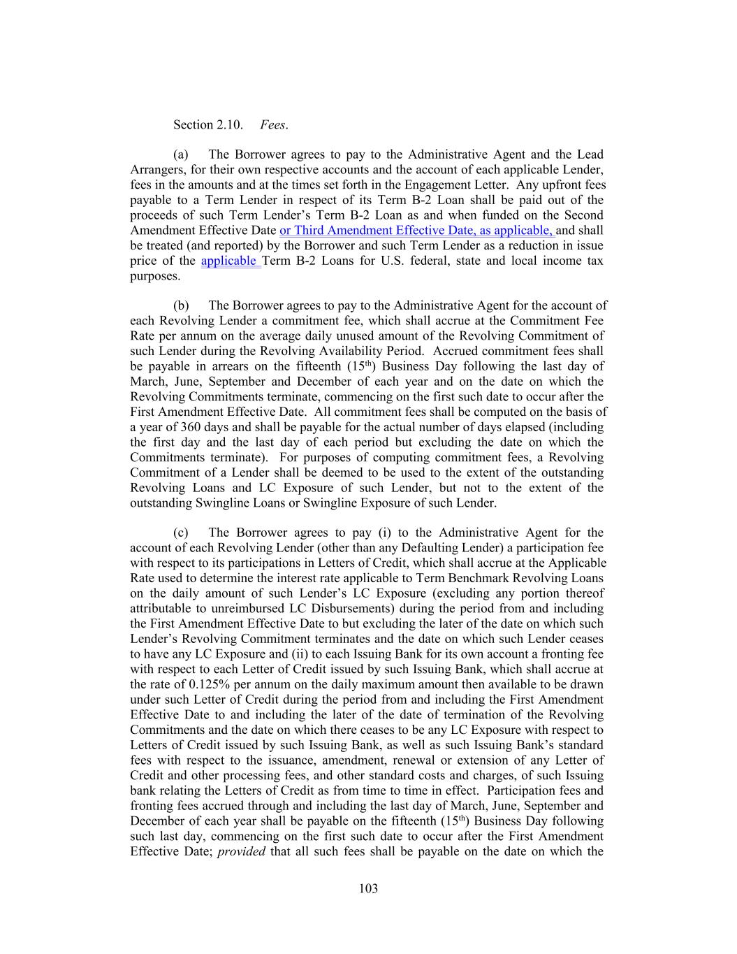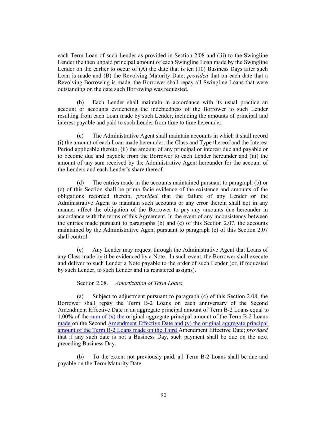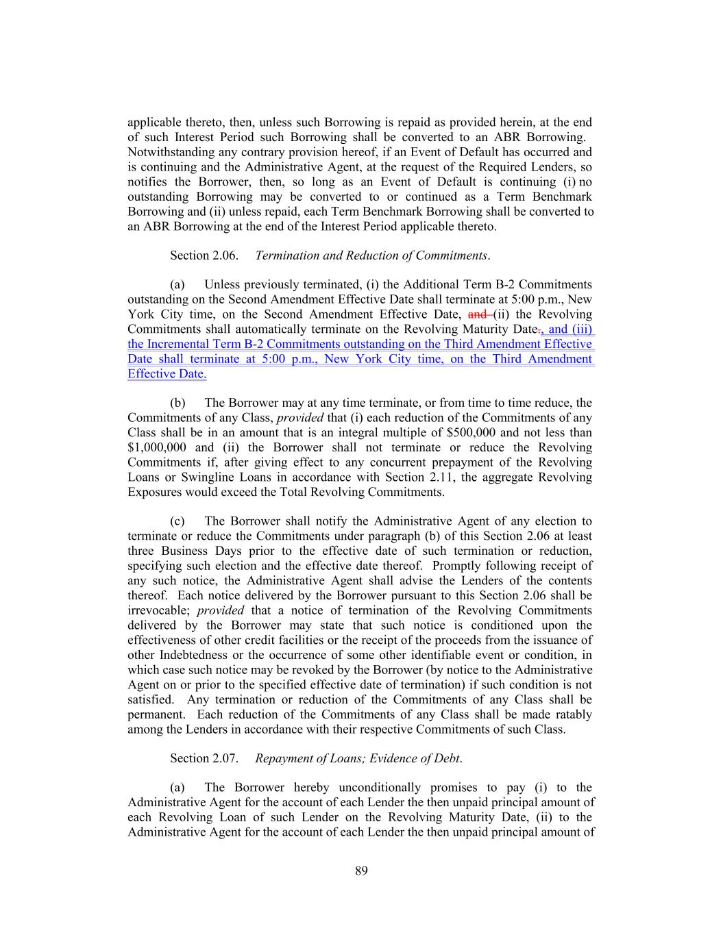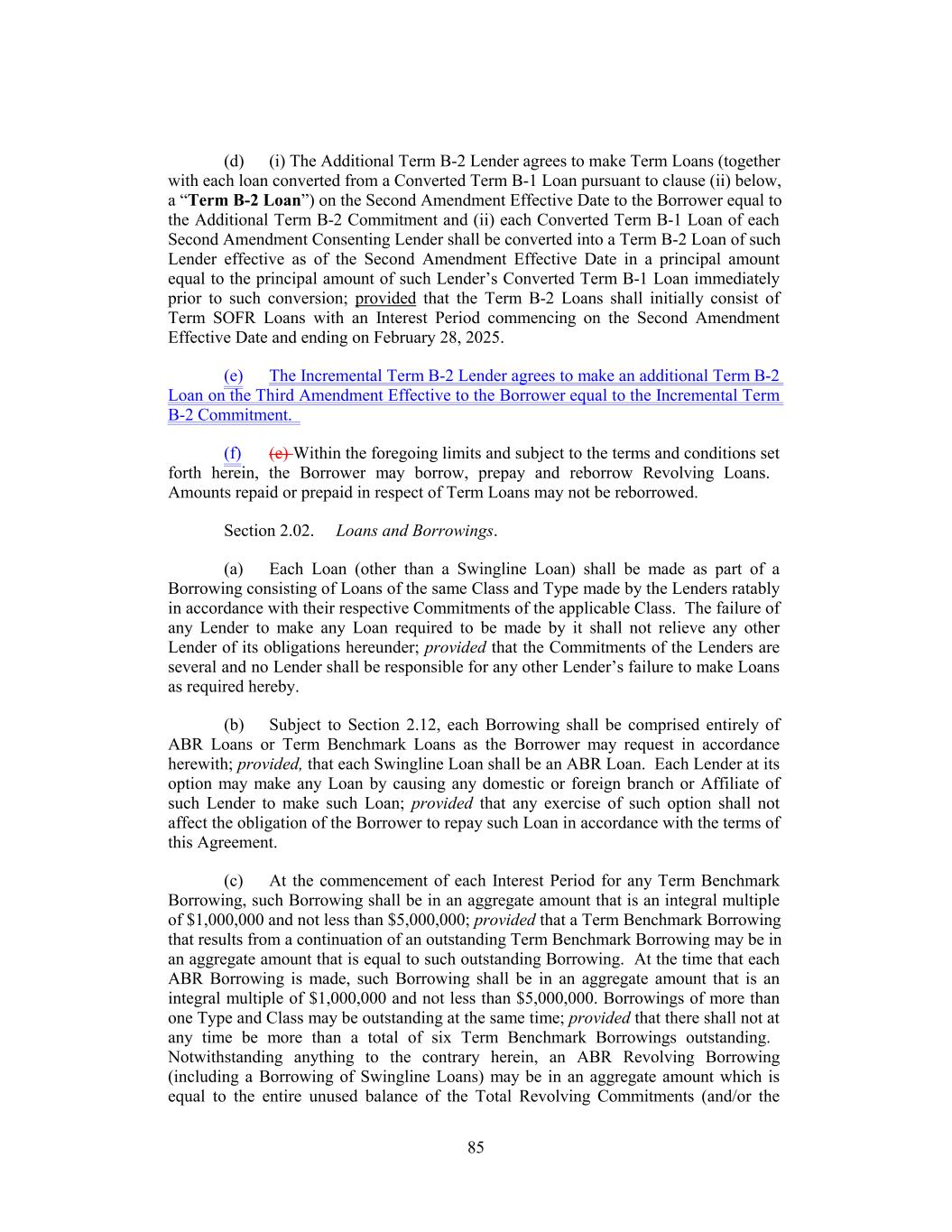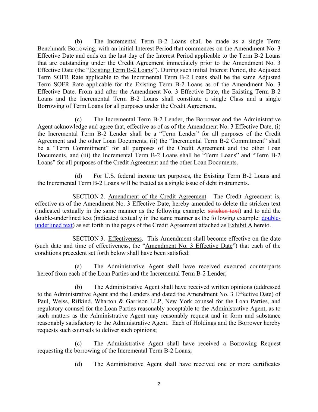 2 (b) The Incremental Term B-2 Loans shall be made as a single Term Benchmark Borrowing, with an initial Interest Period that commences on the Amendment No. 3 Effective Date and ends on the last day of the Interest Period applicable to the Term B-2 Loans that are outstanding under the Credit Agreement immediately prior to the Amendment No. 3 Effective Date (the “Existing Term B-2 Loans”). During such initial Interest Period, the Adjusted Term SOFR Rate applicable to the Incremental Term B-2 Loans shall be the same Adjusted Term SOFR Rate applicable for the Existing Term B-2 Loans as of the Amendment No. 3 Effective Date. From and after the Amendment No. 3 Effective Date, the Existing Term B-2 Loans and the Incremental Term B-2 Loans shall constitute a single Class and a single Borrowing of Term Loans for all purposes under the Credit Agreement. (c) The Incremental Term B-2 Lender, the Borrower and the Administrative Agent acknowledge and agree that, effective as of as of the Amendment No. 3 Effective Date, (i) the Incremental Term B-2 Lender shall be a “Term Lender” for all purposes of the Credit Agreement and the other Loan Documents, (ii) the “Incremental Term B-2 Commitment” shall be a “Term Commitment” for all purposes of the Credit Agreement and the other Loan Documents, and (iii) the Incremental Term B-2 Loans shall be “Term Loans” and “Term B-2 Loans” for all purposes of the Credit Agreement and the other Loan Documents. (d) For U.S. federal income tax purposes, the Existing Term B-2 Loans and the Incremental Term B-2 Loans will be treated as a single issue of debt instruments. SECTION 2. Amendment of the Credit Agreement. The Credit Agreement is, effective as of the Amendment No. 3 Effective Date, hereby amended to delete the stricken text (indicated textually in the same manner as the following example: stricken text) and to add the double-underlined text (indicated textually in the same manner as the following example: double- underlined text) as set forth in the pages of the Credit Agreement attached as Exhibit A hereto. SECTION 3. Effectiveness. This Amendment shall become effective on the date (such date and time of effectiveness, the “Amendment No. 3 Effective Date”) that each of the conditions precedent set forth below shall have been satisfied: (a) The Administrative Agent shall have received executed counterparts hereof from each of the Loan Parties and the Incremental Term B-2 Lender; (b) The Administrative Agent shall have received written opinions (addressed to the Administrative Agent and the Lenders and dated the Amendment No. 3 Effective Date) of Paul, Weiss, Rifkind, Wharton & Garrison LLP, New York counsel for the Loan Parties, and regulatory counsel for the Loan Parties reasonably acceptable to the Administrative Agent, as to such matters as the Administrative Agent may reasonably request and in form and substance reasonably satisfactory to the Administrative Agent. Each of Holdings and the Borrower hereby requests such counsels to deliver such opinions; (c) The Administrative Agent shall have received a Borrowing Request requesting the borrowing of the Incremental Term B-2 Loans; (d) The Administrative Agent shall have received one or more certificates