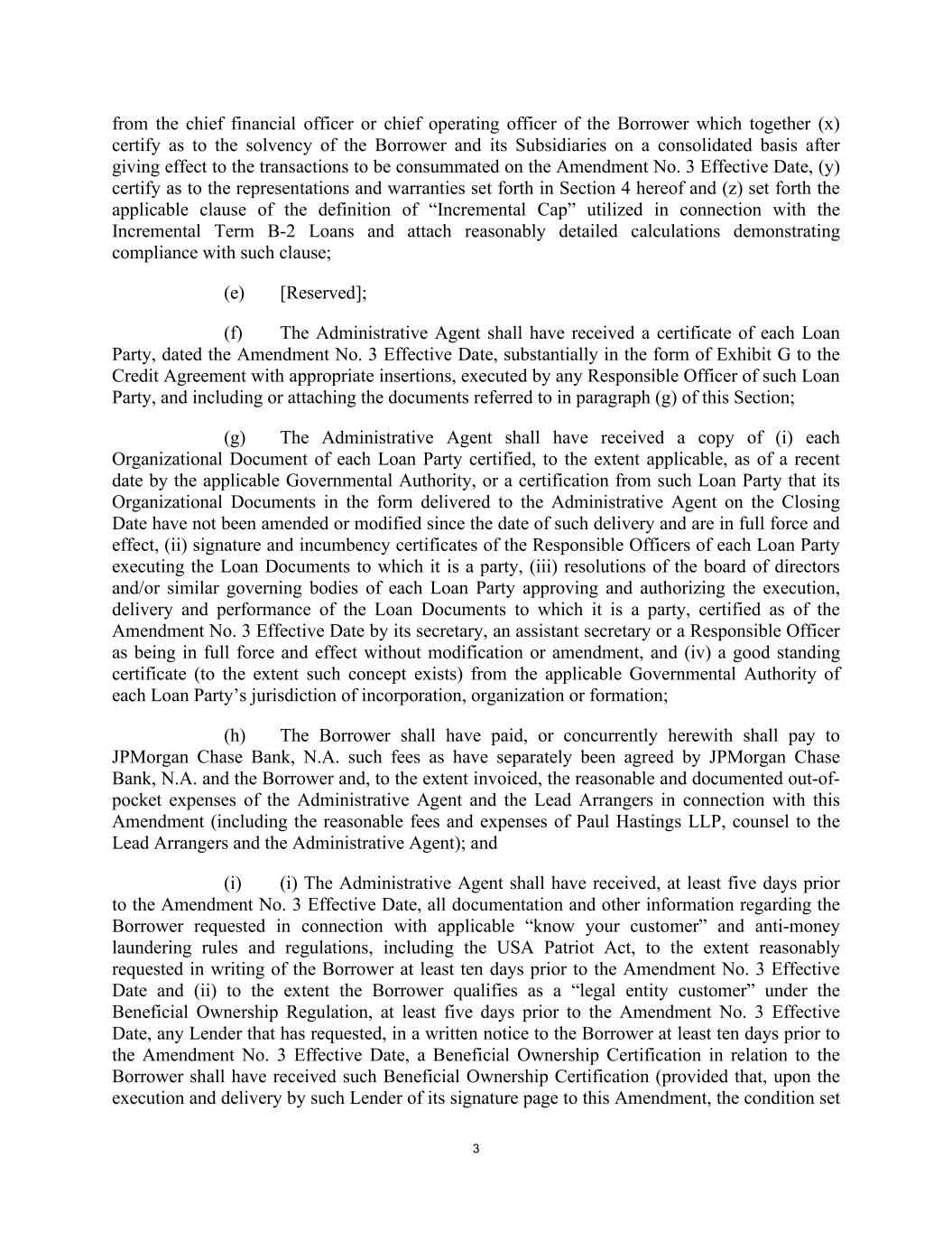 3 from the chief financial officer or chief operating officer of the Borrower which together (x) certify as to the solvency of the Borrower and its Subsidiaries on a consolidated basis after giving effect to the transactions to be consummated on the Amendment No. 3 Effective Date, (y) certify as to the representations and warranties set forth in Section 4 hereof and (z) set forth the applicable clause of the definition of “Incremental Cap” utilized in connection with the Incremental Term B-2 Loans and attach reasonably detailed calculations demonstrating compliance with such clause; (e) [Reserved]; (f) The Administrative Agent shall have received a certificate of each Loan Party, dated the Amendment No. 3 Effective Date, substantially in the form of Exhibit G to the Credit Agreement with appropriate insertions, executed by any Responsible Officer of such Loan Party, and including or attaching the documents referred to in paragraph (g) of this Section; (g) The Administrative Agent shall have received a copy of (i) each Organizational Document of each Loan Party certified, to the extent applicable, as of a recent date by the applicable Governmental Authority, or a certification from such Loan Party that its Organizational Documents in the form delivered to the Administrative Agent on the Closing Date have not been amended or modified since the date of such delivery and are in full force and effect, (ii) signature and incumbency certificates of the Responsible Officers of each Loan Party executing the Loan Documents to which it is a party, (iii) resolutions of the board of directors and/or similar governing bodies of each Loan Party approving and authorizing the execution, delivery and performance of the Loan Documents to which it is a party, certified as of the Amendment No. 3 Effective Date by its secretary, an assistant secretary or a Responsible Officer as being in full force and effect without modification or amendment, and (iv) a good standing certificate (to the extent such concept exists) from the applicable Governmental Authority of each Loan Party’s jurisdiction of incorporation, organization or formation; (h) The Borrower shall have paid, or concurrently herewith shall pay to JPMorgan Chase Bank, N.A. such fees as have separately been agreed by JPMorgan Chase Bank, N.A. and the Borrower and, to the extent invoiced, the reasonable and documented out-of- pocket expenses of the Administrative Agent and the Lead Arrangers in connection with this Amendment (including the reasonable fees and expenses of Paul Hastings LLP, counsel to the Lead Arrangers and the Administrative Agent); and (i) (i) The Administrative Agent shall have received, at least five days prior to the Amendment No. 3 Effective Date, all documentation and other information regarding the Borrower requested in connection with applicable “know your customer” and anti-money laundering rules and regulations, including the USA Patriot Act, to the extent reasonably requested in writing of the Borrower at least ten days prior to the Amendment No. 3 Effective Date and (ii) to the extent the Borrower qualifies as a “legal entity customer” under the Beneficial Ownership Regulation, at least five days prior to the Amendment No. 3 Effective Date, any Lender that has requested, in a written notice to the Borrower at least ten days prior to the Amendment No. 3 Effective Date, a Beneficial Ownership Certification in relation to the Borrower shall have received such Beneficial Ownership Certification (provided that, upon the execution and delivery by such Lender of its signature page to this Amendment, the condition set