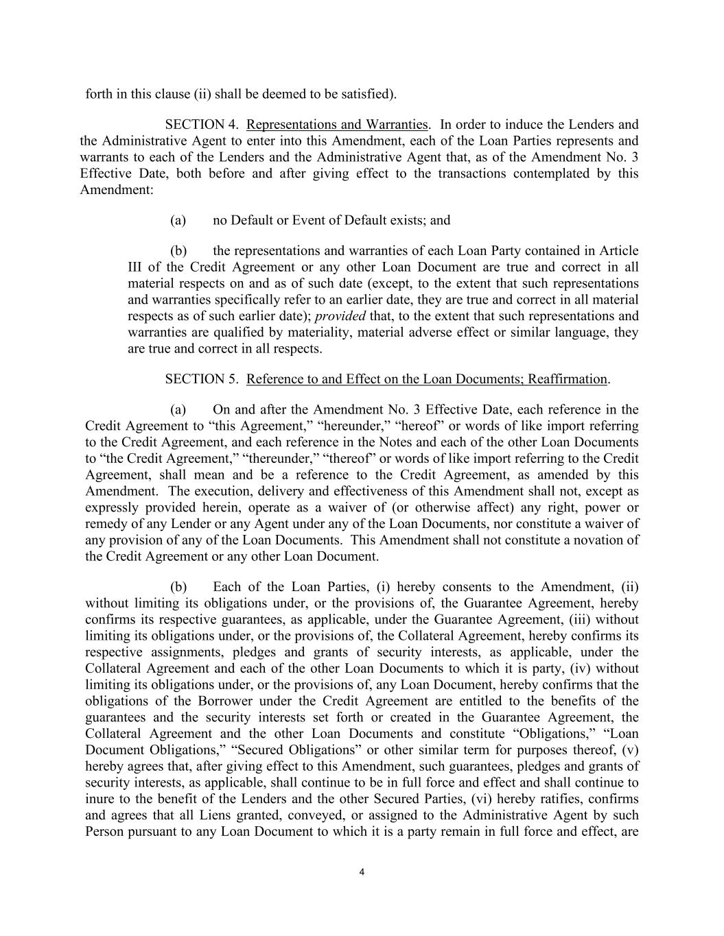 4 forth in this clause (ii) shall be deemed to be satisfied). SECTION 4. Representations and Warranties. In order to induce the Lenders and the Administrative Agent to enter into this Amendment, each of the Loan Parties represents and warrants to each of the Lenders and the Administrative Agent that, as of the Amendment No. 3 Effective Date, both before and after giving effect to the transactions contemplated by this Amendment: (a) no Default or Event of Default exists; and (b) the representations and warranties of each Loan Party contained in Article III of the Credit Agreement or any other Loan Document are true and correct in all material respects on and as of such date (except, to the extent that such representations and warranties specifically refer to an earlier date, they are true and correct in all material respects as of such earlier date); provided that, to the extent that such representations and warranties are qualified by materiality, material adverse effect or similar language, they are true and correct in all respects. SECTION 5. Reference to and Effect on the Loan Documents; Reaffirmation. (a) On and after the Amendment No. 3 Effective Date, each reference in the Credit Agreement to “this Agreement,” “hereunder,” “hereof” or words of like import referring to the Credit Agreement, and each reference in the Notes and each of the other Loan Documents to “the Credit Agreement,” “thereunder,” “thereof” or words of like import referring to the Credit Agreement, shall mean and be a reference to the Credit Agreement, as amended by this Amendment. The execution, delivery and effectiveness of this Amendment shall not, except as expressly provided herein, operate as a waiver of (or otherwise affect) any right, power or remedy of any Lender or any Agent under any of the Loan Documents, nor constitute a waiver of any provision of any of the Loan Documents. This Amendment shall not constitute a novation of the Credit Agreement or any other Loan Document. (b) Each of the Loan Parties, (i) hereby consents to the Amendment, (ii) without limiting its obligations under, or the provisions of, the Guarantee Agreement, hereby confirms its respective guarantees, as applicable, under the Guarantee Agreement, (iii) without limiting its obligations under, or the provisions of, the Collateral Agreement, hereby confirms its respective assignments, pledges and grants of security interests, as applicable, under the Collateral Agreement and each of the other Loan Documents to which it is party, (iv) without limiting its obligations under, or the provisions of, any Loan Document, hereby confirms that the obligations of the Borrower under the Credit Agreement are entitled to the benefits of the guarantees and the security interests set forth or created in the Guarantee Agreement, the Collateral Agreement and the other Loan Documents and constitute “Obligations,” “Loan Document Obligations,” “Secured Obligations” or other similar term for purposes thereof, (v) hereby agrees that, after giving effect to this Amendment, such guarantees, pledges and grants of security interests, as applicable, shall continue to be in full force and effect and shall continue to inure to the benefit of the Lenders and the other Secured Parties, (vi) hereby ratifies, confirms and agrees that all Liens granted, conveyed, or assigned to the Administrative Agent by such Person pursuant to any Loan Document to which it is a party remain in full force and effect, are