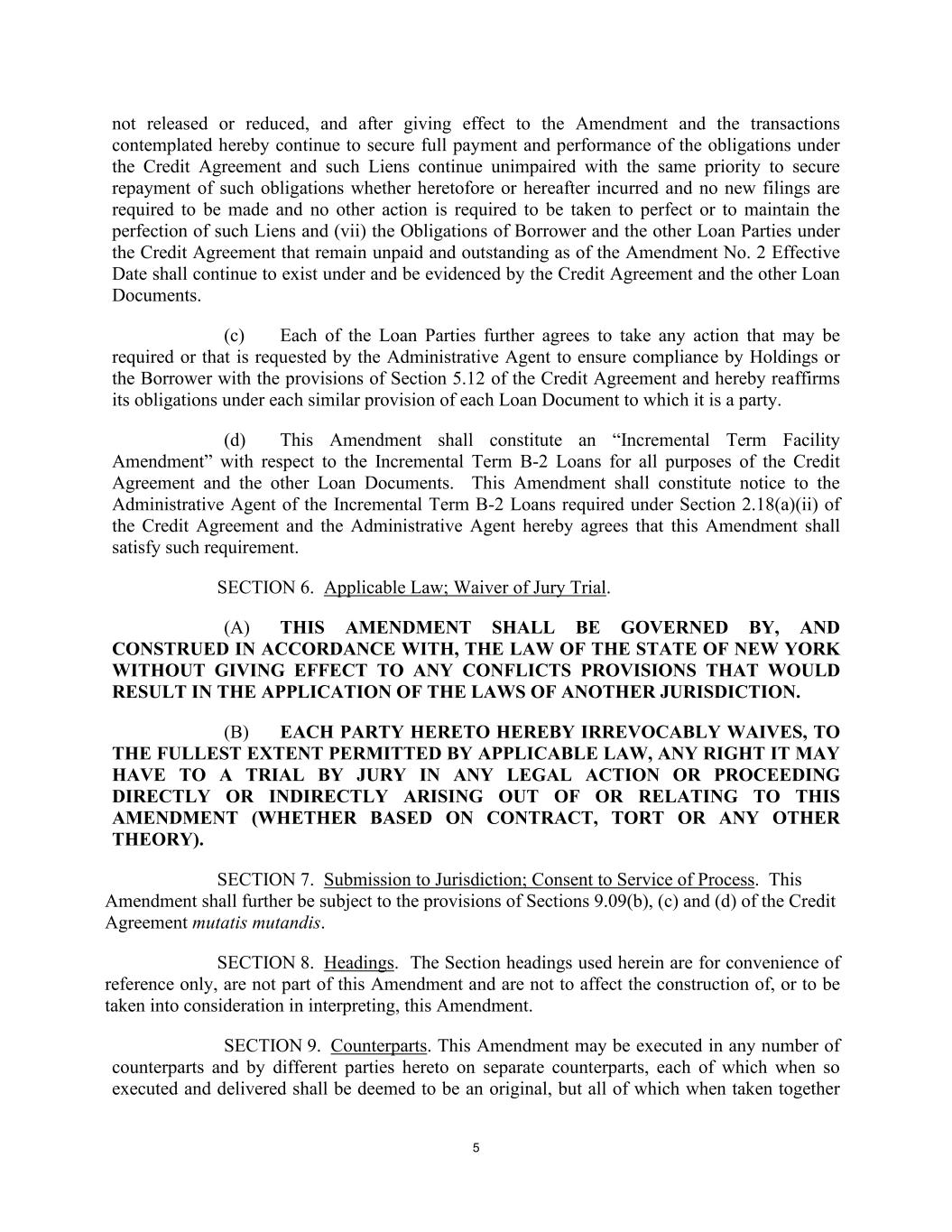 5 not released or reduced, and after giving effect to the Amendment and the transactions contemplated hereby continue to secure full payment and performance of the obligations under the Credit Agreement and such Liens continue unimpaired with the same priority to secure repayment of such obligations whether heretofore or hereafter incurred and no new filings are required to be made and no other action is required to be taken to perfect or to maintain the perfection of such Liens and (vii) the Obligations of Borrower and the other Loan Parties under the Credit Agreement that remain unpaid and outstanding as of the Amendment No. 2 Effective Date shall continue to exist under and be evidenced by the Credit Agreement and the other Loan Documents. (c) Each of the Loan Parties further agrees to take any action that may be required or that is requested by the Administrative Agent to ensure compliance by Holdings or the Borrower with the provisions of Section 5.12 of the Credit Agreement and hereby reaffirms its obligations under each similar provision of each Loan Document to which it is a party. (d) This Amendment shall constitute an “Incremental Term Facility Amendment” with respect to the Incremental Term B-2 Loans for all purposes of the Credit Agreement and the other Loan Documents. This Amendment shall constitute notice to the Administrative Agent of the Incremental Term B-2 Loans required under Section 2.18(a)(ii) of the Credit Agreement and the Administrative Agent hereby agrees that this Amendment shall satisfy such requirement. SECTION 6. Applicable Law; Waiver of Jury Trial. (A) THIS AMENDMENT SHALL BE GOVERNED BY, AND CONSTRUED IN ACCORDANCE WITH, THE LAW OF THE STATE OF NEW YORK WITHOUT GIVING EFFECT TO ANY CONFLICTS PROVISIONS THAT WOULD RESULT IN THE APPLICATION OF THE LAWS OF ANOTHER JURISDICTION. (B) EACH PARTY HERETO HEREBY IRREVOCABLY WAIVES, TO THE FULLEST EXTENT PERMITTED BY APPLICABLE LAW, ANY RIGHT IT MAY HAVE TO A TRIAL BY JURY IN ANY LEGAL ACTION OR PROCEEDING DIRECTLY OR INDIRECTLY ARISING OUT OF OR RELATING TO THIS AMENDMENT (WHETHER BASED ON CONTRACT, TORT OR ANY OTHER THEORY). SECTION 7. Submission to Jurisdiction; Consent to Service of Process. This Amendment shall further be subject to the provisions of Sections 9.09(b), (c) and (d) of the Credit Agreement mutatis mutandis. SECTION 8. Headings. The Section headings used herein are for convenience of reference only, are not part of this Amendment and are not to affect the construction of, or to be taken into consideration in interpreting, this Amendment. SECTION 9. Counterparts. This Amendment may be executed in any number of counterparts and by different parties hereto on separate counterparts, each of which when so executed and delivered shall be deemed to be an original, but all of which when taken together