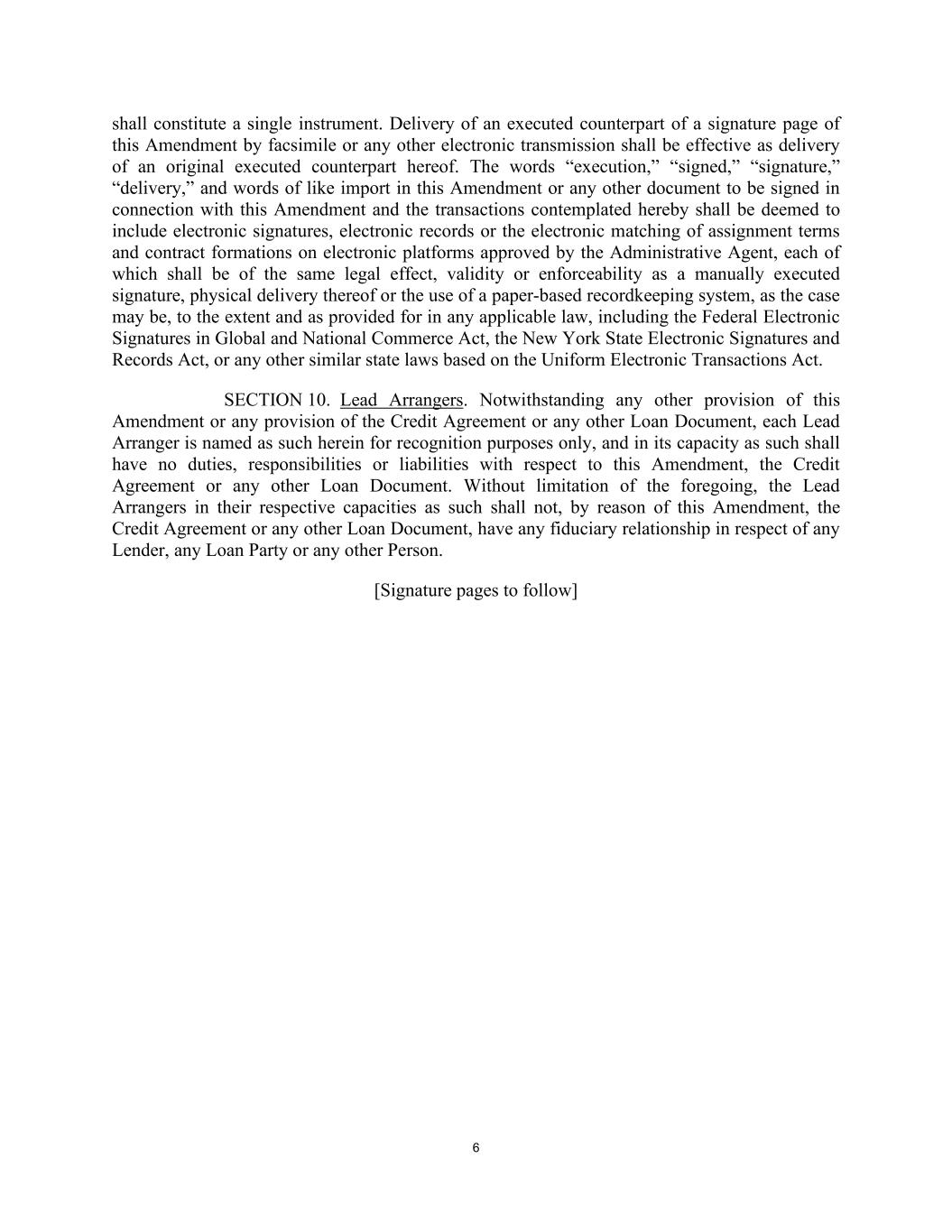 6 shall constitute a single instrument. Delivery of an executed counterpart of a signature page of this Amendment by facsimile or any other electronic transmission shall be effective as delivery of an original executed counterpart hereof. The words “execution,” “signed,” “signature,” “delivery,” and words of like import in this Amendment or any other document to be signed in connection with this Amendment and the transactions contemplated hereby shall be deemed to include electronic signatures, electronic records or the electronic matching of assignment terms and contract formations on electronic platforms approved by the Administrative Agent, each of which shall be of the same legal effect, validity or enforceability as a manually executed signature, physical delivery thereof or the use of a paper-based recordkeeping system, as the case may be, to the extent and as provided for in any applicable law, including the Federal Electronic Signatures in Global and National Commerce Act, the New York State Electronic Signatures and Records Act, or any other similar state laws based on the Uniform Electronic Transactions Act. SECTION 10. Lead Arrangers. Notwithstanding any other provision of this Amendment or any provision of the Credit Agreement or any other Loan Document, each Lead Arranger is named as such herein for recognition purposes only, and in its capacity as such shall have no duties, responsibilities or liabilities with respect to this Amendment, the Credit Agreement or any other Loan Document. Without limitation of the foregoing, the Lead Arrangers in their respective capacities as such shall not, by reason of this Amendment, the Credit Agreement or any other Loan Document, have any fiduciary relationship in respect of any Lender, any Loan Party or any other Person. [Signature pages to follow]