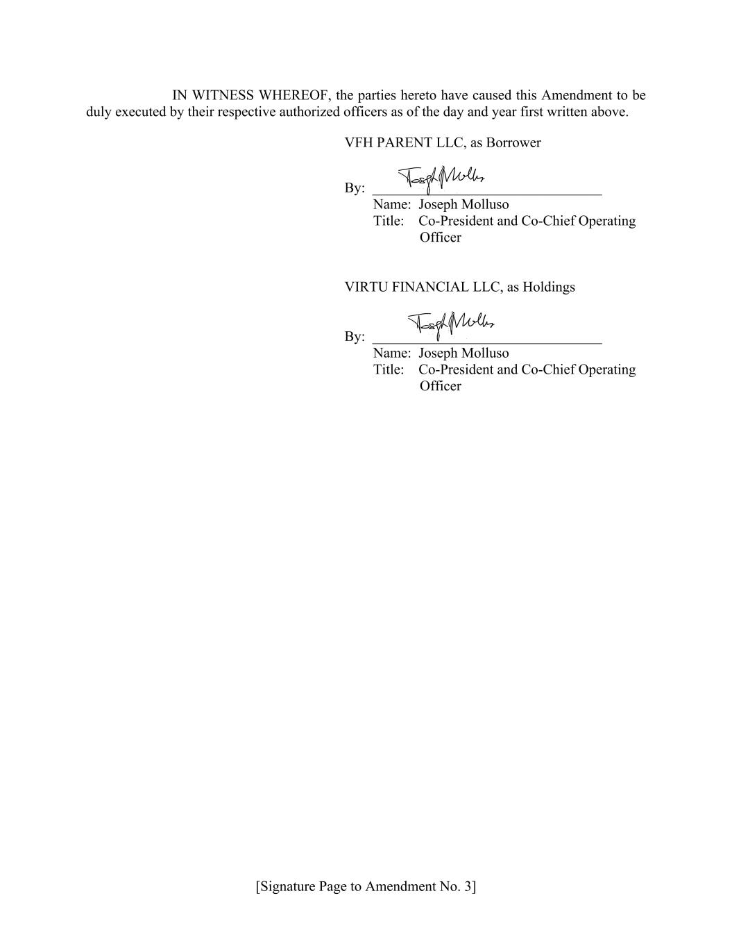 [Signature Page to Amendment No. 3] IN WITNESS WHEREOF, the parties hereto have caused this Amendment to be duly executed by their respective authorized officers as of the day and year first written above. VFH PARENT LLC, as Borrower By: ________________________________ Name: Joseph Molluso Title: Co-President and Co-Chief Operating Officer VIRTU FINANCIAL LLC, as Holdings By: ________________________________ Name: Joseph Molluso Title: Co-President and Co-Chief Operating Officer