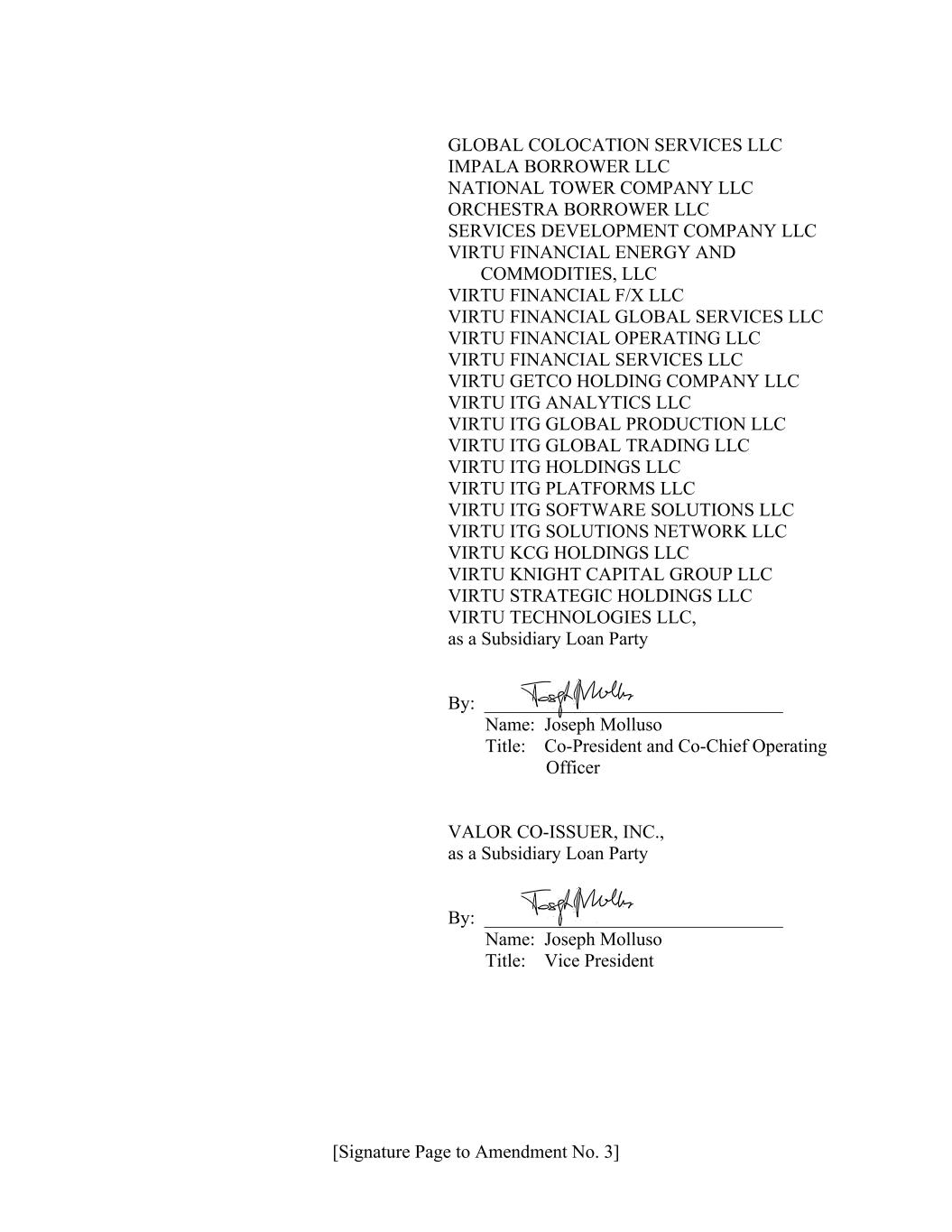 [Signature Page to Amendment No. 3] GLOBAL COLOCATION SERVICES LLC IMPALA BORROWER LLC NATIONAL TOWER COMPANY LLC ORCHESTRA BORROWER LLC SERVICES DEVELOPMENT COMPANY LLC VIRTU FINANCIAL ENERGY AND COMMODITIES, LLC VIRTU FINANCIAL F/X LLC VIRTU FINANCIAL GLOBAL SERVICES LLC VIRTU FINANCIAL OPERATING LLC VIRTU FINANCIAL SERVICES LLC VIRTU GETCO HOLDING COMPANY LLC VIRTU ITG ANALYTICS LLC VIRTU ITG GLOBAL PRODUCTION LLC VIRTU ITG GLOBAL TRADING LLC VIRTU ITG HOLDINGS LLC VIRTU ITG PLATFORMS LLC VIRTU ITG SOFTWARE SOLUTIONS LLC VIRTU ITG SOLUTIONS NETWORK LLC VIRTU KCG HOLDINGS LLC VIRTU KNIGHT CAPITAL GROUP LLC VIRTU STRATEGIC HOLDINGS LLC VIRTU TECHNOLOGIES LLC, as a Subsidiary Loan Party By: ________________________________ Name: Joseph Molluso Title: Co-President and Co-Chief Operating Officer VALOR CO-ISSUER, INC., as a Subsidiary Loan Party By: ________________________________ Name: Joseph Molluso Title: Vice President