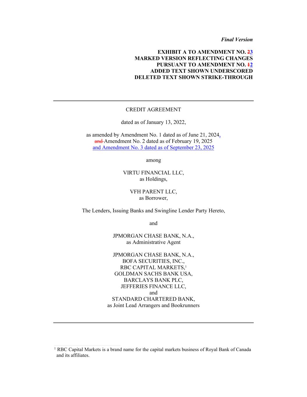 Final Version EXHIBIT A TO AMENDMENT NO. 23 MARKED VERSION REFLECTING CHANGES PURSUANT TO AMENDMENT NO. 12 ADDED TEXT SHOWN UNDERSCORED DELETED TEXT SHOWN STRIKE-THROUGH CREDIT AGREEMENT dated as of January 13, 2022, as amended by Amendment No. 1 dated as of June 21, 2024, and Amendment No. 2 dated as of February 19, 2025 and Amendment No. 3 dated as of September 23, 2025 among VIRTU FINANCIAL LLC, as Holdings, VFH PARENT LLC, as Borrower, The Lenders, Issuing Banks and Swingline Lender Party Hereto, and JPMORGAN CHASE BANK, N.A., as Administrative Agent JPMORGAN CHASE BANK, N.A., BOFA SECURITIES, INC., RBC CAPITAL MARKETS,1 GOLDMAN SACHS BANK USA, BARCLAYS BANK PLC, JEFFERIES FINANCE LLC, and STANDARD CHARTERED BANK, as Joint Lead Arrangers and Bookrunners 1 RBC Capital Markets is a brand name for the capital markets business of Royal Bank of Canada and its affiliates.