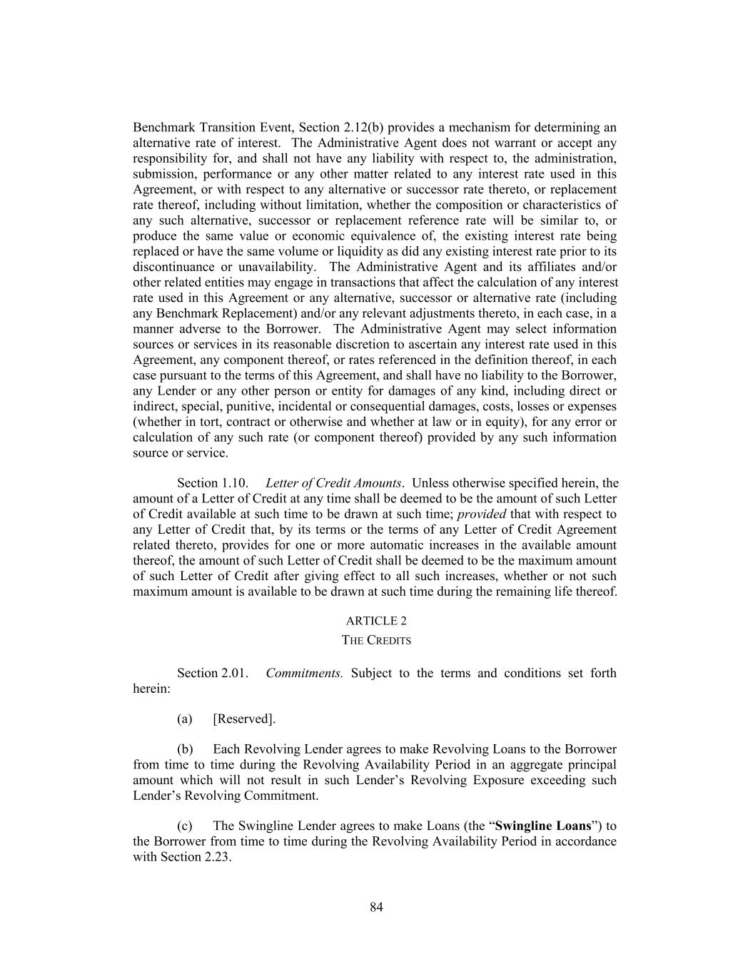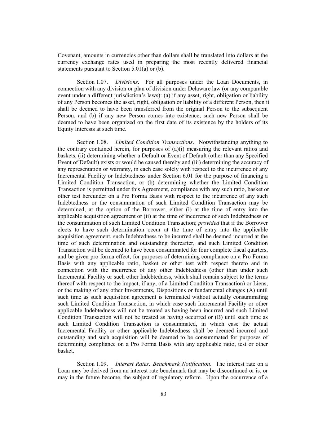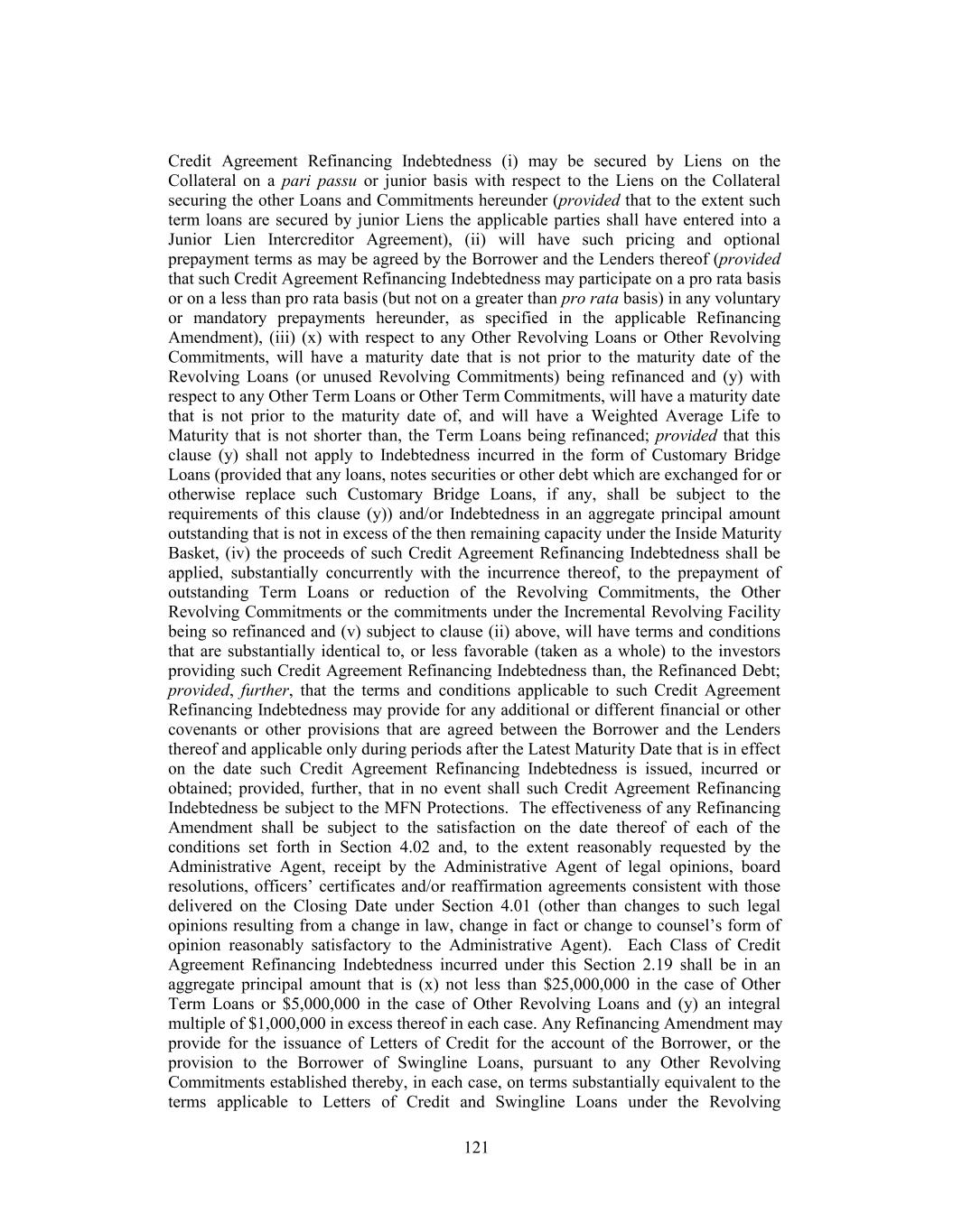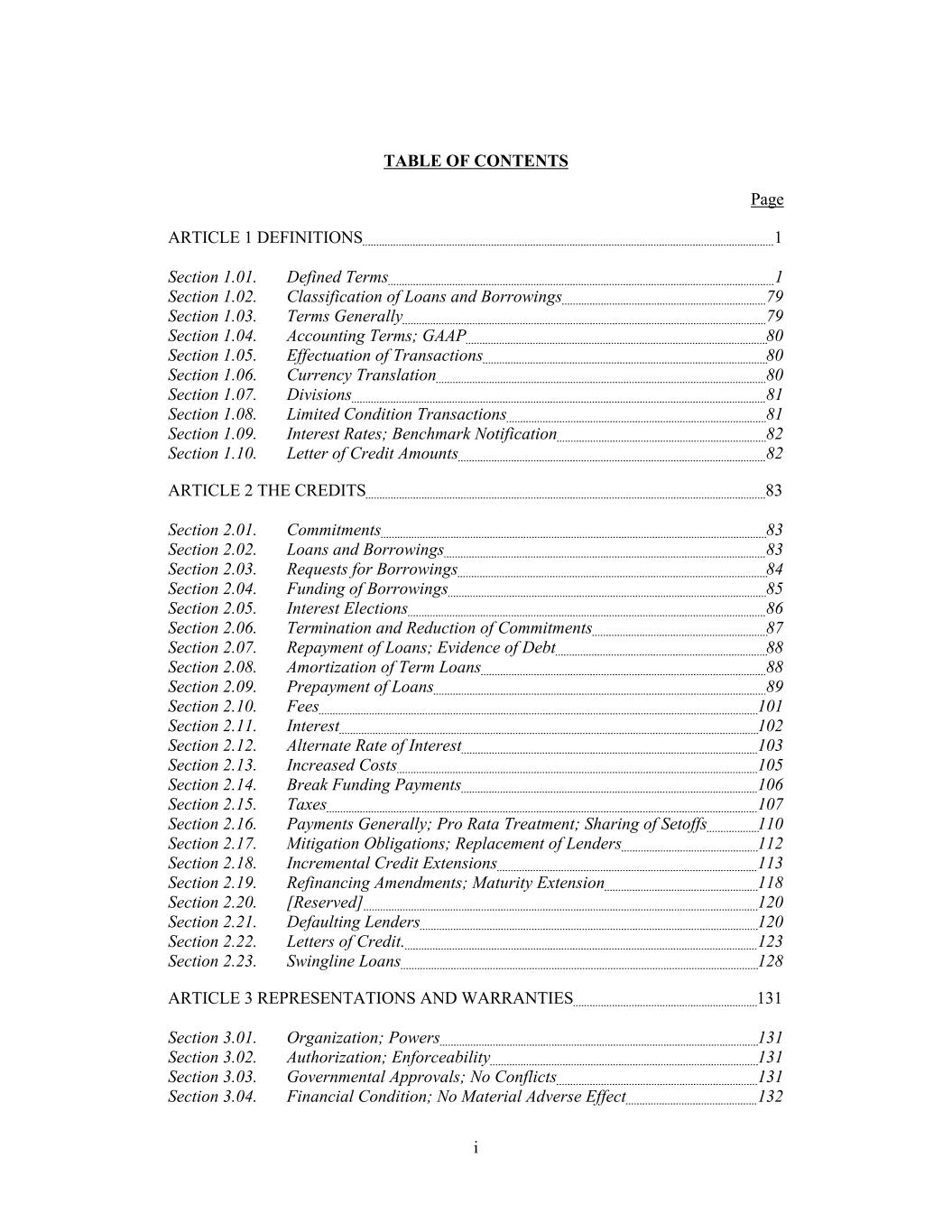 TABLE OF CONTENTS Page ARTICLE 1 DEFINITIONS 1 Section 1.01. Defined Terms 1 Section 1.02. Classification of Loans and Borrowings 79 Section 1.03. Terms Generally 79 Section 1.04. Accounting Terms; GAAP 80 Section 1.05. Effectuation of Transactions 80 Section 1.06. Currency Translation 80 Section 1.07. Divisions 81 Section 1.08. Limited Condition Transactions 81 Section 1.09. Interest Rates; Benchmark Notification 82 Section 1.10. Letter of Credit Amounts 82 ARTICLE 2 THE CREDITS 83 Section 2.01. Commitments 83 Section 2.02. Loans and Borrowings 83 Section 2.03. Requests for Borrowings 84 Section 2.04. Funding of Borrowings 85 Section 2.05. Interest Elections 86 Section 2.06. Termination and Reduction of Commitments 87 Section 2.07. Repayment of Loans; Evidence of Debt 88 Section 2.08. Amortization of Term Loans 88 Section 2.09. Prepayment of Loans 89 Section 2.10. Fees 101 Section 2.11. Interest 102 Section 2.12. Alternate Rate of Interest 103 Section 2.13. Increased Costs 105 Section 2.14. Break Funding Payments 106 Section 2.15. Taxes 107 Section 2.16. Payments Generally; Pro Rata Treatment; Sharing of Setoffs 110 Section 2.17. Mitigation Obligations; Replacement of Lenders 112 Section 2.18. Incremental Credit Extensions 113 Section 2.19. Refinancing Amendments; Maturity Extension 118 Section 2.20. [Reserved] 120 Section 2.21. Defaulting Lenders 120 Section 2.22. Letters of Credit. 123 Section 2.23. Swingline Loans 128 ARTICLE 3 REPRESENTATIONS AND WARRANTIES 131 Section 3.01. Organization; Powers 131 Section 3.02. Authorization; Enforceability 131 Section 3.03. Governmental Approvals; No Conflicts 131 Section 3.04. Financial Condition; No Material Adverse Effect 132 i