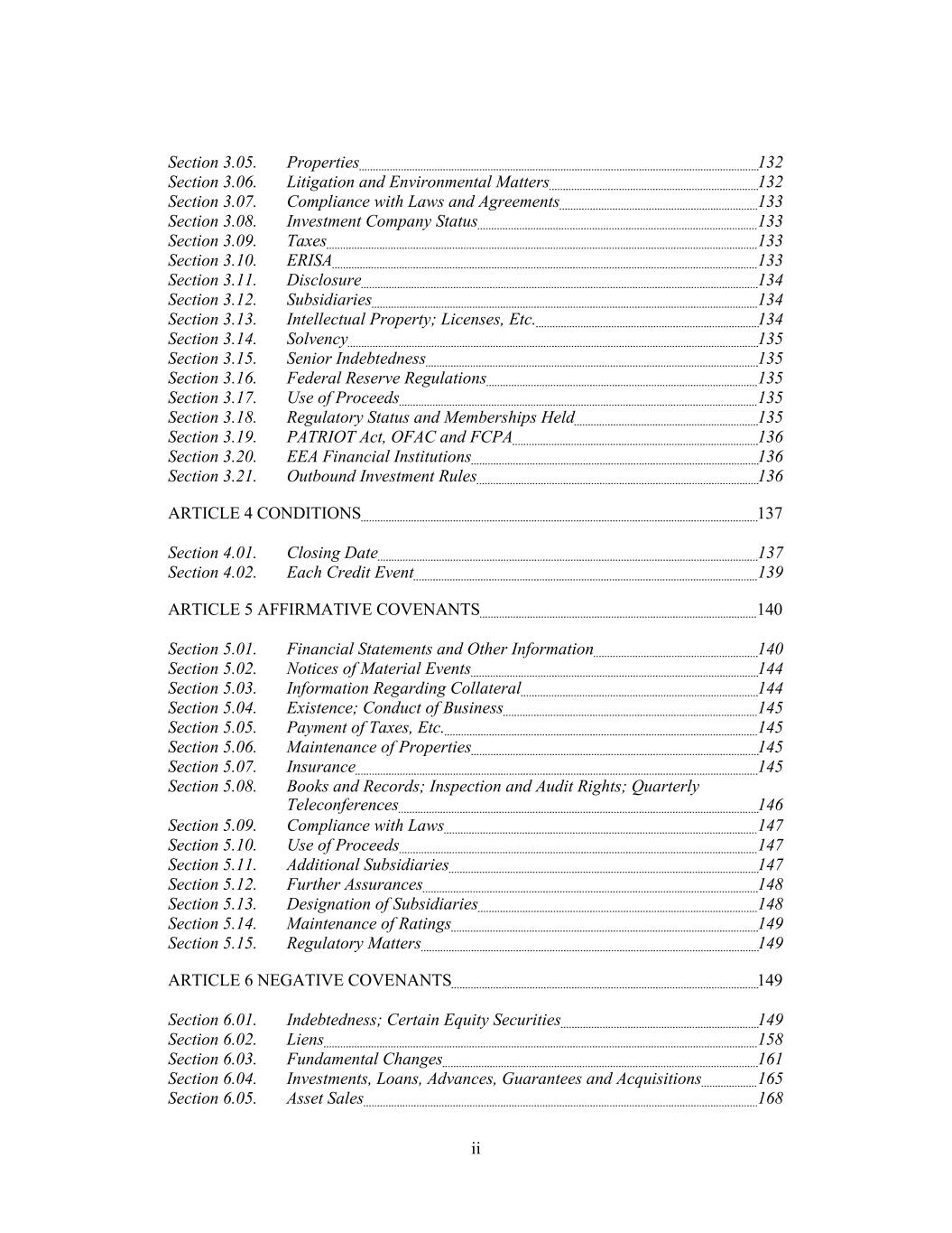 Section 3.05. Properties 132 Section 3.06. Litigation and Environmental Matters 132 Section 3.07. Compliance with Laws and Agreements 133 Section 3.08. Investment Company Status 133 Section 3.09. Taxes 133 Section 3.10. ERISA 133 Section 3.11. Disclosure 134 Section 3.12. Subsidiaries 134 Section 3.13. Intellectual Property; Licenses, Etc. 134 Section 3.14. Solvency 135 Section 3.15. Senior Indebtedness 135 Section 3.16. Federal Reserve Regulations 135 Section 3.17. Use of Proceeds 135 Section 3.18. Regulatory Status and Memberships Held 135 Section 3.19. PATRIOT Act, OFAC and FCPA 136 Section 3.20. EEA Financial Institutions 136 Section 3.21. Outbound Investment Rules 136 ARTICLE 4 CONDITIONS 137 Section 4.01. Closing Date 137 Section 4.02. Each Credit Event 139 ARTICLE 5 AFFIRMATIVE COVENANTS 140 Section 5.01. Financial Statements and Other Information 140 Section 5.02. Notices of Material Events 144 Section 5.03. Information Regarding Collateral 144 Section 5.04. Existence; Conduct of Business 145 Section 5.05. Payment of Taxes, Etc. 145 Section 5.06. Maintenance of Properties 145 Section 5.07. Insurance 145 Section 5.08. Books and Records; Inspection and Audit Rights; Quarterly Teleconferences 146 Section 5.09. Compliance with Laws 147 Section 5.10. Use of Proceeds 147 Section 5.11. Additional Subsidiaries 147 Section 5.12. Further Assurances 148 Section 5.13. Designation of Subsidiaries 148 Section 5.14. Maintenance of Ratings 149 Section 5.15. Regulatory Matters 149 ARTICLE 6 NEGATIVE COVENANTS 149 Section 6.01. Indebtedness; Certain Equity Securities 149 Section 6.02. Liens 158 Section 6.03. Fundamental Changes 161 Section 6.04. Investments, Loans, Advances, Guarantees and Acquisitions 165 Section 6.05. Asset Sales 168 ii