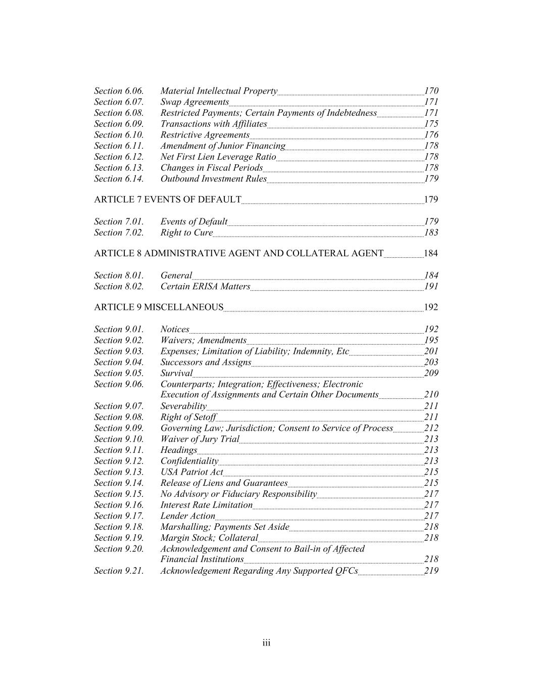Section 6.06. Material Intellectual Property 170 Section 6.07. Swap Agreements 171 Section 6.08. Restricted Payments; Certain Payments of Indebtedness 171 Section 6.09. Transactions with Affiliates 175 Section 6.10. Restrictive Agreements 176 Section 6.11. Amendment of Junior Financing 178 Section 6.12. Net First Lien Leverage Ratio 178 Section 6.13. Changes in Fiscal Periods 178 Section 6.14. Outbound Investment Rules 179 ARTICLE 7 EVENTS OF DEFAULT 179 Section 7.01. Events of Default 179 Section 7.02. Right to Cure 183 ARTICLE 8 ADMINISTRATIVE AGENT AND COLLATERAL AGENT 184 Section 8.01. General 184 Section 8.02. Certain ERISA Matters 191 ARTICLE 9 MISCELLANEOUS 192 Section 9.01. Notices 192 Section 9.02. Waivers; Amendments 195 Section 9.03. Expenses; Limitation of Liability; Indemnity, Etc 201 Section 9.04. Successors and Assigns 203 Section 9.05. Survival 209 Section 9.06. Counterparts; Integration; Effectiveness; Electronic Execution of Assignments and Certain Other Documents 210 Section 9.07. Severability 211 Section 9.08. Right of Setoff 211 Section 9.09. Governing Law; Jurisdiction; Consent to Service of Process 212 Section 9.10. Waiver of Jury Trial 213 Section 9.11. Headings 213 Section 9.12. Confidentiality 213 Section 9.13. USA Patriot Act 215 Section 9.14. Release of Liens and Guarantees 215 Section 9.15. No Advisory or Fiduciary Responsibility 217 Section 9.16. Interest Rate Limitation 217 Section 9.17. Lender Action 217 Section 9.18. Marshalling; Payments Set Aside 218 Section 9.19. Margin Stock; Collateral 218 Section 9.20. Acknowledgement and Consent to Bail-in of Affected Financial Institutions 218 Section 9.21. Acknowledgement Regarding Any Supported QFCs 219 iii