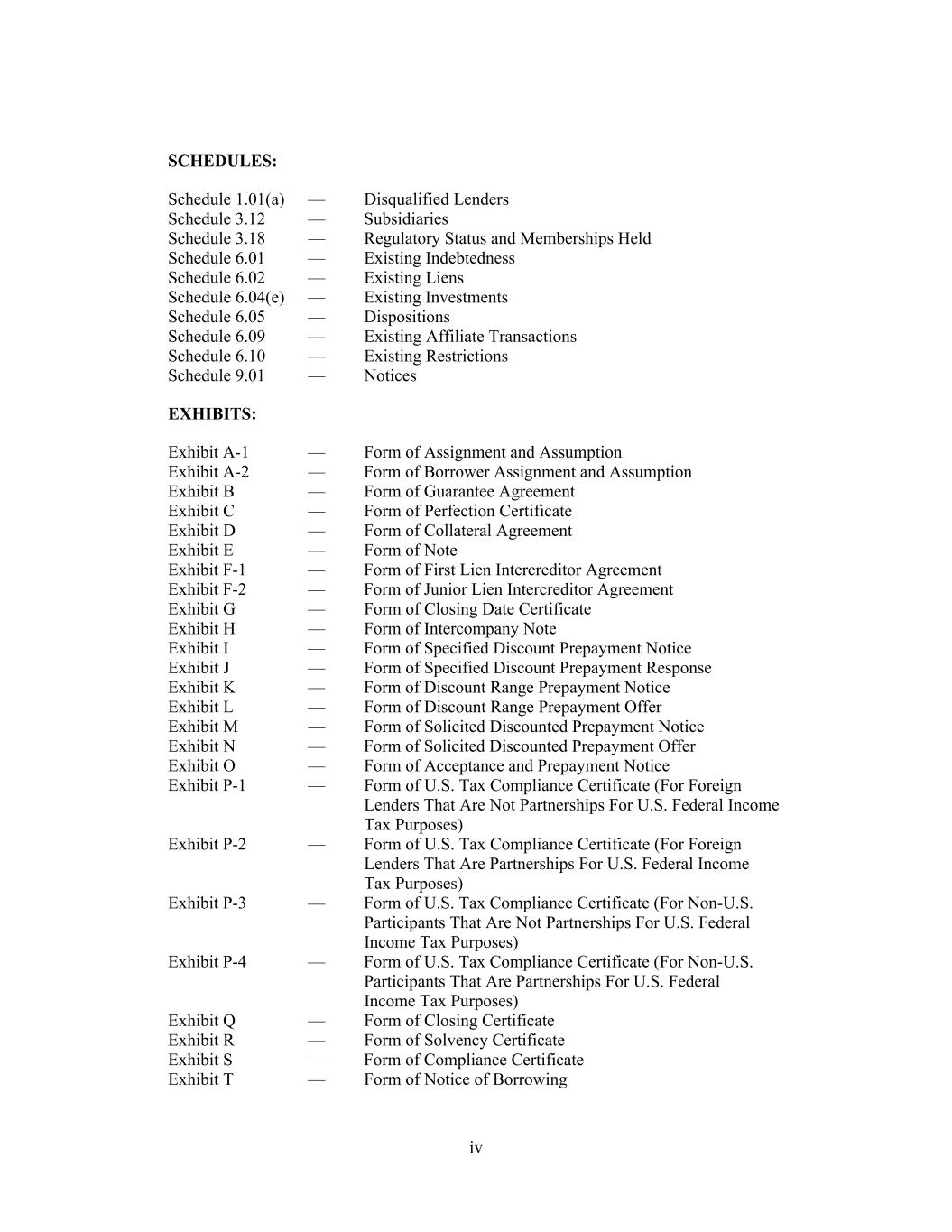 SCHEDULES: Schedule 1.01(a) — Disqualified Lenders Schedule 3.12 — Subsidiaries Schedule 3.18 — Regulatory Status and Memberships Held Schedule 6.01 — Existing Indebtedness Schedule 6.02 — Existing Liens Schedule 6.04(e) — Existing Investments Schedule 6.05 — Dispositions Schedule 6.09 — Existing Affiliate Transactions Schedule 6.10 — Existing Restrictions Schedule 9.01 — Notices EXHIBITS: Exhibit A-1 — Form of Assignment and Assumption Exhibit A-2 — Form of Borrower Assignment and Assumption Exhibit B — Form of Guarantee Agreement Exhibit C — Form of Perfection Certificate Exhibit D — Form of Collateral Agreement Exhibit E — Form of Note Exhibit F-1 — Form of First Lien Intercreditor Agreement Exhibit F-2 — Form of Junior Lien Intercreditor Agreement Exhibit G — Form of Closing Date Certificate Exhibit H — Form of Intercompany Note Exhibit I — Form of Specified Discount Prepayment Notice Exhibit J — Form of Specified Discount Prepayment Response Exhibit K — Form of Discount Range Prepayment Notice Exhibit L — Form of Discount Range Prepayment Offer Exhibit M — Form of Solicited Discounted Prepayment Notice Exhibit N — Form of Solicited Discounted Prepayment Offer Exhibit O — Form of Acceptance and Prepayment Notice Exhibit P-1 — Form of U.S. Tax Compliance Certificate (For Foreign Lenders That Are Not Partnerships For U.S. Federal Income Tax Purposes) Exhibit P-2 — Form of U.S. Tax Compliance Certificate (For Foreign Lenders That Are Partnerships For U.S. Federal Income Tax Purposes) Exhibit P-3 — Form of U.S. Tax Compliance Certificate (For Non-U.S. Participants That Are Not Partnerships For U.S. Federal Income Tax Purposes) Exhibit P-4 — Form of U.S. Tax Compliance Certificate (For Non-U.S. Participants That Are Partnerships For U.S. Federal Income Tax Purposes) Exhibit Q — Form of Closing Certificate Exhibit R — Form of Solvency Certificate Exhibit S — Form of Compliance Certificate Exhibit T — Form of Notice of Borrowing iv