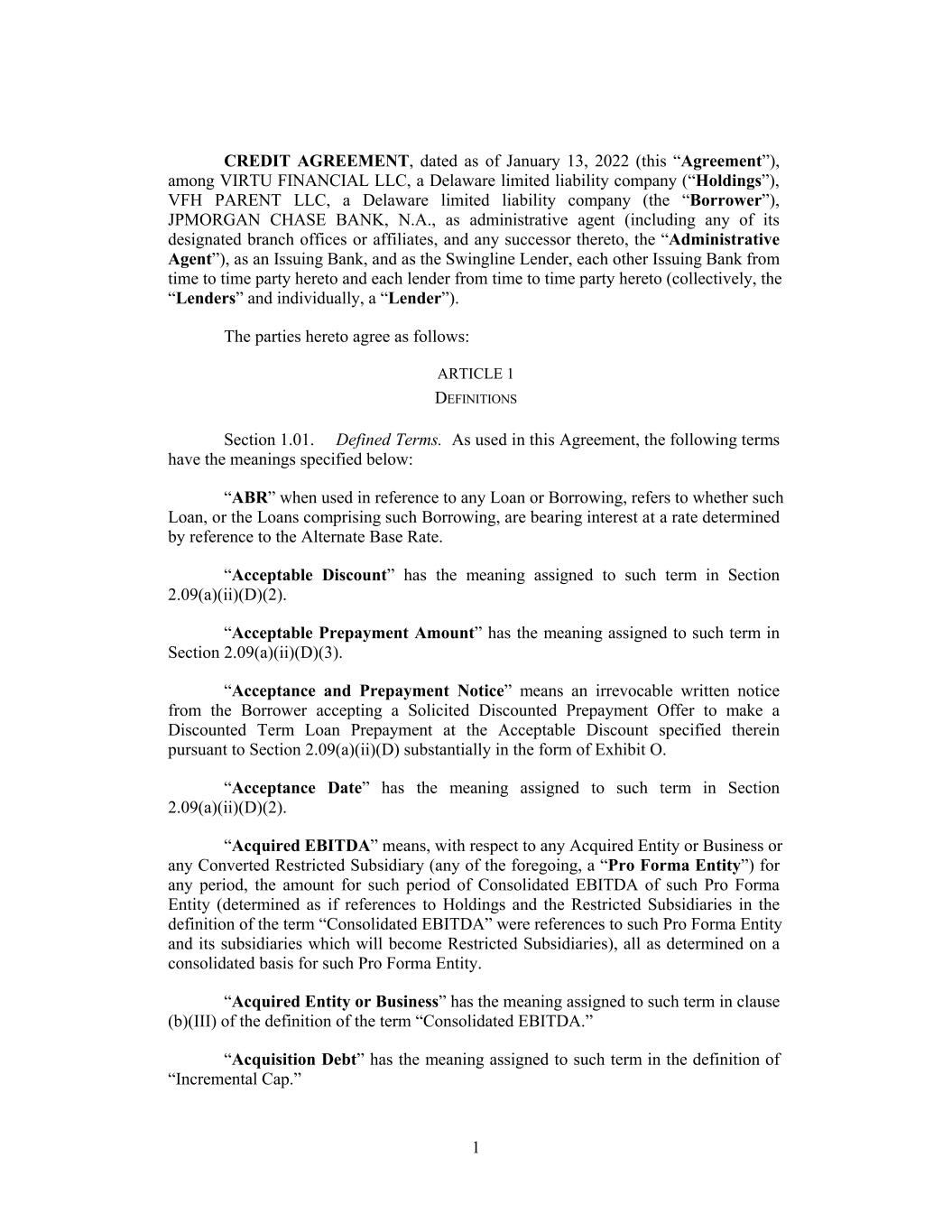 CREDIT AGREEMENT, dated as of January 13, 2022 (this “Agreement”), among VIRTU FINANCIAL LLC, a Delaware limited liability company (“Holdings”), VFH PARENT LLC, a Delaware limited liability company (the “Borrower”), JPMORGAN CHASE BANK, N.A., as administrative agent (including any of its designated branch offices or affiliates, and any successor thereto, the “Administrative Agent”), as an Issuing Bank, and as the Swingline Lender, each other Issuing Bank from time to time party hereto and each lender from time to time party hereto (collectively, the “Lenders” and individually, a “Lender”). The parties hereto agree as follows: ARTICLE 1 DEFINITIONS Section 1.01. Defined Terms. As used in this Agreement, the following terms have the meanings specified below: “ABR” when used in reference to any Loan or Borrowing, refers to whether such Loan, or the Loans comprising such Borrowing, are bearing interest at a rate determined by reference to the Alternate Base Rate. “Acceptable Discount” has the meaning assigned to such term in Section 2.09(a)(ii)(D)(2). “Acceptable Prepayment Amount” has the meaning assigned to such term in Section 2.09(a)(ii)(D)(3). “Acceptance and Prepayment Notice” means an irrevocable written notice from the Borrower accepting a Solicited Discounted Prepayment Offer to make a Discounted Term Loan Prepayment at the Acceptable Discount specified therein pursuant to Section 2.09(a)(ii)(D) substantially in the form of Exhibit O. “Acceptance Date” has the meaning assigned to such term in Section 2.09(a)(ii)(D)(2). “Acquired EBITDA” means, with respect to any Acquired Entity or Business or any Converted Restricted Subsidiary (any of the foregoing, a “Pro Forma Entity”) for any period, the amount for such period of Consolidated EBITDA of such Pro Forma Entity (determined as if references to Holdings and the Restricted Subsidiaries in the definition of the term “Consolidated EBITDA” were references to such Pro Forma Entity and its subsidiaries which will become Restricted Subsidiaries), all as determined on a consolidated basis for such Pro Forma Entity. “Acquired Entity or Business” has the meaning assigned to such term in clause (b)(III) of the definition of the term “Consolidated EBITDA.” “Acquisition Debt” has the meaning assigned to such term in the definition of “Incremental Cap.” 1