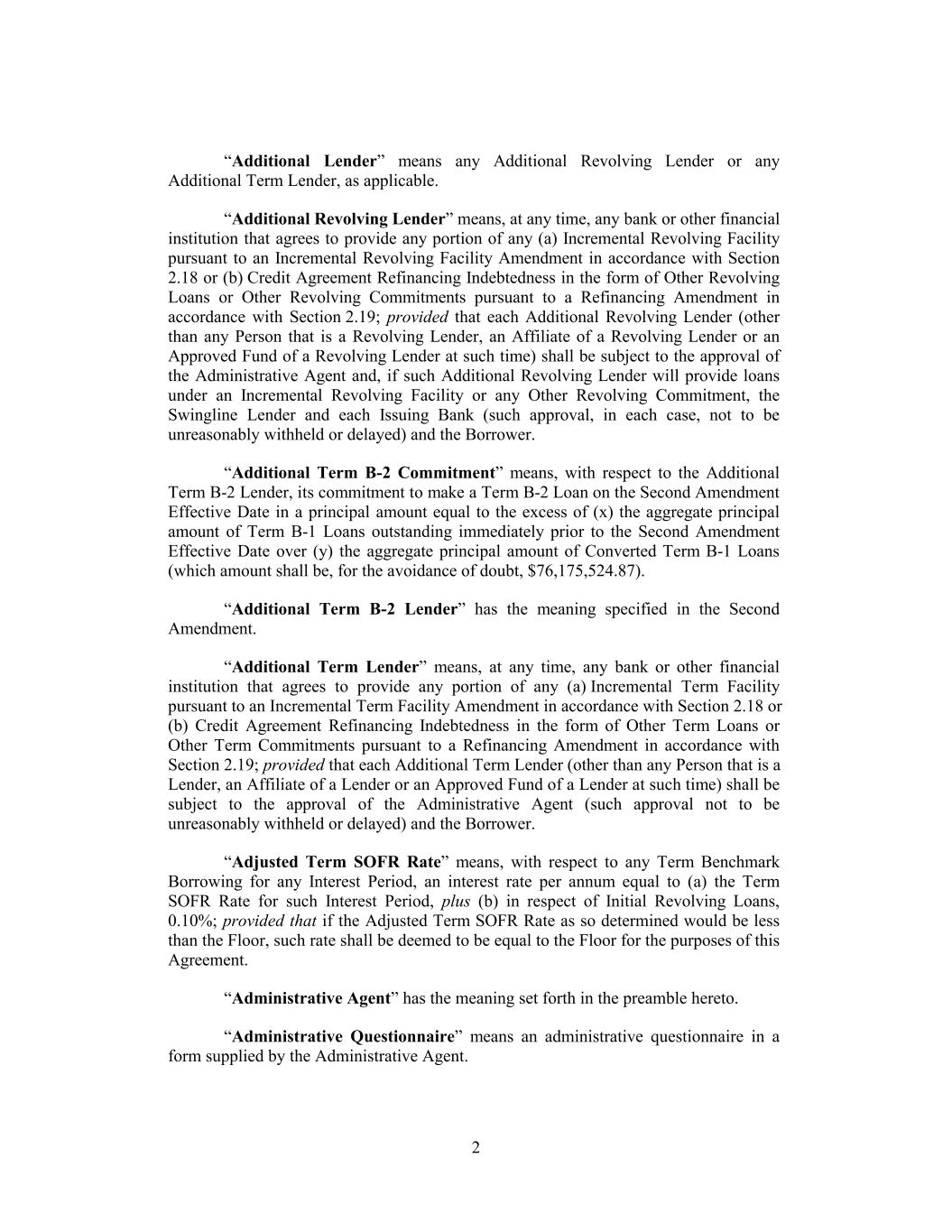 “Additional Lender” means any Additional Revolving Lender or any Additional Term Lender, as applicable. “Additional Revolving Lender” means, at any time, any bank or other financial institution that agrees to provide any portion of any (a) Incremental Revolving Facility pursuant to an Incremental Revolving Facility Amendment in accordance with Section 2.18 or (b) Credit Agreement Refinancing Indebtedness in the form of Other Revolving Loans or Other Revolving Commitments pursuant to a Refinancing Amendment in accordance with Section 2.19; provided that each Additional Revolving Lender (other than any Person that is a Revolving Lender, an Affiliate of a Revolving Lender or an Approved Fund of a Revolving Lender at such time) shall be subject to the approval of the Administrative Agent and, if such Additional Revolving Lender will provide loans under an Incremental Revolving Facility or any Other Revolving Commitment, the Swingline Lender and each Issuing Bank (such approval, in each case, not to be unreasonably withheld or delayed) and the Borrower. “Additional Term B-2 Commitment” means, with respect to the Additional Term B-2 Lender, its commitment to make a Term B-2 Loan on the Second Amendment Effective Date in a principal amount equal to the excess of (x) the aggregate principal amount of Term B-1 Loans outstanding immediately prior to the Second Amendment Effective Date over (y) the aggregate principal amount of Converted Term B-1 Loans (which amount shall be, for the avoidance of doubt, $76,175,524.87). “Additional Term B-2 Lender” has the meaning specified in the Second Amendment. “Additional Term Lender” means, at any time, any bank or other financial institution that agrees to provide any portion of any (a) Incremental Term Facility pursuant to an Incremental Term Facility Amendment in accordance with Section 2.18 or (b) Credit Agreement Refinancing Indebtedness in the form of Other Term Loans or Other Term Commitments pursuant to a Refinancing Amendment in accordance with Section 2.19; provided that each Additional Term Lender (other than any Person that is a Lender, an Affiliate of a Lender or an Approved Fund of a Lender at such time) shall be subject to the approval of the Administrative Agent (such approval not to be unreasonably withheld or delayed) and the Borrower. “Adjusted Term SOFR Rate” means, with respect to any Term Benchmark Borrowing for any Interest Period, an interest rate per annum equal to (a) the Term SOFR Rate for such Interest Period, plus (b) in respect of Initial Revolving Loans, 0.10%; provided that if the Adjusted Term SOFR Rate as so determined would be less than the Floor, such rate shall be deemed to be equal to the Floor for the purposes of this Agreement. “Administrative Agent” has the meaning set forth in the preamble hereto. “Administrative Questionnaire” means an administrative questionnaire in a form supplied by the Administrative Agent. 2