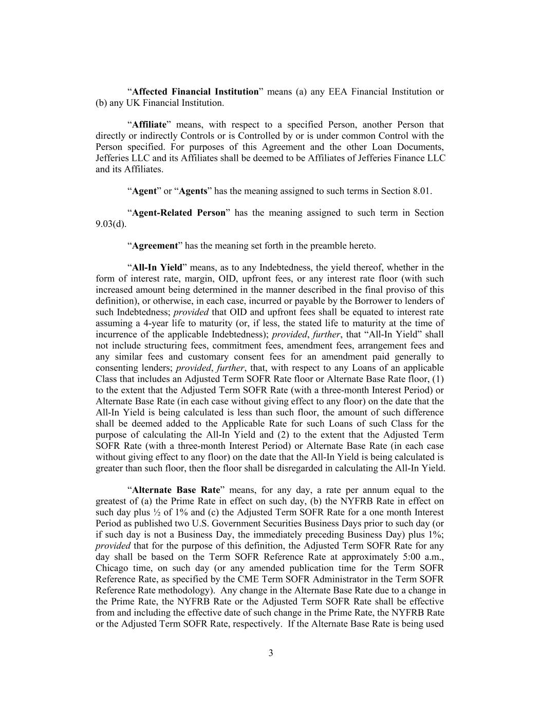 “Affected Financial Institution” means (a) any EEA Financial Institution or (b) any UK Financial Institution. “Affiliate” means, with respect to a specified Person, another Person that directly or indirectly Controls or is Controlled by or is under common Control with the Person specified. For purposes of this Agreement and the other Loan Documents, Jefferies LLC and its Affiliates shall be deemed to be Affiliates of Jefferies Finance LLC and its Affiliates. “Agent” or “Agents” has the meaning assigned to such terms in Section 8.01. “Agent-Related Person” has the meaning assigned to such term in Section 9.03(d). “Agreement” has the meaning set forth in the preamble hereto. “All-In Yield” means, as to any Indebtedness, the yield thereof, whether in the form of interest rate, margin, OID, upfront fees, or any interest rate floor (with such increased amount being determined in the manner described in the final proviso of this definition), or otherwise, in each case, incurred or payable by the Borrower to lenders of such Indebtedness; provided that OID and upfront fees shall be equated to interest rate assuming a 4-year life to maturity (or, if less, the stated life to maturity at the time of incurrence of the applicable Indebtedness); provided, further, that “All-In Yield” shall not include structuring fees, commitment fees, amendment fees, arrangement fees and any similar fees and customary consent fees for an amendment paid generally to consenting lenders; provided, further, that, with respect to any Loans of an applicable Class that includes an Adjusted Term SOFR Rate floor or Alternate Base Rate floor, (1) to the extent that the Adjusted Term SOFR Rate (with a three-month Interest Period) or Alternate Base Rate (in each case without giving effect to any floor) on the date that the All-In Yield is being calculated is less than such floor, the amount of such difference shall be deemed added to the Applicable Rate for such Loans of such Class for the purpose of calculating the All-In Yield and (2) to the extent that the Adjusted Term SOFR Rate (with a three-month Interest Period) or Alternate Base Rate (in each case without giving effect to any floor) on the date that the All-In Yield is being calculated is greater than such floor, then the floor shall be disregarded in calculating the All-In Yield. “Alternate Base Rate” means, for any day, a rate per annum equal to the greatest of (a) the Prime Rate in effect on such day, (b) the NYFRB Rate in effect on such day plus ½ of 1% and (c) the Adjusted Term SOFR Rate for a one month Interest Period as published two U.S. Government Securities Business Days prior to such day (or if such day is not a Business Day, the immediately preceding Business Day) plus 1%; provided that for the purpose of this definition, the Adjusted Term SOFR Rate for any day shall be based on the Term SOFR Reference Rate at approximately 5:00 a.m., Chicago time, on such day (or any amended publication time for the Term SOFR Reference Rate, as specified by the CME Term SOFR Administrator in the Term SOFR Reference Rate methodology). Any change in the Alternate Base Rate due to a change in the Prime Rate, the NYFRB Rate or the Adjusted Term SOFR Rate shall be effective from and including the effective date of such change in the Prime Rate, the NYFRB Rate or the Adjusted Term SOFR Rate, respectively. If the Alternate Base Rate is being used 3