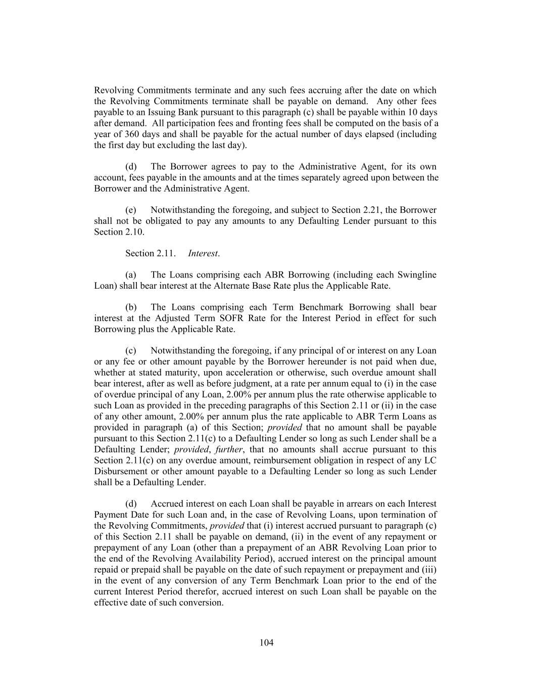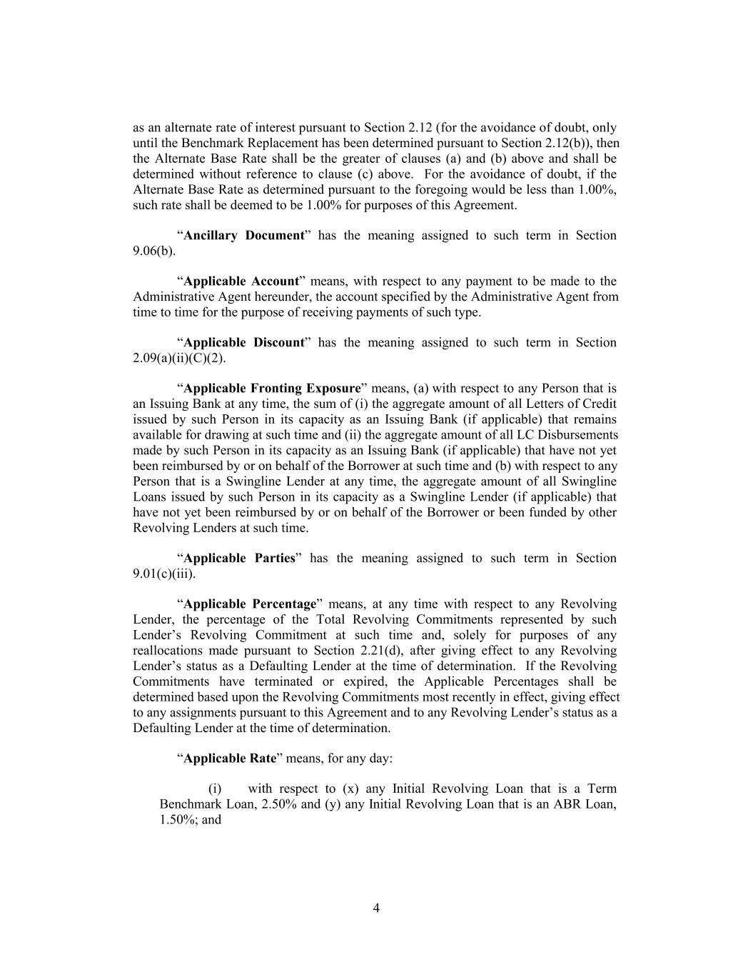 as an alternate rate of interest pursuant to Section 2.12 (for the avoidance of doubt, only until the Benchmark Replacement has been determined pursuant to Section 2.12(b)), then the Alternate Base Rate shall be the greater of clauses (a) and (b) above and shall be determined without reference to clause (c) above. For the avoidance of doubt, if the Alternate Base Rate as determined pursuant to the foregoing would be less than 1.00%, such rate shall be deemed to be 1.00% for purposes of this Agreement. “Ancillary Document” has the meaning assigned to such term in Section 9.06(b). “Applicable Account” means, with respect to any payment to be made to the Administrative Agent hereunder, the account specified by the Administrative Agent from time to time for the purpose of receiving payments of such type. “Applicable Discount” has the meaning assigned to such term in Section 2.09(a)(ii)(C)(2). “Applicable Fronting Exposure” means, (a) with respect to any Person that is an Issuing Bank at any time, the sum of (i) the aggregate amount of all Letters of Credit issued by such Person in its capacity as an Issuing Bank (if applicable) that remains available for drawing at such time and (ii) the aggregate amount of all LC Disbursements made by such Person in its capacity as an Issuing Bank (if applicable) that have not yet been reimbursed by or on behalf of the Borrower at such time and (b) with respect to any Person that is a Swingline Lender at any time, the aggregate amount of all Swingline Loans issued by such Person in its capacity as a Swingline Lender (if applicable) that have not yet been reimbursed by or on behalf of the Borrower or been funded by other Revolving Lenders at such time. “Applicable Parties” has the meaning assigned to such term in Section 9.01(c)(iii). “Applicable Percentage” means, at any time with respect to any Revolving Lender, the percentage of the Total Revolving Commitments represented by such Lender’s Revolving Commitment at such time and, solely for purposes of any reallocations made pursuant to Section 2.21(d), after giving effect to any Revolving Lender’s status as a Defaulting Lender at the time of determination. If the Revolving Commitments have terminated or expired, the Applicable Percentages shall be determined based upon the Revolving Commitments most recently in effect, giving effect to any assignments pursuant to this Agreement and to any Revolving Lender’s status as a Defaulting Lender at the time of determination. “Applicable Rate” means, for any day: (i) with respect to (x) any Initial Revolving Loan that is a Term Benchmark Loan, 2.50% and (y) any Initial Revolving Loan that is an ABR Loan, 1.50%; and 4