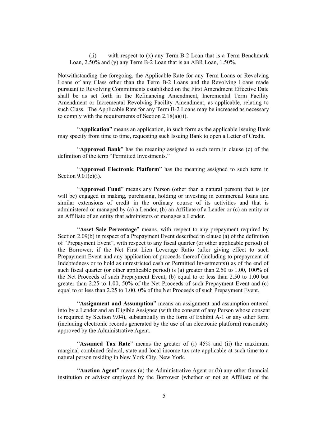 (ii) with respect to (x) any Term B-2 Loan that is a Term Benchmark Loan, 2.50% and (y) any Term B-2 Loan that is an ABR Loan, 1.50%. Notwithstanding the foregoing, the Applicable Rate for any Term Loans or Revolving Loans of any Class other than the Term B-2 Loans and the Revolving Loans made pursuant to Revolving Commitments established on the First Amendment Effective Date shall be as set forth in the Refinancing Amendment, Incremental Term Facility Amendment or Incremental Revolving Facility Amendment, as applicable, relating to such Class. The Applicable Rate for any Term B-2 Loans may be increased as necessary to comply with the requirements of Section 2.18(a)(ii). “Application” means an application, in such form as the applicable Issuing Bank may specify from time to time, requesting such Issuing Bank to open a Letter of Credit. “Approved Bank” has the meaning assigned to such term in clause (c) of the definition of the term “Permitted Investments.” “Approved Electronic Platform” has the meaning assigned to such term in Section 9.01(c)(i). “Approved Fund” means any Person (other than a natural person) that is (or will be) engaged in making, purchasing, holding or investing in commercial loans and similar extensions of credit in the ordinary course of its activities and that is administered or managed by (a) a Lender, (b) an Affiliate of a Lender or (c) an entity or an Affiliate of an entity that administers or manages a Lender. “Asset Sale Percentage” means, with respect to any prepayment required by Section 2.09(b) in respect of a Prepayment Event described in clause (a) of the definition of “Prepayment Event”, with respect to any fiscal quarter (or other applicable period) of the Borrower, if the Net First Lien Leverage Ratio (after giving effect to such Prepayment Event and any application of proceeds thereof (including to prepayment of Indebtedness or to hold as unrestricted cash or Permitted Investments)) as of the end of such fiscal quarter (or other applicable period) is (a) greater than 2.50 to 1.00, 100% of the Net Proceeds of such Prepayment Event, (b) equal to or less than 2.50 to 1.00 but greater than 2.25 to 1.00, 50% of the Net Proceeds of such Prepayment Event and (c) equal to or less than 2.25 to 1.00, 0% of the Net Proceeds of such Prepayment Event. “Assignment and Assumption” means an assignment and assumption entered into by a Lender and an Eligible Assignee (with the consent of any Person whose consent is required by Section 9.04), substantially in the form of Exhibit A-1 or any other form (including electronic records generated by the use of an electronic platform) reasonably approved by the Administrative Agent. “Assumed Tax Rate” means the greater of (i) 45% and (ii) the maximum marginal combined federal, state and local income tax rate applicable at such time to a natural person residing in New York City, New York. “Auction Agent” means (a) the Administrative Agent or (b) any other financial institution or advisor employed by the Borrower (whether or not an Affiliate of the 5