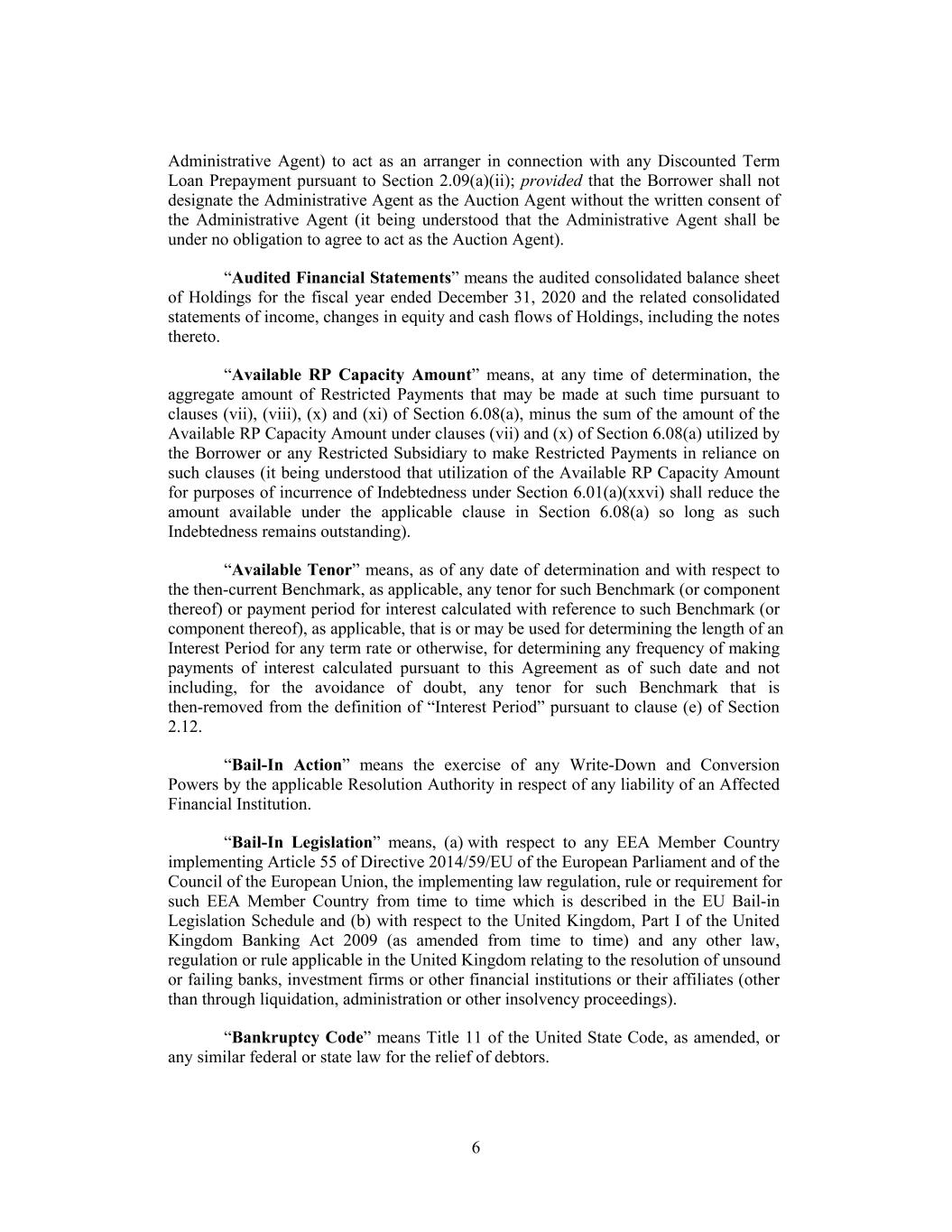 Administrative Agent) to act as an arranger in connection with any Discounted Term Loan Prepayment pursuant to Section 2.09(a)(ii); provided that the Borrower shall not designate the Administrative Agent as the Auction Agent without the written consent of the Administrative Agent (it being understood that the Administrative Agent shall be under no obligation to agree to act as the Auction Agent). “Audited Financial Statements” means the audited consolidated balance sheet of Holdings for the fiscal year ended December 31, 2020 and the related consolidated statements of income, changes in equity and cash flows of Holdings, including the notes thereto. “Available RP Capacity Amount” means, at any time of determination, the aggregate amount of Restricted Payments that may be made at such time pursuant to clauses (vii), (viii), (x) and (xi) of Section 6.08(a), minus the sum of the amount of the Available RP Capacity Amount under clauses (vii) and (x) of Section 6.08(a) utilized by the Borrower or any Restricted Subsidiary to make Restricted Payments in reliance on such clauses (it being understood that utilization of the Available RP Capacity Amount for purposes of incurrence of Indebtedness under Section 6.01(a)(xxvi) shall reduce the amount available under the applicable clause in Section 6.08(a) so long as such Indebtedness remains outstanding). “Available Tenor” means, as of any date of determination and with respect to the then-current Benchmark, as applicable, any tenor for such Benchmark (or component thereof) or payment period for interest calculated with reference to such Benchmark (or component thereof), as applicable, that is or may be used for determining the length of an Interest Period for any term rate or otherwise, for determining any frequency of making payments of interest calculated pursuant to this Agreement as of such date and not including, for the avoidance of doubt, any tenor for such Benchmark that is then-removed from the definition of “Interest Period” pursuant to clause (e) of Section 2.12. “Bail-In Action” means the exercise of any Write-Down and Conversion Powers by the applicable Resolution Authority in respect of any liability of an Affected Financial Institution. “Bail-In Legislation” means, (a) with respect to any EEA Member Country implementing Article 55 of Directive 2014/59/EU of the European Parliament and of the Council of the European Union, the implementing law regulation, rule or requirement for such EEA Member Country from time to time which is described in the EU Bail-in Legislation Schedule and (b) with respect to the United Kingdom, Part I of the United Kingdom Banking Act 2009 (as amended from time to time) and any other law, regulation or rule applicable in the United Kingdom relating to the resolution of unsound or failing banks, investment firms or other financial institutions or their affiliates (other than through liquidation, administration or other insolvency proceedings). “Bankruptcy Code” means Title 11 of the United State Code, as amended, or any similar federal or state law for the relief of debtors. 6