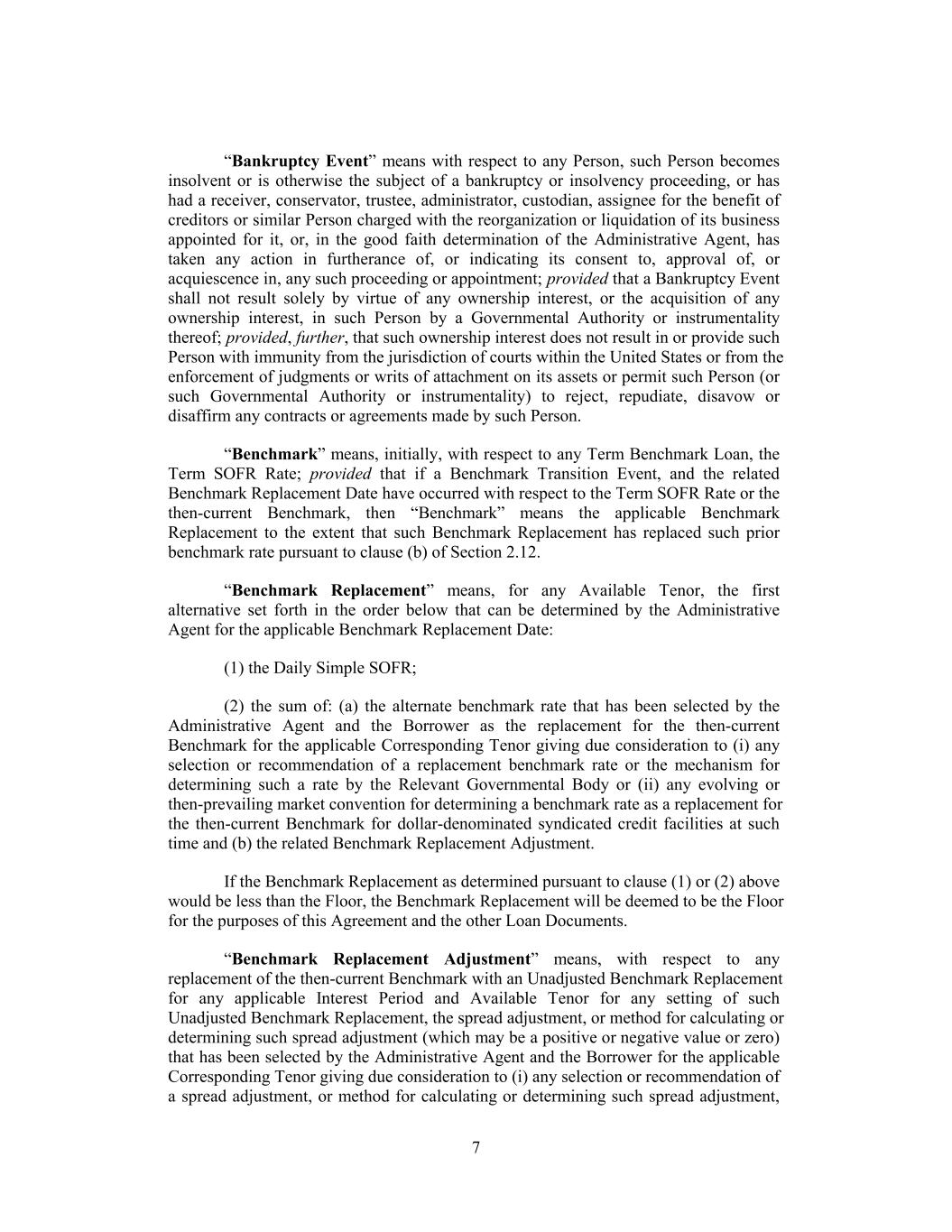 “Bankruptcy Event” means with respect to any Person, such Person becomes insolvent or is otherwise the subject of a bankruptcy or insolvency proceeding, or has had a receiver, conservator, trustee, administrator, custodian, assignee for the benefit of creditors or similar Person charged with the reorganization or liquidation of its business appointed for it, or, in the good faith determination of the Administrative Agent, has taken any action in furtherance of, or indicating its consent to, approval of, or acquiescence in, any such proceeding or appointment; provided that a Bankruptcy Event shall not result solely by virtue of any ownership interest, or the acquisition of any ownership interest, in such Person by a Governmental Authority or instrumentality thereof; provided, further, that such ownership interest does not result in or provide such Person with immunity from the jurisdiction of courts within the United States or from the enforcement of judgments or writs of attachment on its assets or permit such Person (or such Governmental Authority or instrumentality) to reject, repudiate, disavow or disaffirm any contracts or agreements made by such Person. “Benchmark” means, initially, with respect to any Term Benchmark Loan, the Term SOFR Rate; provided that if a Benchmark Transition Event, and the related Benchmark Replacement Date have occurred with respect to the Term SOFR Rate or the then-current Benchmark, then “Benchmark” means the applicable Benchmark Replacement to the extent that such Benchmark Replacement has replaced such prior benchmark rate pursuant to clause (b) of Section 2.12. “Benchmark Replacement” means, for any Available Tenor, the first alternative set forth in the order below that can be determined by the Administrative Agent for the applicable Benchmark Replacement Date: (1) the Daily Simple SOFR; (2) the sum of: (a) the alternate benchmark rate that has been selected by the Administrative Agent and the Borrower as the replacement for the then-current Benchmark for the applicable Corresponding Tenor giving due consideration to (i) any selection or recommendation of a replacement benchmark rate or the mechanism for determining such a rate by the Relevant Governmental Body or (ii) any evolving or then-prevailing market convention for determining a benchmark rate as a replacement for the then-current Benchmark for dollar-denominated syndicated credit facilities at such time and (b) the related Benchmark Replacement Adjustment. If the Benchmark Replacement as determined pursuant to clause (1) or (2) above would be less than the Floor, the Benchmark Replacement will be deemed to be the Floor for the purposes of this Agreement and the other Loan Documents. “Benchmark Replacement Adjustment” means, with respect to any replacement of the then-current Benchmark with an Unadjusted Benchmark Replacement for any applicable Interest Period and Available Tenor for any setting of such Unadjusted Benchmark Replacement, the spread adjustment, or method for calculating or determining such spread adjustment (which may be a positive or negative value or zero) that has been selected by the Administrative Agent and the Borrower for the applicable Corresponding Tenor giving due consideration to (i) any selection or recommendation of a spread adjustment, or method for calculating or determining such spread adjustment, 7