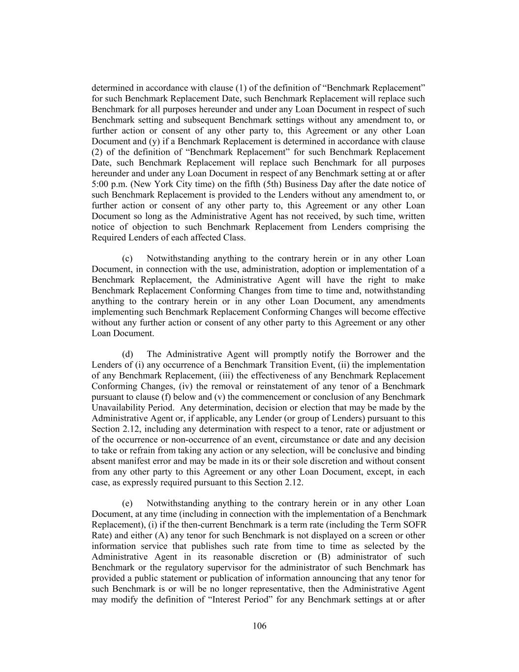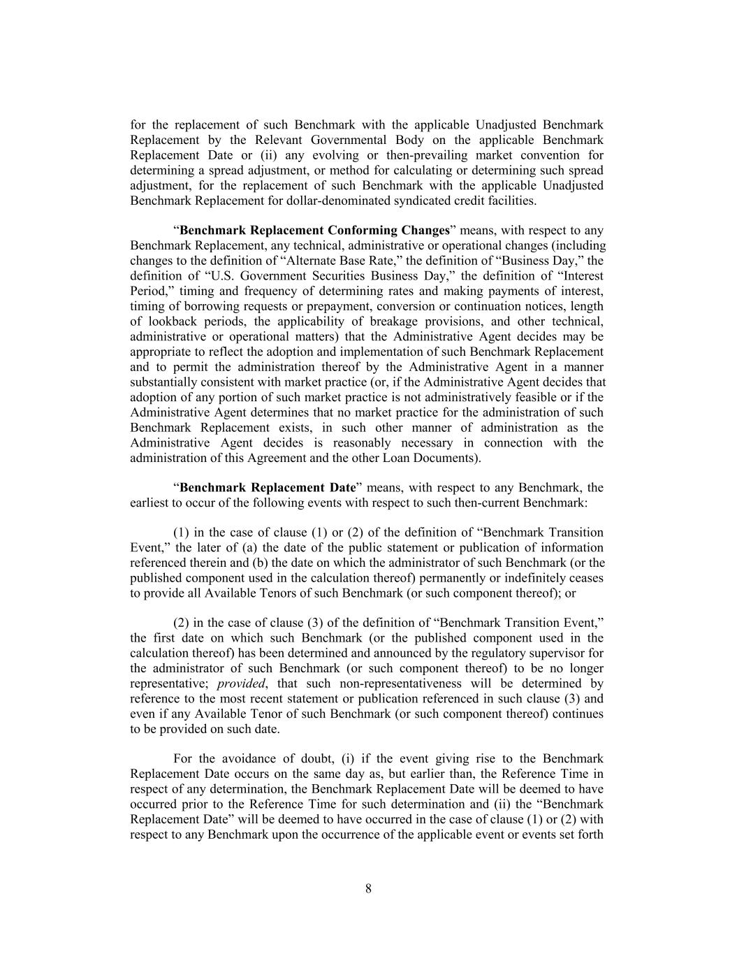 for the replacement of such Benchmark with the applicable Unadjusted Benchmark Replacement by the Relevant Governmental Body on the applicable Benchmark Replacement Date or (ii) any evolving or then-prevailing market convention for determining a spread adjustment, or method for calculating or determining such spread adjustment, for the replacement of such Benchmark with the applicable Unadjusted Benchmark Replacement for dollar-denominated syndicated credit facilities. “Benchmark Replacement Conforming Changes” means, with respect to any Benchmark Replacement, any technical, administrative or operational changes (including changes to the definition of “Alternate Base Rate,” the definition of “Business Day,” the definition of “U.S. Government Securities Business Day,” the definition of “Interest Period,” timing and frequency of determining rates and making payments of interest, timing of borrowing requests or prepayment, conversion or continuation notices, length of lookback periods, the applicability of breakage provisions, and other technical, administrative or operational matters) that the Administrative Agent decides may be appropriate to reflect the adoption and implementation of such Benchmark Replacement and to permit the administration thereof by the Administrative Agent in a manner substantially consistent with market practice (or, if the Administrative Agent decides that adoption of any portion of such market practice is not administratively feasible or if the Administrative Agent determines that no market practice for the administration of such Benchmark Replacement exists, in such other manner of administration as the Administrative Agent decides is reasonably necessary in connection with the administration of this Agreement and the other Loan Documents). “Benchmark Replacement Date” means, with respect to any Benchmark, the earliest to occur of the following events with respect to such then-current Benchmark: (1) in the case of clause (1) or (2) of the definition of “Benchmark Transition Event,” the later of (a) the date of the public statement or publication of information referenced therein and (b) the date on which the administrator of such Benchmark (or the published component used in the calculation thereof) permanently or indefinitely ceases to provide all Available Tenors of such Benchmark (or such component thereof); or (2) in the case of clause (3) of the definition of “Benchmark Transition Event,” the first date on which such Benchmark (or the published component used in the calculation thereof) has been determined and announced by the regulatory supervisor for the administrator of such Benchmark (or such component thereof) to be no longer representative; provided, that such non-representativeness will be determined by reference to the most recent statement or publication referenced in such clause (3) and even if any Available Tenor of such Benchmark (or such component thereof) continues to be provided on such date. For the avoidance of doubt, (i) if the event giving rise to the Benchmark Replacement Date occurs on the same day as, but earlier than, the Reference Time in respect of any determination, the Benchmark Replacement Date will be deemed to have occurred prior to the Reference Time for such determination and (ii) the “Benchmark Replacement Date” will be deemed to have occurred in the case of clause (1) or (2) with respect to any Benchmark upon the occurrence of the applicable event or events set forth 8