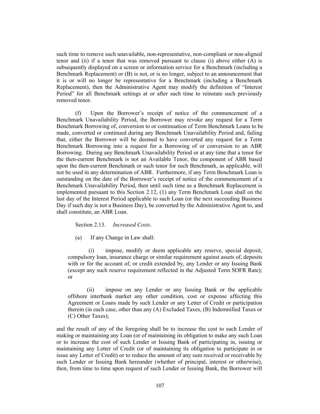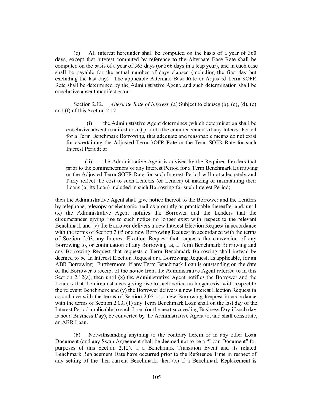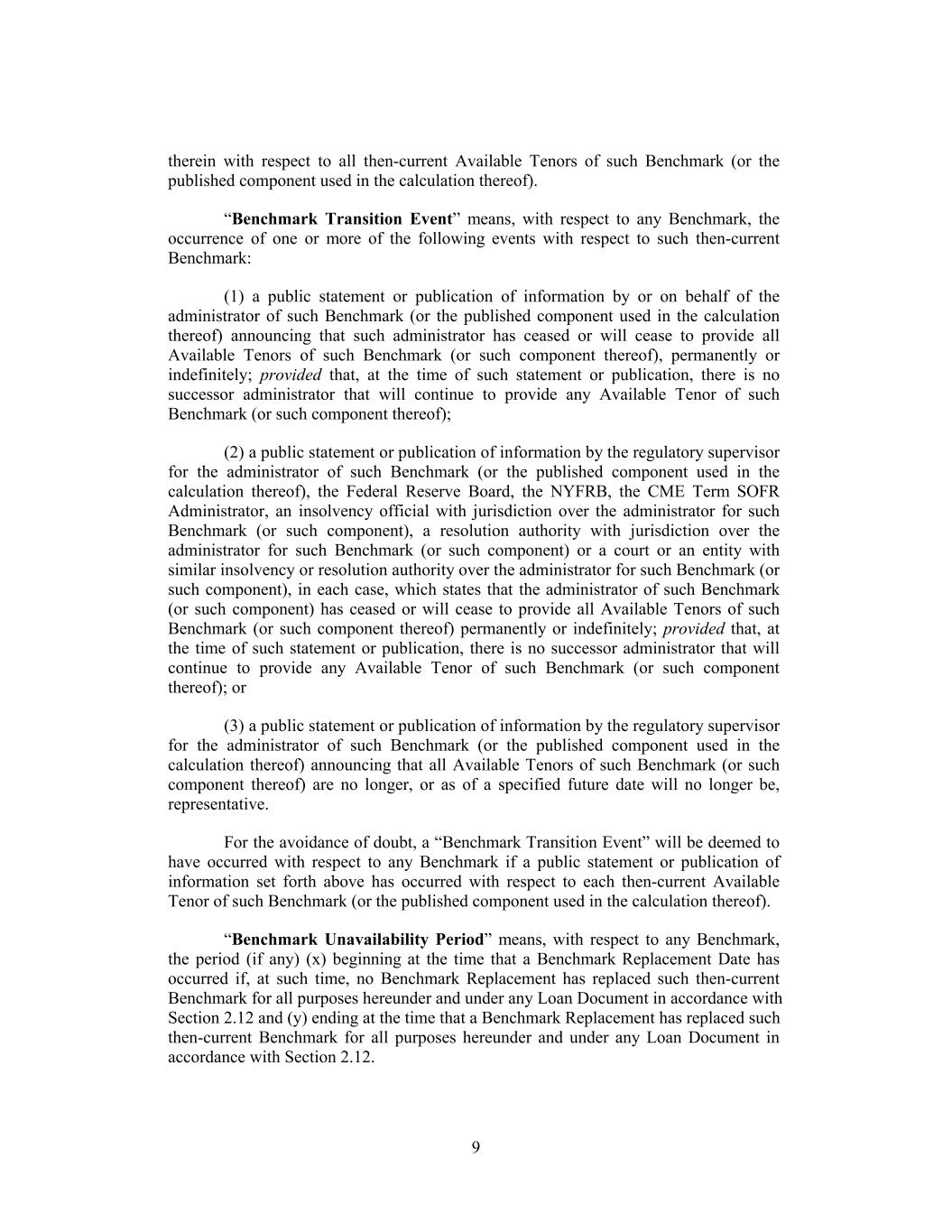 therein with respect to all then-current Available Tenors of such Benchmark (or the published component used in the calculation thereof). “Benchmark Transition Event” means, with respect to any Benchmark, the occurrence of one or more of the following events with respect to such then-current Benchmark: (1) a public statement or publication of information by or on behalf of the administrator of such Benchmark (or the published component used in the calculation thereof) announcing that such administrator has ceased or will cease to provide all Available Tenors of such Benchmark (or such component thereof), permanently or indefinitely; provided that, at the time of such statement or publication, there is no successor administrator that will continue to provide any Available Tenor of such Benchmark (or such component thereof); (2) a public statement or publication of information by the regulatory supervisor for the administrator of such Benchmark (or the published component used in the calculation thereof), the Federal Reserve Board, the NYFRB, the CME Term SOFR Administrator, an insolvency official with jurisdiction over the administrator for such Benchmark (or such component), a resolution authority with jurisdiction over the administrator for such Benchmark (or such component) or a court or an entity with similar insolvency or resolution authority over the administrator for such Benchmark (or such component), in each case, which states that the administrator of such Benchmark (or such component) has ceased or will cease to provide all Available Tenors of such Benchmark (or such component thereof) permanently or indefinitely; provided that, at the time of such statement or publication, there is no successor administrator that will continue to provide any Available Tenor of such Benchmark (or such component thereof); or (3) a public statement or publication of information by the regulatory supervisor for the administrator of such Benchmark (or the published component used in the calculation thereof) announcing that all Available Tenors of such Benchmark (or such component thereof) are no longer, or as of a specified future date will no longer be, representative. For the avoidance of doubt, a “Benchmark Transition Event” will be deemed to have occurred with respect to any Benchmark if a public statement or publication of information set forth above has occurred with respect to each then-current Available Tenor of such Benchmark (or the published component used in the calculation thereof). “Benchmark Unavailability Period” means, with respect to any Benchmark, the period (if any) (x) beginning at the time that a Benchmark Replacement Date has occurred if, at such time, no Benchmark Replacement has replaced such then-current Benchmark for all purposes hereunder and under any Loan Document in accordance with Section 2.12 and (y) ending at the time that a Benchmark Replacement has replaced such then-current Benchmark for all purposes hereunder and under any Loan Document in accordance with Section 2.12. 9