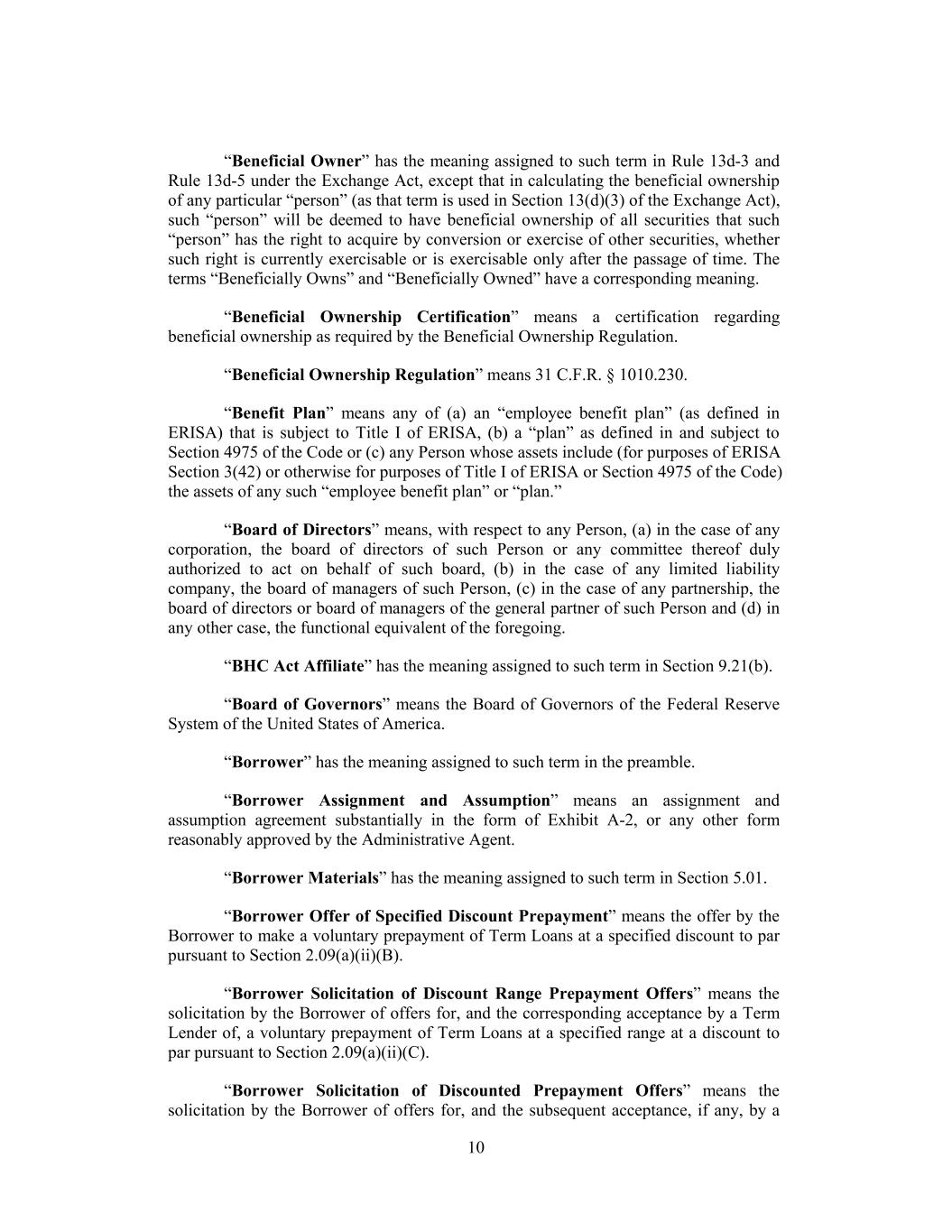 “Beneficial Owner” has the meaning assigned to such term in Rule 13d-3 and Rule 13d-5 under the Exchange Act, except that in calculating the beneficial ownership of any particular “person” (as that term is used in Section 13(d)(3) of the Exchange Act), such “person” will be deemed to have beneficial ownership of all securities that such “person” has the right to acquire by conversion or exercise of other securities, whether such right is currently exercisable or is exercisable only after the passage of time. The terms “Beneficially Owns” and “Beneficially Owned” have a corresponding meaning. “Beneficial Ownership Certification” means a certification regarding beneficial ownership as required by the Beneficial Ownership Regulation. “Beneficial Ownership Regulation” means 31 C.F.R. § 1010.230. “Benefit Plan” means any of (a) an “employee benefit plan” (as defined in ERISA) that is subject to Title I of ERISA, (b) a “plan” as defined in and subject to Section 4975 of the Code or (c) any Person whose assets include (for purposes of ERISA Section 3(42) or otherwise for purposes of Title I of ERISA or Section 4975 of the Code) the assets of any such “employee benefit plan” or “plan.” “Board of Directors” means, with respect to any Person, (a) in the case of any corporation, the board of directors of such Person or any committee thereof duly authorized to act on behalf of such board, (b) in the case of any limited liability company, the board of managers of such Person, (c) in the case of any partnership, the board of directors or board of managers of the general partner of such Person and (d) in any other case, the functional equivalent of the foregoing. “BHC Act Affiliate” has the meaning assigned to such term in Section 9.21(b). “Board of Governors” means the Board of Governors of the Federal Reserve System of the United States of America. “Borrower” has the meaning assigned to such term in the preamble. “Borrower Assignment and Assumption” means an assignment and assumption agreement substantially in the form of Exhibit A-2, or any other form reasonably approved by the Administrative Agent. “Borrower Materials” has the meaning assigned to such term in Section 5.01. “Borrower Offer of Specified Discount Prepayment” means the offer by the Borrower to make a voluntary prepayment of Term Loans at a specified discount to par pursuant to Section 2.09(a)(ii)(B). “Borrower Solicitation of Discount Range Prepayment Offers” means the solicitation by the Borrower of offers for, and the corresponding acceptance by a Term Lender of, a voluntary prepayment of Term Loans at a specified range at a discount to par pursuant to Section 2.09(a)(ii)(C). “Borrower Solicitation of Discounted Prepayment Offers” means the solicitation by the Borrower of offers for, and the subsequent acceptance, if any, by a 10