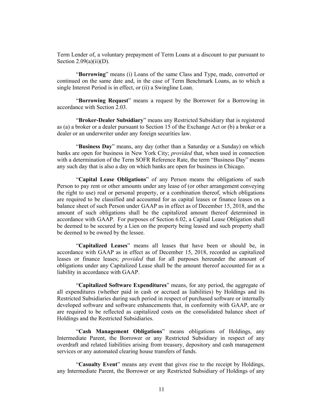 Term Lender of, a voluntary prepayment of Term Loans at a discount to par pursuant to Section 2.09(a)(ii)(D). “Borrowing” means (i) Loans of the same Class and Type, made, converted or continued on the same date and, in the case of Term Benchmark Loans, as to which a single Interest Period is in effect, or (ii) a Swingline Loan. “Borrowing Request” means a request by the Borrower for a Borrowing in accordance with Section 2.03. “Broker-Dealer Subsidiary” means any Restricted Subsidiary that is registered as (a) a broker or a dealer pursuant to Section 15 of the Exchange Act or (b) a broker or a dealer or an underwriter under any foreign securities law. “Business Day” means, any day (other than a Saturday or a Sunday) on which banks are open for business in New York City; provided that, when used in connection with a determination of the Term SOFR Reference Rate, the term “Business Day” means any such day that is also a day on which banks are open for business in Chicago. “Capital Lease Obligations” of any Person means the obligations of such Person to pay rent or other amounts under any lease of (or other arrangement conveying the right to use) real or personal property, or a combination thereof, which obligations are required to be classified and accounted for as capital leases or finance leases on a balance sheet of such Person under GAAP as in effect as of December 15, 2018, and the amount of such obligations shall be the capitalized amount thereof determined in accordance with GAAP. For purposes of Section 6.02, a Capital Lease Obligation shall be deemed to be secured by a Lien on the property being leased and such property shall be deemed to be owned by the lessee. “Capitalized Leases” means all leases that have been or should be, in accordance with GAAP as in effect as of December 15, 2018, recorded as capitalized leases or finance leases; provided that for all purposes hereunder the amount of obligations under any Capitalized Lease shall be the amount thereof accounted for as a liability in accordance with GAAP. “Capitalized Software Expenditures” means, for any period, the aggregate of all expenditures (whether paid in cash or accrued as liabilities) by Holdings and its Restricted Subsidiaries during such period in respect of purchased software or internally developed software and software enhancements that, in conformity with GAAP, are or are required to be reflected as capitalized costs on the consolidated balance sheet of Holdings and the Restricted Subsidiaries. “Cash Management Obligations” means obligations of Holdings, any Intermediate Parent, the Borrower or any Restricted Subsidiary in respect of any overdraft and related liabilities arising from treasury, depository and cash management services or any automated clearing house transfers of funds. “Casualty Event” means any event that gives rise to the receipt by Holdings, any Intermediate Parent, the Borrower or any Restricted Subsidiary of Holdings of any 11