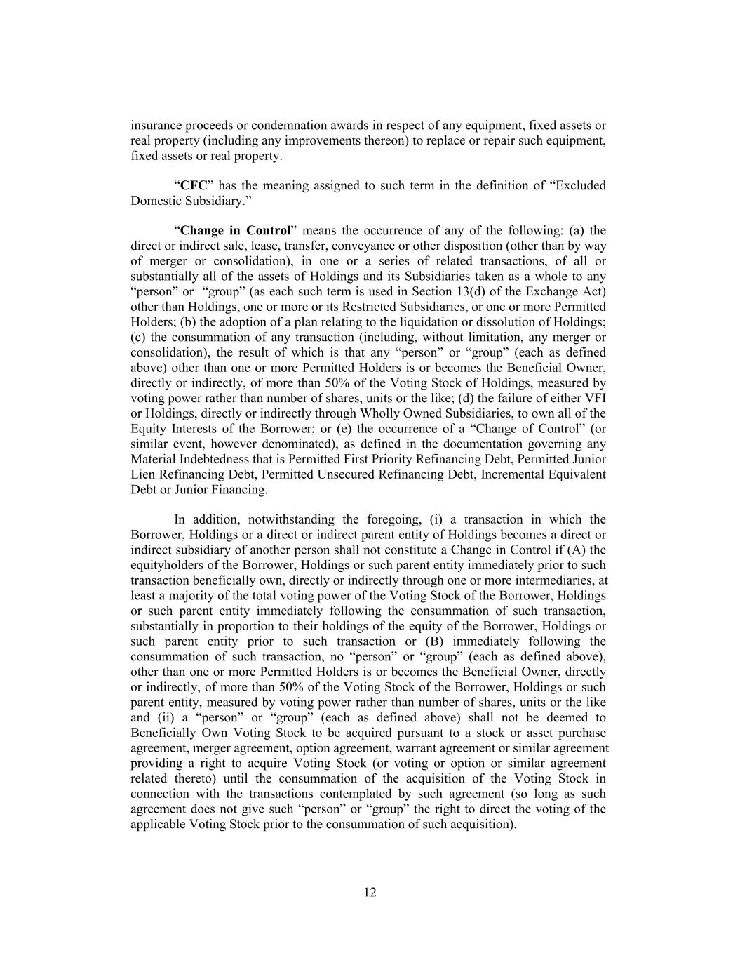 insurance proceeds or condemnation awards in respect of any equipment, fixed assets or real property (including any improvements thereon) to replace or repair such equipment, fixed assets or real property. “CFC” has the meaning assigned to such term in the definition of “Excluded Domestic Subsidiary.” “Change in Control” means the occurrence of any of the following: (a) the direct or indirect sale, lease, transfer, conveyance or other disposition (other than by way of merger or consolidation), in one or a series of related transactions, of all or substantially all of the assets of Holdings and its Subsidiaries taken as a whole to any “person” or “group” (as each such term is used in Section 13(d) of the Exchange Act) other than Holdings, one or more or its Restricted Subsidiaries, or one or more Permitted Holders; (b) the adoption of a plan relating to the liquidation or dissolution of Holdings; (c) the consummation of any transaction (including, without limitation, any merger or consolidation), the result of which is that any “person” or “group” (each as defined above) other than one or more Permitted Holders is or becomes the Beneficial Owner, directly or indirectly, of more than 50% of the Voting Stock of Holdings, measured by voting power rather than number of shares, units or the like; (d) the failure of either VFI or Holdings, directly or indirectly through Wholly Owned Subsidiaries, to own all of the Equity Interests of the Borrower; or (e) the occurrence of a “Change of Control” (or similar event, however denominated), as defined in the documentation governing any Material Indebtedness that is Permitted First Priority Refinancing Debt, Permitted Junior Lien Refinancing Debt, Permitted Unsecured Refinancing Debt, Incremental Equivalent Debt or Junior Financing. In addition, notwithstanding the foregoing, (i) a transaction in which the Borrower, Holdings or a direct or indirect parent entity of Holdings becomes a direct or indirect subsidiary of another person shall not constitute a Change in Control if (A) the equityholders of the Borrower, Holdings or such parent entity immediately prior to such transaction beneficially own, directly or indirectly through one or more intermediaries, at least a majority of the total voting power of the Voting Stock of the Borrower, Holdings or such parent entity immediately following the consummation of such transaction, substantially in proportion to their holdings of the equity of the Borrower, Holdings or such parent entity prior to such transaction or (B) immediately following the consummation of such transaction, no “person” or “group” (each as defined above), other than one or more Permitted Holders is or becomes the Beneficial Owner, directly or indirectly, of more than 50% of the Voting Stock of the Borrower, Holdings or such parent entity, measured by voting power rather than number of shares, units or the like and (ii) a “person” or “group” (each as defined above) shall not be deemed to Beneficially Own Voting Stock to be acquired pursuant to a stock or asset purchase agreement, merger agreement, option agreement, warrant agreement or similar agreement providing a right to acquire Voting Stock (or voting or option or similar agreement related thereto) until the consummation of the acquisition of the Voting Stock in connection with the transactions contemplated by such agreement (so long as such agreement does not give such “person” or “group” the right to direct the voting of the applicable Voting Stock prior to the consummation of such acquisition). 12