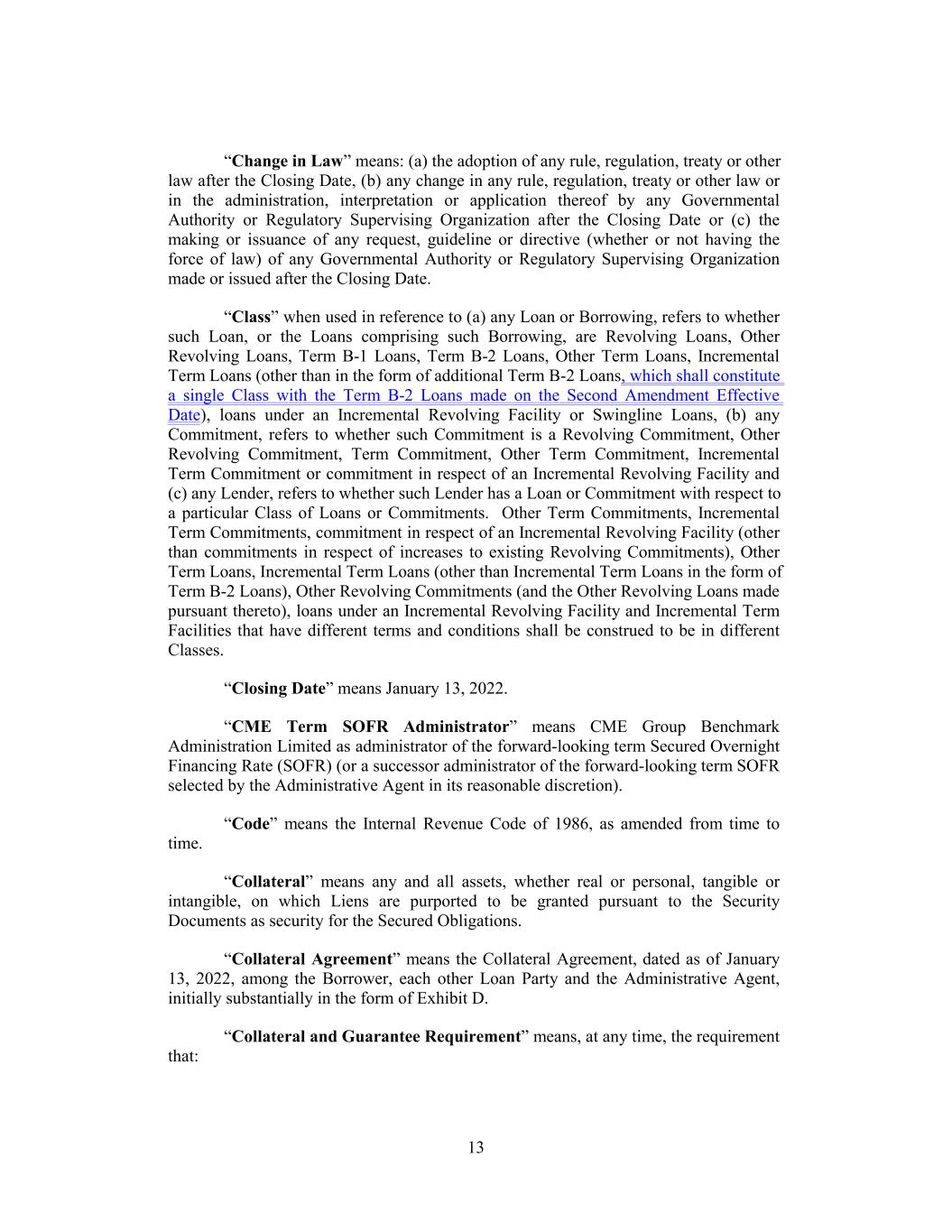 “Change in Law” means: (a) the adoption of any rule, regulation, treaty or other law after the Closing Date, (b) any change in any rule, regulation, treaty or other law or in the administration, interpretation or application thereof by any Governmental Authority or Regulatory Supervising Organization after the Closing Date or (c) the making or issuance of any request, guideline or directive (whether or not having the force of law) of any Governmental Authority or Regulatory Supervising Organization made or issued after the Closing Date. “Class” when used in reference to (a) any Loan or Borrowing, refers to whether such Loan, or the Loans comprising such Borrowing, are Revolving Loans, Other Revolving Loans, Term B-1 Loans, Term B-2 Loans, Other Term Loans, Incremental Term Loans (other than in the form of additional Term B-2 Loans, which shall constitute a single Class with the Term B-2 Loans made on the Second Amendment Effective Date), loans under an Incremental Revolving Facility or Swingline Loans, (b) any Commitment, refers to whether such Commitment is a Revolving Commitment, Other Revolving Commitment, Term Commitment, Other Term Commitment, Incremental Term Commitment or commitment in respect of an Incremental Revolving Facility and (c) any Lender, refers to whether such Lender has a Loan or Commitment with respect to a particular Class of Loans or Commitments. Other Term Commitments, Incremental Term Commitments, commitment in respect of an Incremental Revolving Facility (other than commitments in respect of increases to existing Revolving Commitments), Other Term Loans, Incremental Term Loans (other than Incremental Term Loans in the form of Term B-2 Loans), Other Revolving Commitments (and the Other Revolving Loans made pursuant thereto), loans under an Incremental Revolving Facility and Incremental Term Facilities that have different terms and conditions shall be construed to be in different Classes. “Closing Date” means January 13, 2022. “CME Term SOFR Administrator” means CME Group Benchmark Administration Limited as administrator of the forward-looking term Secured Overnight Financing Rate (SOFR) (or a successor administrator of the forward-looking term SOFR selected by the Administrative Agent in its reasonable discretion). “Code” means the Internal Revenue Code of 1986, as amended from time to time. “Collateral” means any and all assets, whether real or personal, tangible or intangible, on which Liens are purported to be granted pursuant to the Security Documents as security for the Secured Obligations. “Collateral Agreement” means the Collateral Agreement, dated as of January 13, 2022, among the Borrower, each other Loan Party and the Administrative Agent, initially substantially in the form of Exhibit D. “Collateral and Guarantee Requirement” means, at any time, the requirement that: 13