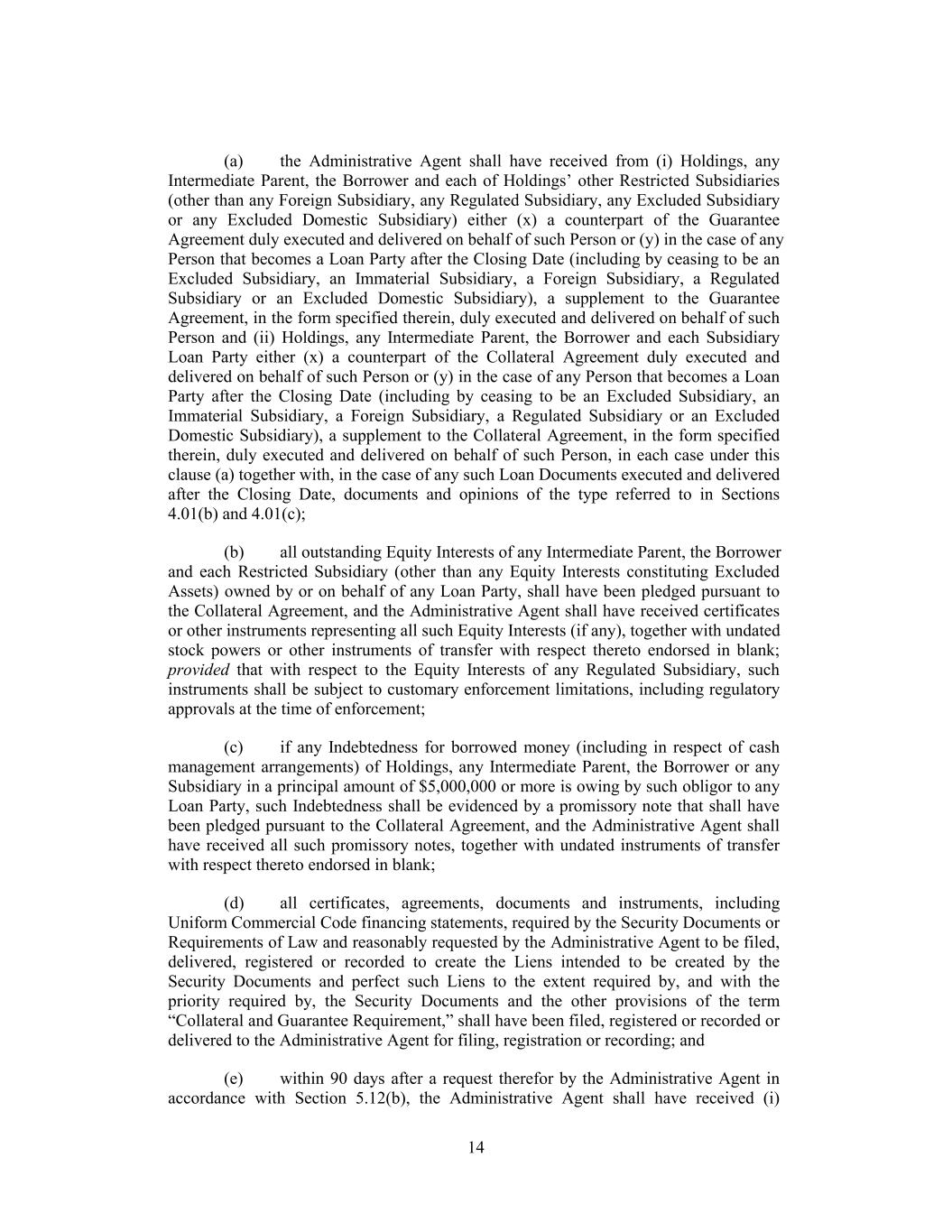(a) the Administrative Agent shall have received from (i) Holdings, any Intermediate Parent, the Borrower and each of Holdings’ other Restricted Subsidiaries (other than any Foreign Subsidiary, any Regulated Subsidiary, any Excluded Subsidiary or any Excluded Domestic Subsidiary) either (x) a counterpart of the Guarantee Agreement duly executed and delivered on behalf of such Person or (y) in the case of any Person that becomes a Loan Party after the Closing Date (including by ceasing to be an Excluded Subsidiary, an Immaterial Subsidiary, a Foreign Subsidiary, a Regulated Subsidiary or an Excluded Domestic Subsidiary), a supplement to the Guarantee Agreement, in the form specified therein, duly executed and delivered on behalf of such Person and (ii) Holdings, any Intermediate Parent, the Borrower and each Subsidiary Loan Party either (x) a counterpart of the Collateral Agreement duly executed and delivered on behalf of such Person or (y) in the case of any Person that becomes a Loan Party after the Closing Date (including by ceasing to be an Excluded Subsidiary, an Immaterial Subsidiary, a Foreign Subsidiary, a Regulated Subsidiary or an Excluded Domestic Subsidiary), a supplement to the Collateral Agreement, in the form specified therein, duly executed and delivered on behalf of such Person, in each case under this clause (a) together with, in the case of any such Loan Documents executed and delivered after the Closing Date, documents and opinions of the type referred to in Sections 4.01(b) and 4.01(c); (b) all outstanding Equity Interests of any Intermediate Parent, the Borrower and each Restricted Subsidiary (other than any Equity Interests constituting Excluded Assets) owned by or on behalf of any Loan Party, shall have been pledged pursuant to the Collateral Agreement, and the Administrative Agent shall have received certificates or other instruments representing all such Equity Interests (if any), together with undated stock powers or other instruments of transfer with respect thereto endorsed in blank; provided that with respect to the Equity Interests of any Regulated Subsidiary, such instruments shall be subject to customary enforcement limitations, including regulatory approvals at the time of enforcement; (c) if any Indebtedness for borrowed money (including in respect of cash management arrangements) of Holdings, any Intermediate Parent, the Borrower or any Subsidiary in a principal amount of $5,000,000 or more is owing by such obligor to any Loan Party, such Indebtedness shall be evidenced by a promissory note that shall have been pledged pursuant to the Collateral Agreement, and the Administrative Agent shall have received all such promissory notes, together with undated instruments of transfer with respect thereto endorsed in blank; (d) all certificates, agreements, documents and instruments, including Uniform Commercial Code financing statements, required by the Security Documents or Requirements of Law and reasonably requested by the Administrative Agent to be filed, delivered, registered or recorded to create the Liens intended to be created by the Security Documents and perfect such Liens to the extent required by, and with the priority required by, the Security Documents and the other provisions of the term “Collateral and Guarantee Requirement,” shall have been filed, registered or recorded or delivered to the Administrative Agent for filing, registration or recording; and (e) within 90 days after a request therefor by the Administrative Agent in accordance with Section 5.12(b), the Administrative Agent shall have received (i) 14