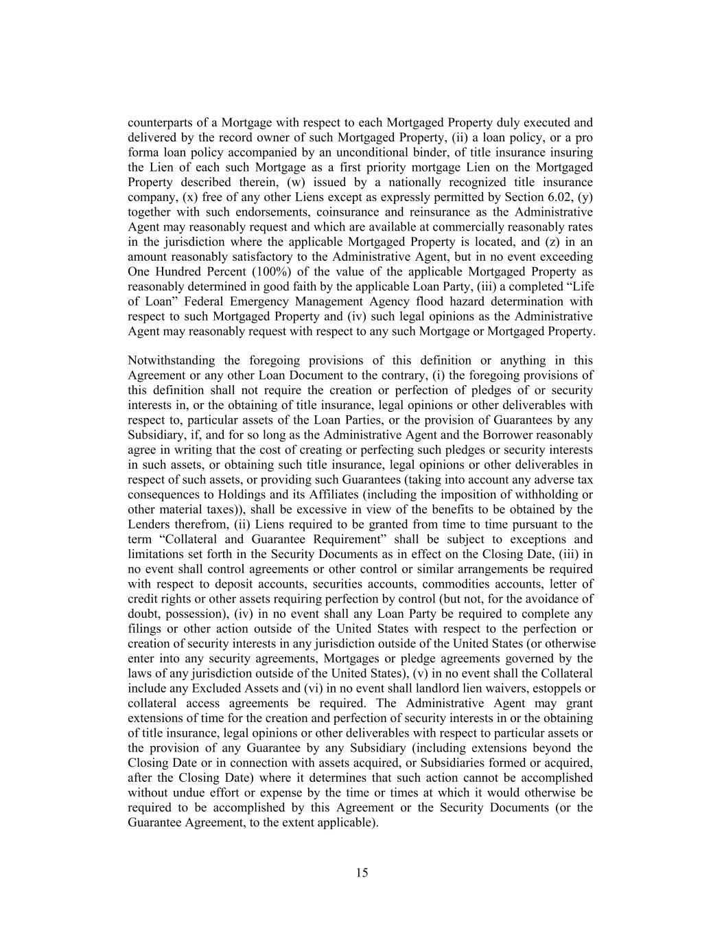 counterparts of a Mortgage with respect to each Mortgaged Property duly executed and delivered by the record owner of such Mortgaged Property, (ii) a loan policy, or a pro forma loan policy accompanied by an unconditional binder, of title insurance insuring the Lien of each such Mortgage as a first priority mortgage Lien on the Mortgaged Property described therein, (w) issued by a nationally recognized title insurance company, (x) free of any other Liens except as expressly permitted by Section 6.02, (y) together with such endorsements, coinsurance and reinsurance as the Administrative Agent may reasonably request and which are available at commercially reasonably rates in the jurisdiction where the applicable Mortgaged Property is located, and (z) in an amount reasonably satisfactory to the Administrative Agent, but in no event exceeding One Hundred Percent (100%) of the value of the applicable Mortgaged Property as reasonably determined in good faith by the applicable Loan Party, (iii) a completed “Life of Loan” Federal Emergency Management Agency flood hazard determination with respect to such Mortgaged Property and (iv) such legal opinions as the Administrative Agent may reasonably request with respect to any such Mortgage or Mortgaged Property. Notwithstanding the foregoing provisions of this definition or anything in this Agreement or any other Loan Document to the contrary, (i) the foregoing provisions of this definition shall not require the creation or perfection of pledges of or security interests in, or the obtaining of title insurance, legal opinions or other deliverables with respect to, particular assets of the Loan Parties, or the provision of Guarantees by any Subsidiary, if, and for so long as the Administrative Agent and the Borrower reasonably agree in writing that the cost of creating or perfecting such pledges or security interests in such assets, or obtaining such title insurance, legal opinions or other deliverables in respect of such assets, or providing such Guarantees (taking into account any adverse tax consequences to Holdings and its Affiliates (including the imposition of withholding or other material taxes)), shall be excessive in view of the benefits to be obtained by the Lenders therefrom, (ii) Liens required to be granted from time to time pursuant to the term “Collateral and Guarantee Requirement” shall be subject to exceptions and limitations set forth in the Security Documents as in effect on the Closing Date, (iii) in no event shall control agreements or other control or similar arrangements be required with respect to deposit accounts, securities accounts, commodities accounts, letter of credit rights or other assets requiring perfection by control (but not, for the avoidance of doubt, possession), (iv) in no event shall any Loan Party be required to complete any filings or other action outside of the United States with respect to the perfection or creation of security interests in any jurisdiction outside of the United States (or otherwise enter into any security agreements, Mortgages or pledge agreements governed by the laws of any jurisdiction outside of the United States), (v) in no event shall the Collateral include any Excluded Assets and (vi) in no event shall landlord lien waivers, estoppels or collateral access agreements be required. The Administrative Agent may grant extensions of time for the creation and perfection of security interests in or the obtaining of title insurance, legal opinions or other deliverables with respect to particular assets or the provision of any Guarantee by any Subsidiary (including extensions beyond the Closing Date or in connection with assets acquired, or Subsidiaries formed or acquired, after the Closing Date) where it determines that such action cannot be accomplished without undue effort or expense by the time or times at which it would otherwise be required to be accomplished by this Agreement or the Security Documents (or the Guarantee Agreement, to the extent applicable). 15